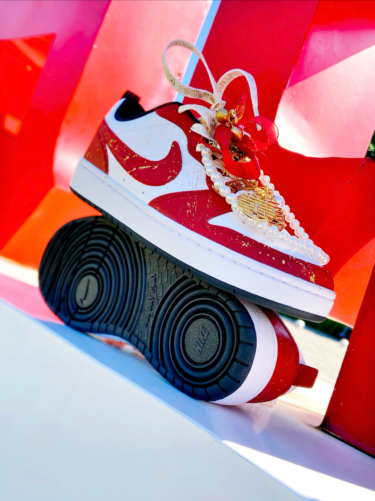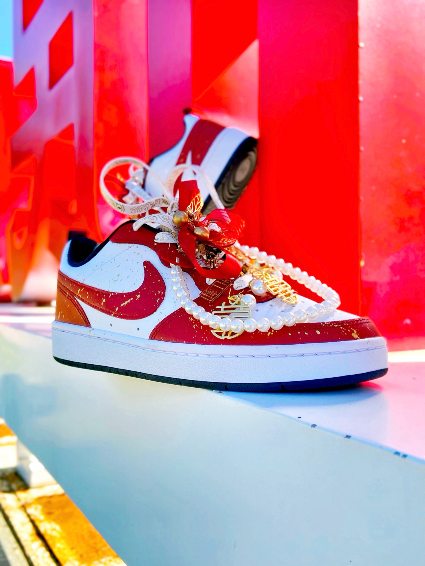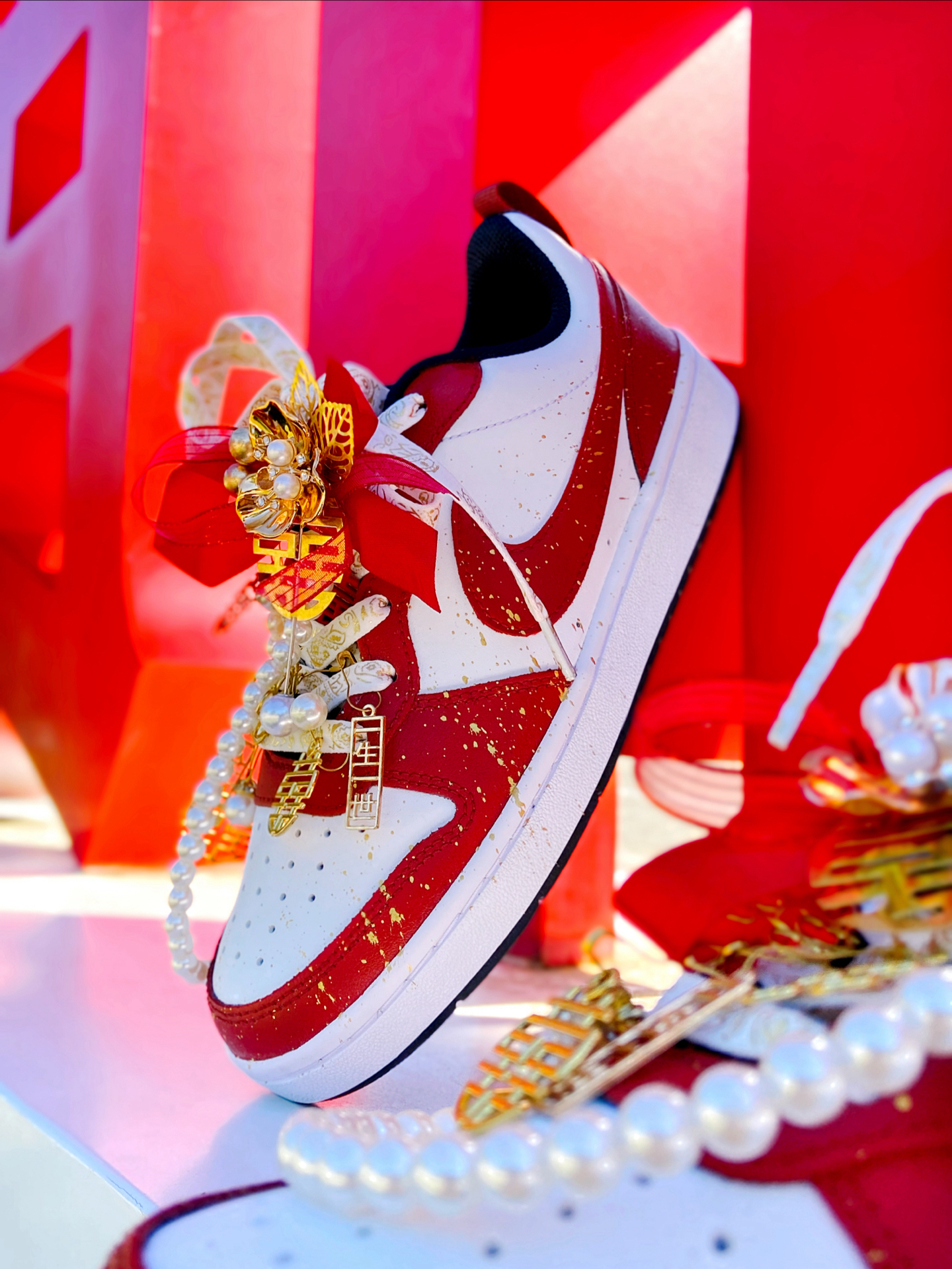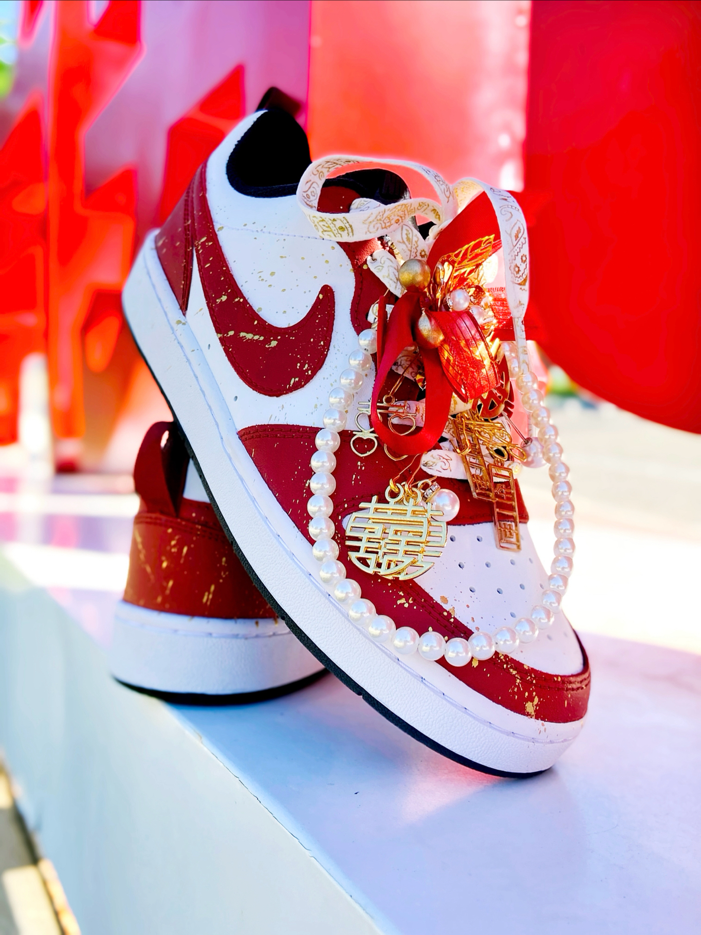 这双定制的 #Nike Court Borough Low 2 我觉得颜值真的好看!鞋身红白的主色调点缀着金箔细节,红色特别正,配秀禾别提多喜庆了~ 鞋上挂着珍珠链、“囍” 字,还有 “一生一世”的金属挂件,细节里全是仪式感~,结婚婚鞋穿这双蛮不错的,日常也可以把挂件拿掉了穿,简直就是一鞋两用了,搭配休闲裤、牛仔裤都挺好看的。 穿着就是板鞋的脚感,还行,久穿也不觉得累 ~尺码按正常选就行了 ...