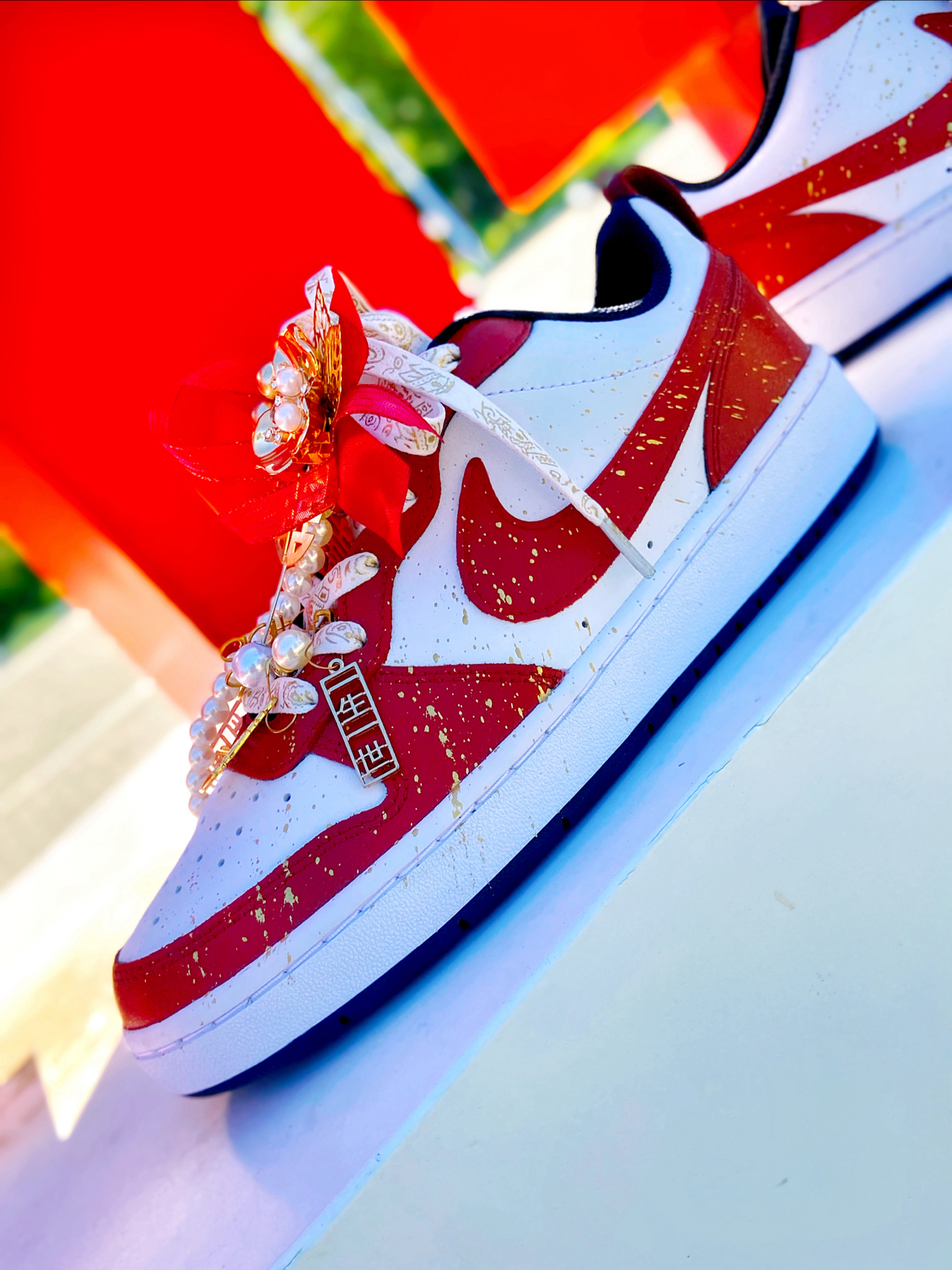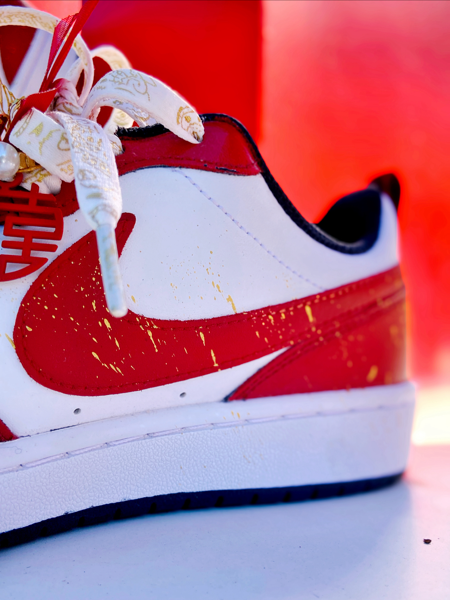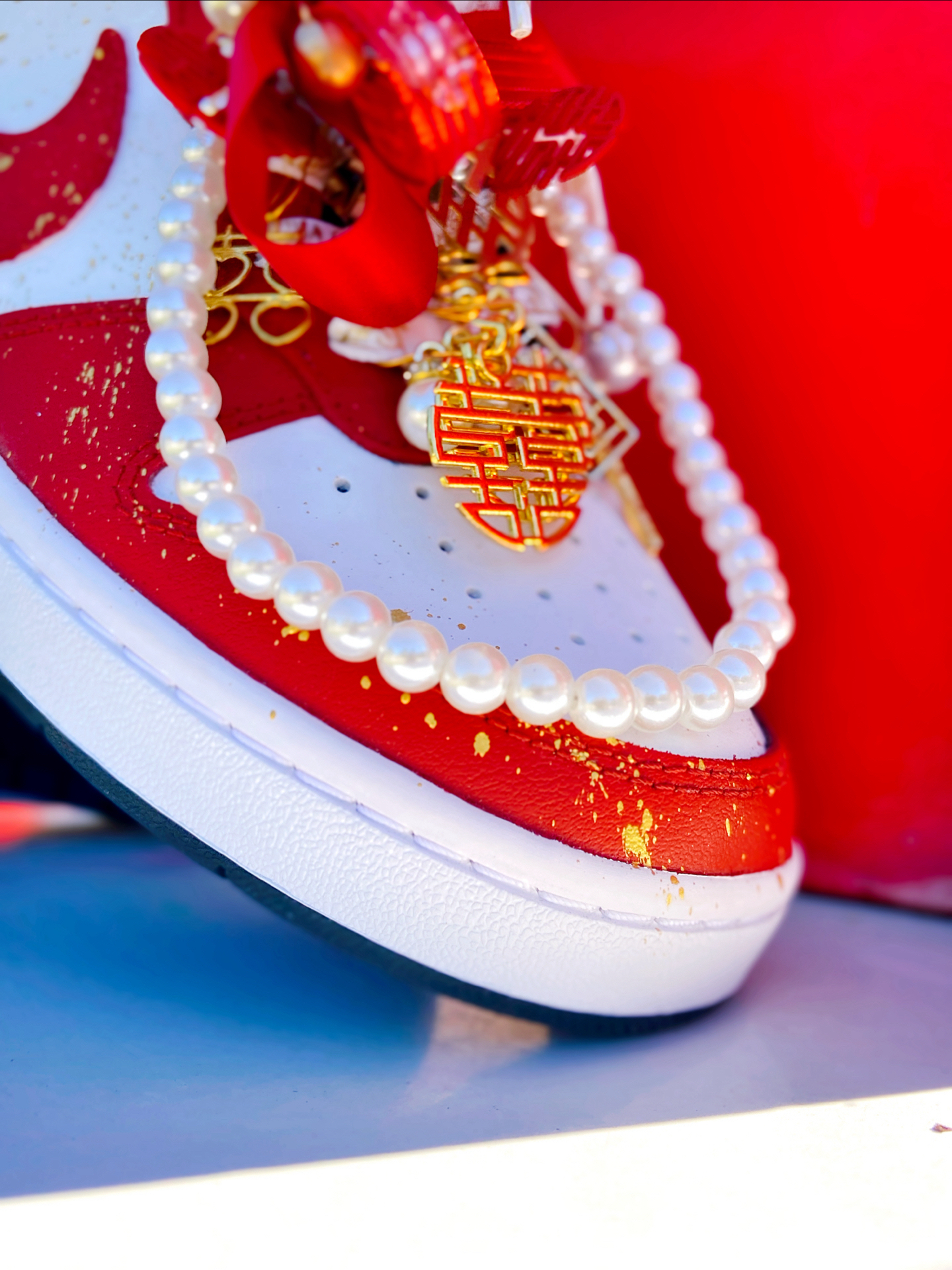 这双定制的 #Nike Court Borough Low 2 我觉得颜值真的好看!鞋身红白的主色调点缀着金箔细节,红色特别正,配秀禾别提多喜庆了~ 鞋上挂着珍珠链、“囍” 字,还有 “一生一世”的金属挂件,细节里全是仪式感~,结婚婚鞋穿这双蛮不错的,日常也可以把挂件拿掉了穿,简直就是一鞋两用了,搭配休闲裤、牛仔裤都挺好看的。 穿着就是板鞋的脚感,还行,久穿也不觉得累 ~尺码按正常选就行了 ...