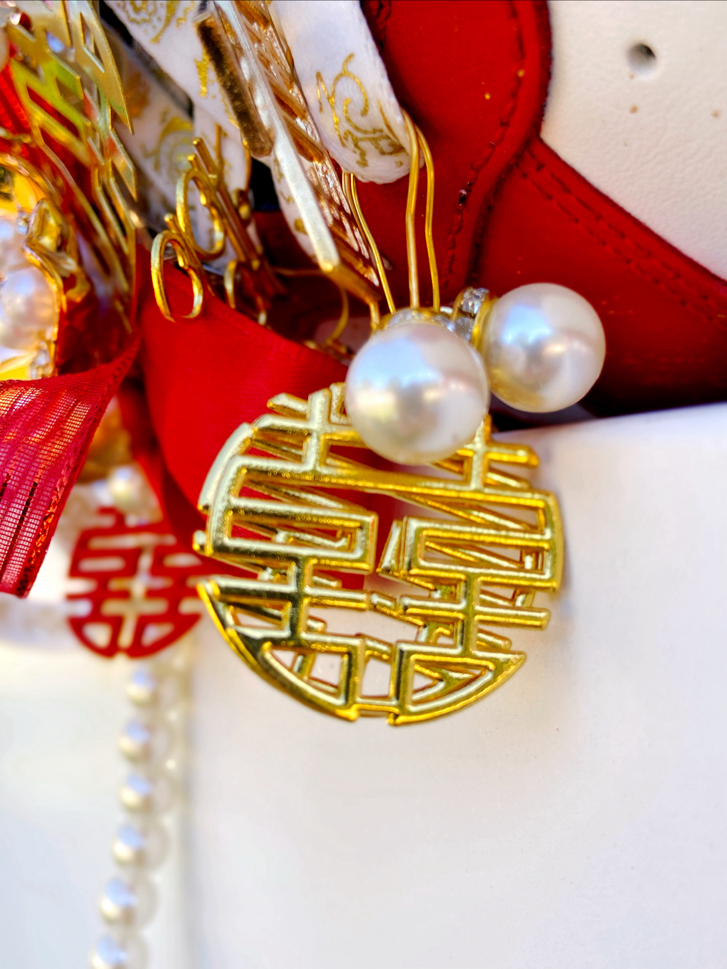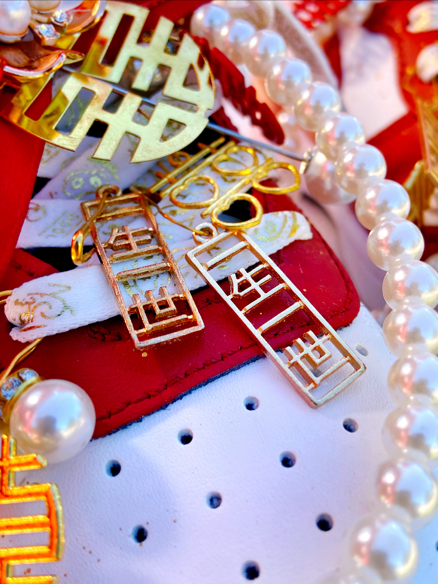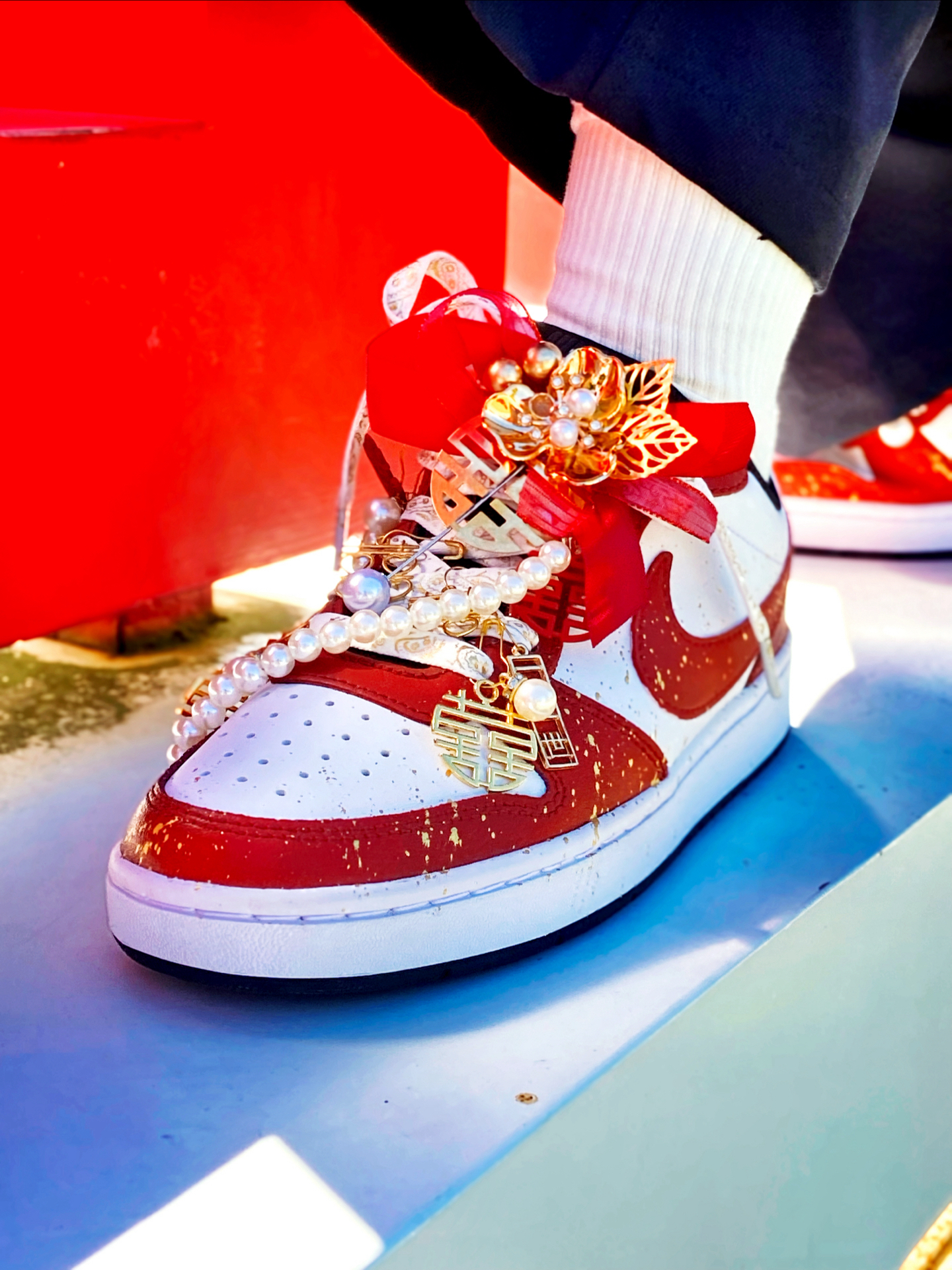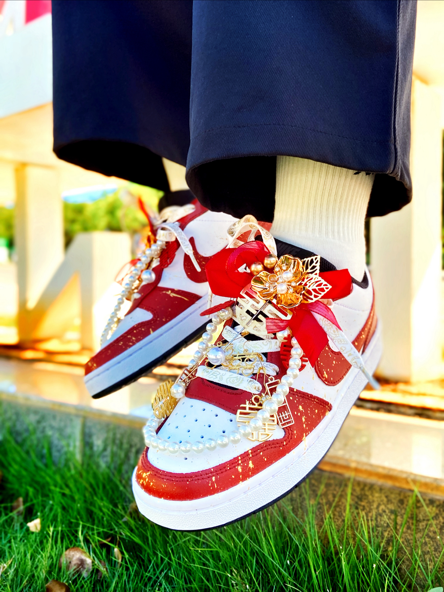 这双定制的 #Nike Court Borough Low 2 我觉得颜值真的好看!鞋身红白的主色调点缀着金箔细节,红色特别正,配秀禾别提多喜庆了~ 鞋上挂着珍珠链、“囍” 字,还有 “一生一世”的金属挂件,细节里全是仪式感~,结婚婚鞋穿这双蛮不错的,日常也可以把挂件拿掉了穿,简直就是一鞋两用了,搭配休闲裤、牛仔裤都挺好看的。 穿着就是板鞋的脚感,还行,久穿也不觉得累 ~尺码按正常选就行了 ...