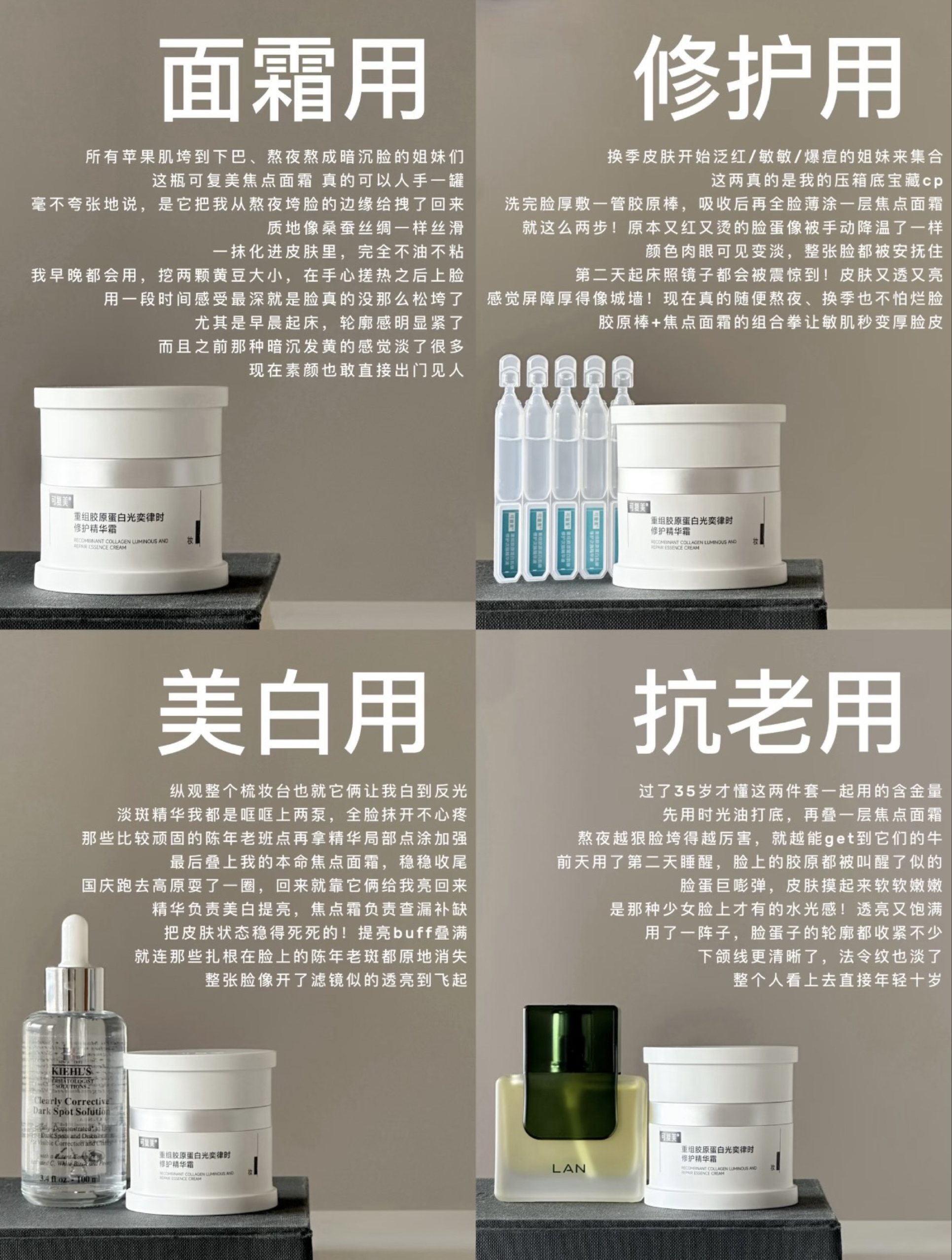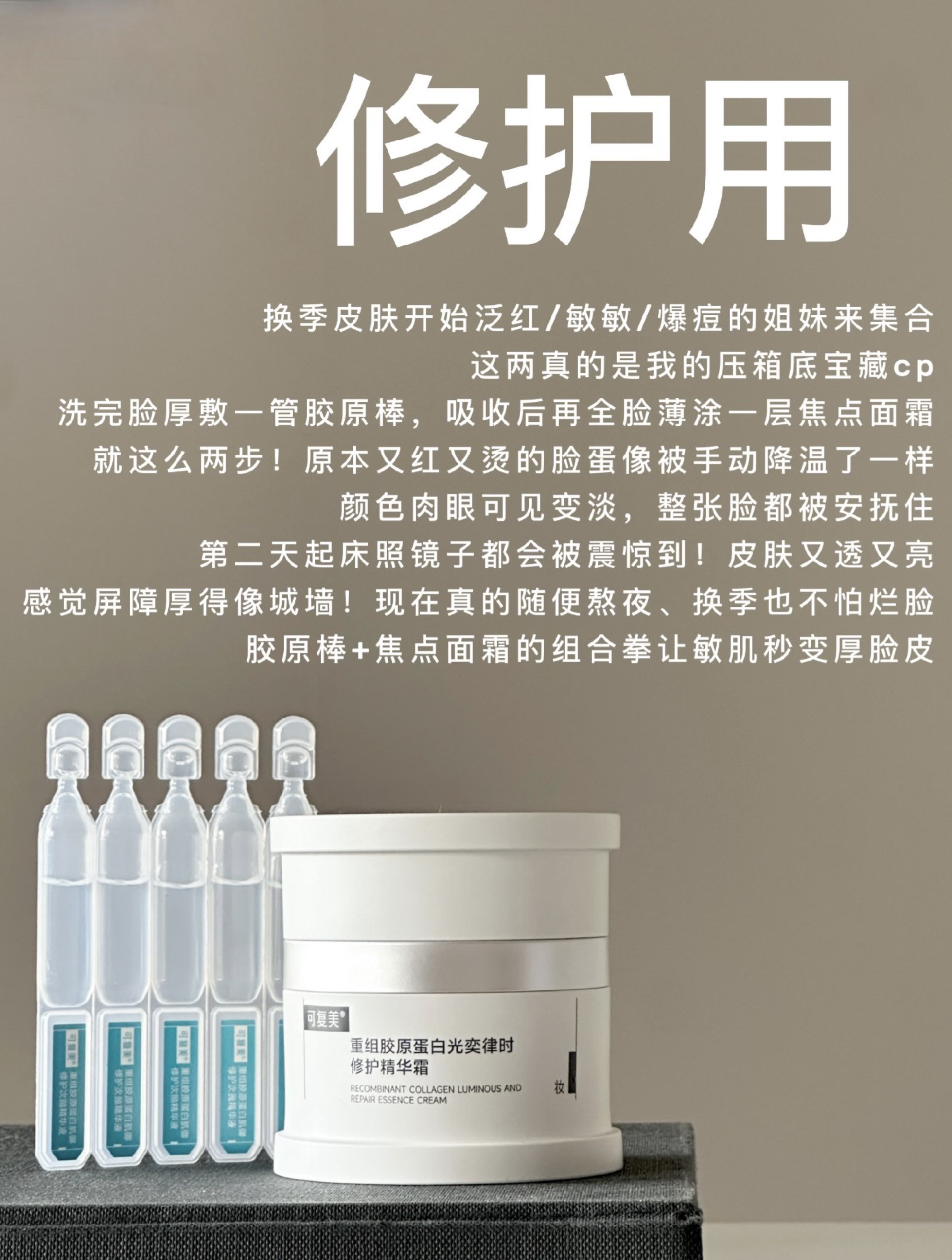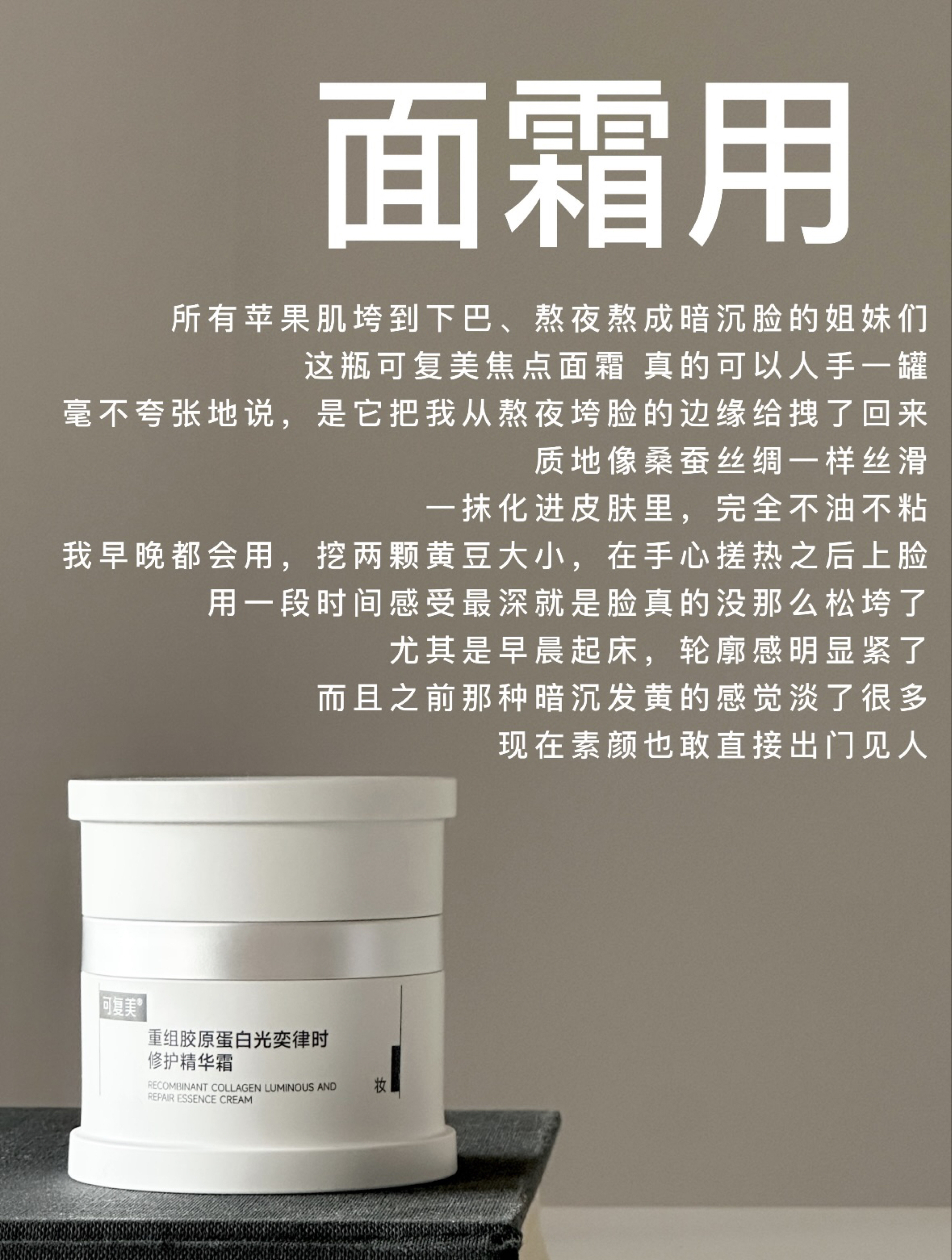 一、单用焦点面霜:熬夜垮脸急救官 蚕丝般丝滑质地,一抹化肤不油不粘,重组胶原蛋白直击松垮暗沉。早晚用两颗黄豆大小,手心搓热上脸——苹果肌提升、下颌线收紧效果惊艳,熬夜后肤色依然透亮。 适合肤质:所有肤质(尤其25+熬夜肌、暗沉松弛脸) ------ 二、搭配胶原棒:敏肌退红盾牌组 换季泛红时,厚敷胶原棒+薄涂面霜,10分钟红烫感消退。连续用3天,屏障修护如“砌墙”,爆痘风险大降,皮肤稳到能扛住熬...