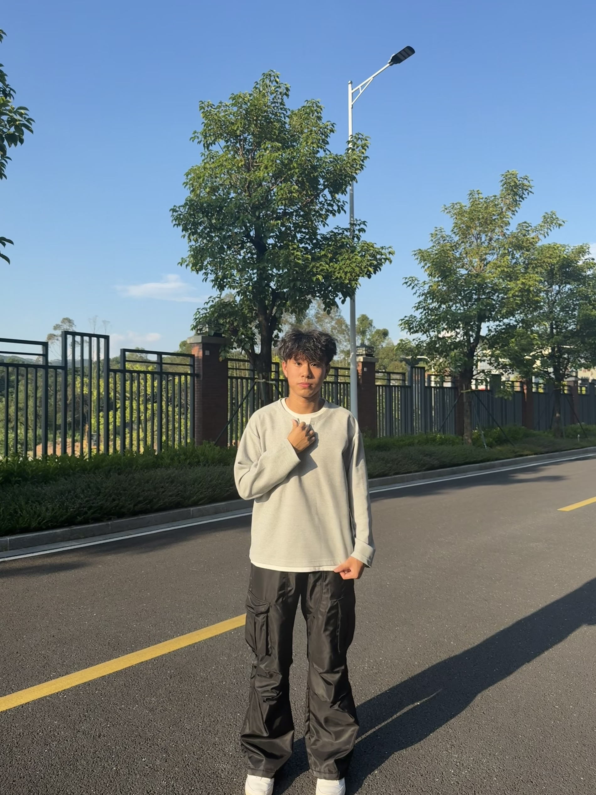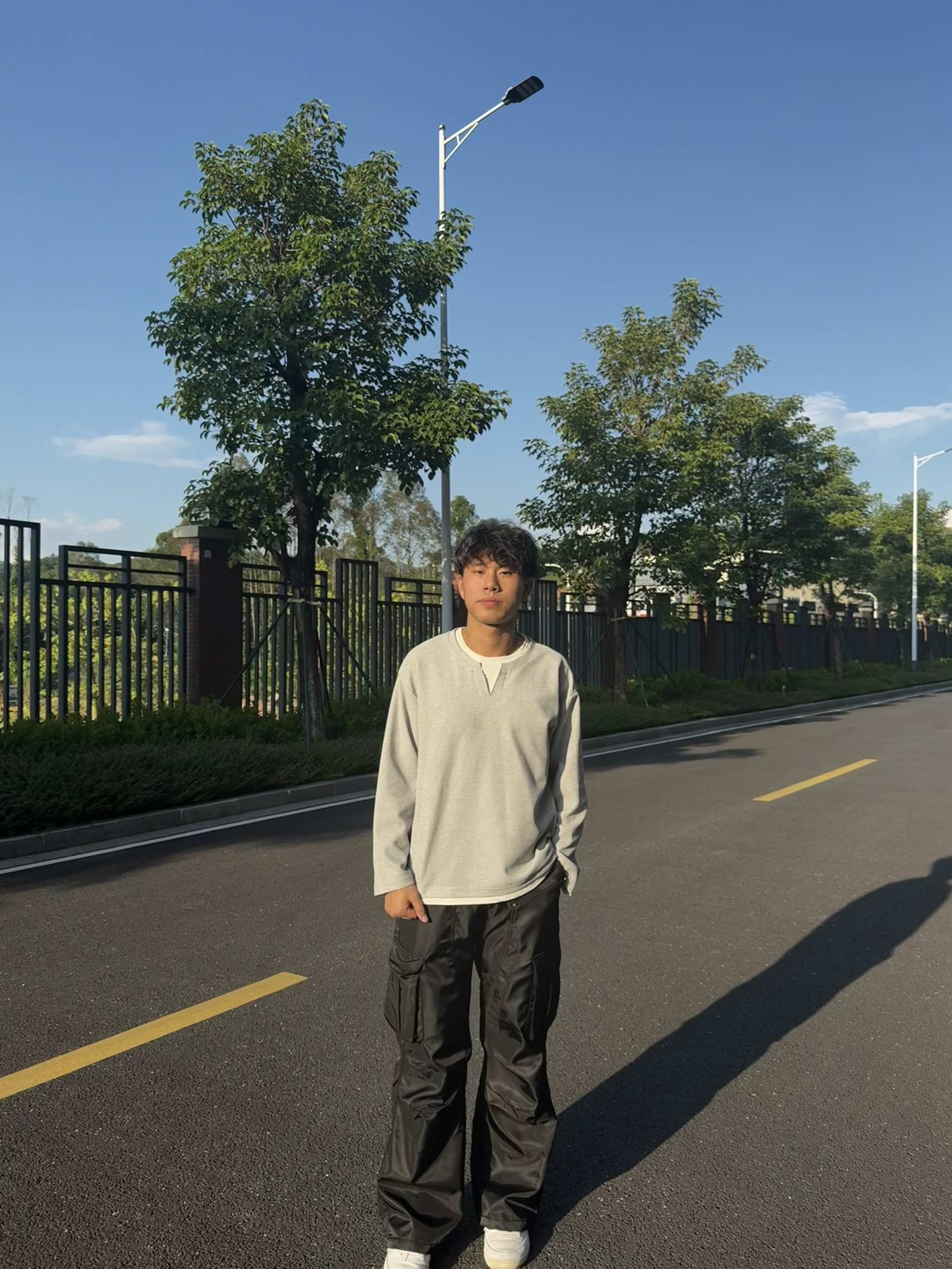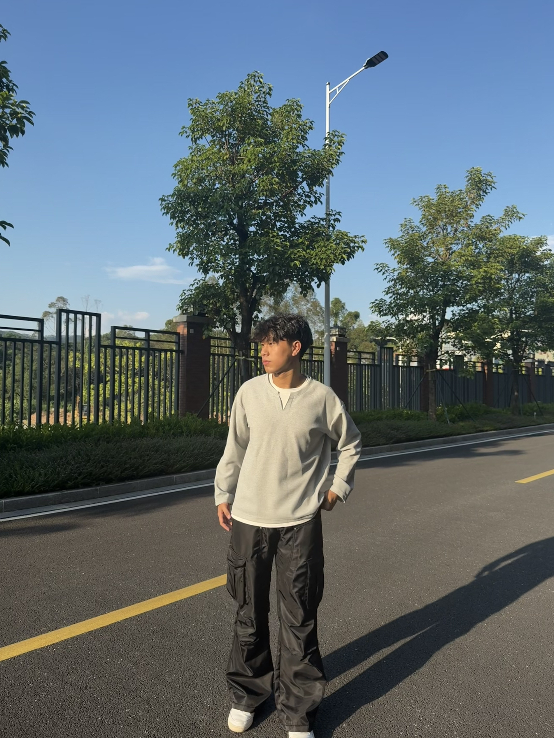 享受每一天的生活 这套穿搭走的是简约休闲与街头潮流结合的风格:浅灰色圆领卫衣简约百搭,宽松版型营造随性氛围;黑色多口袋工装裤是亮点,立体口袋设计充满街头感,阔腿剪裁修饰腿型且增添复古腔调;白色休闲鞋清爽干净,平衡整体色调。