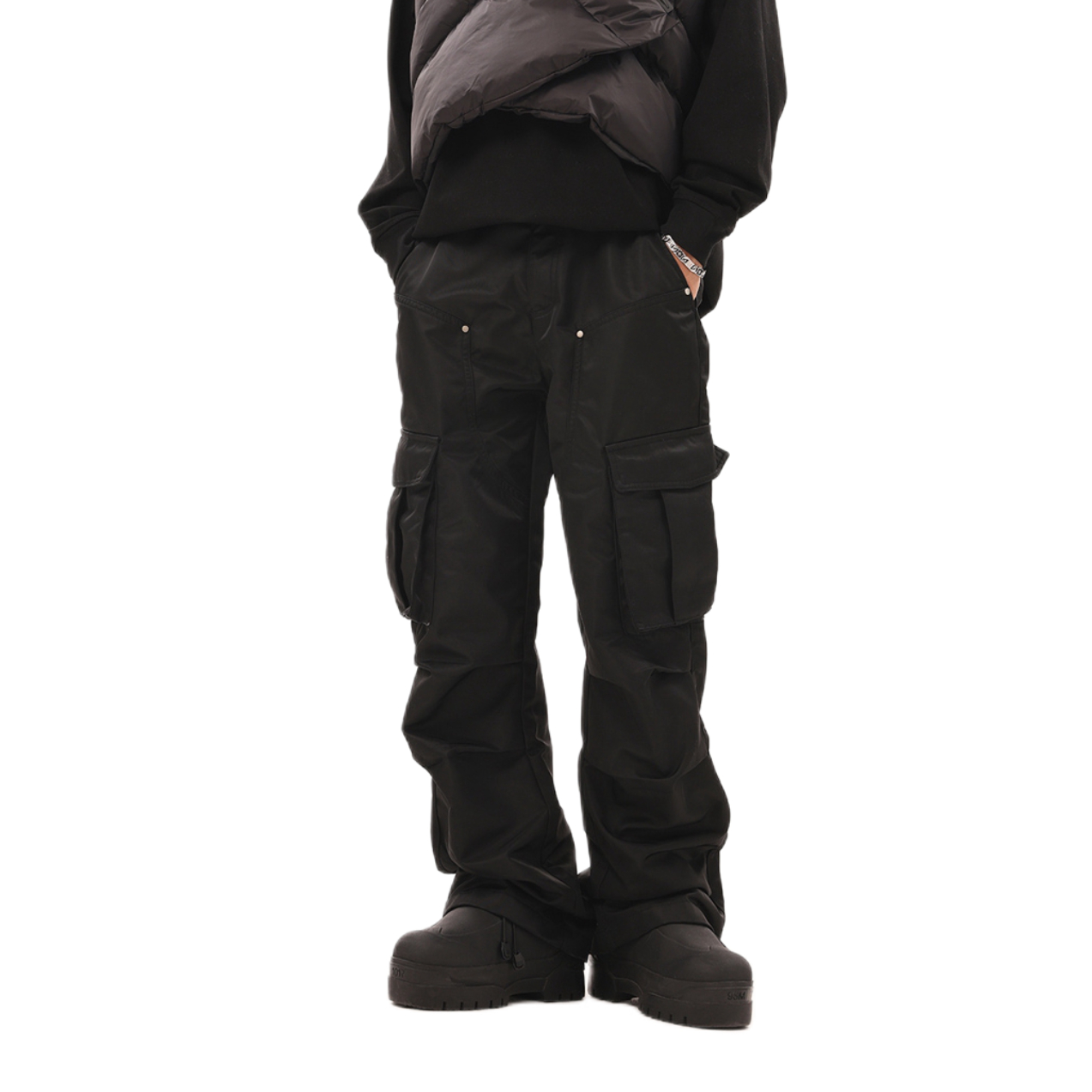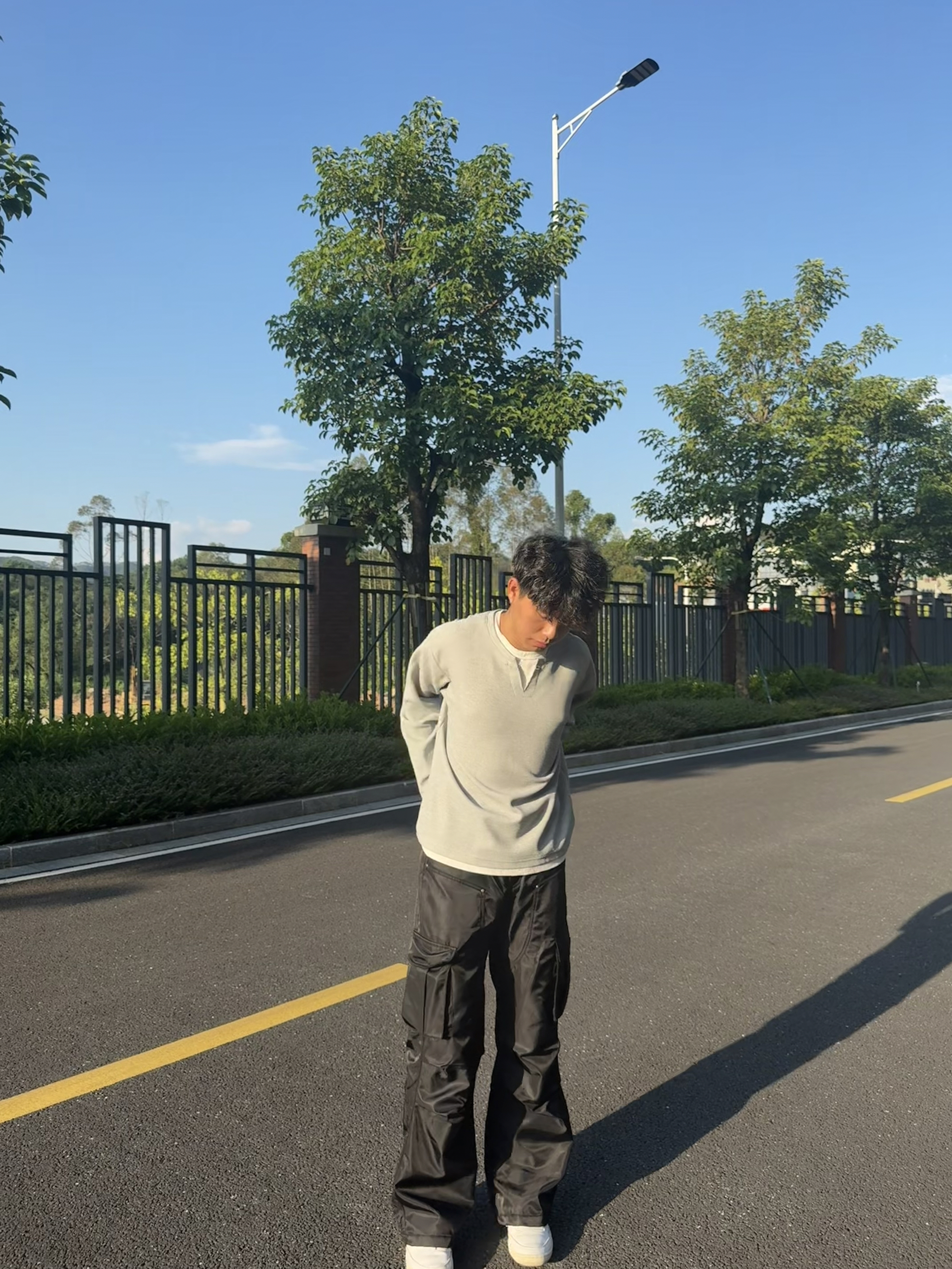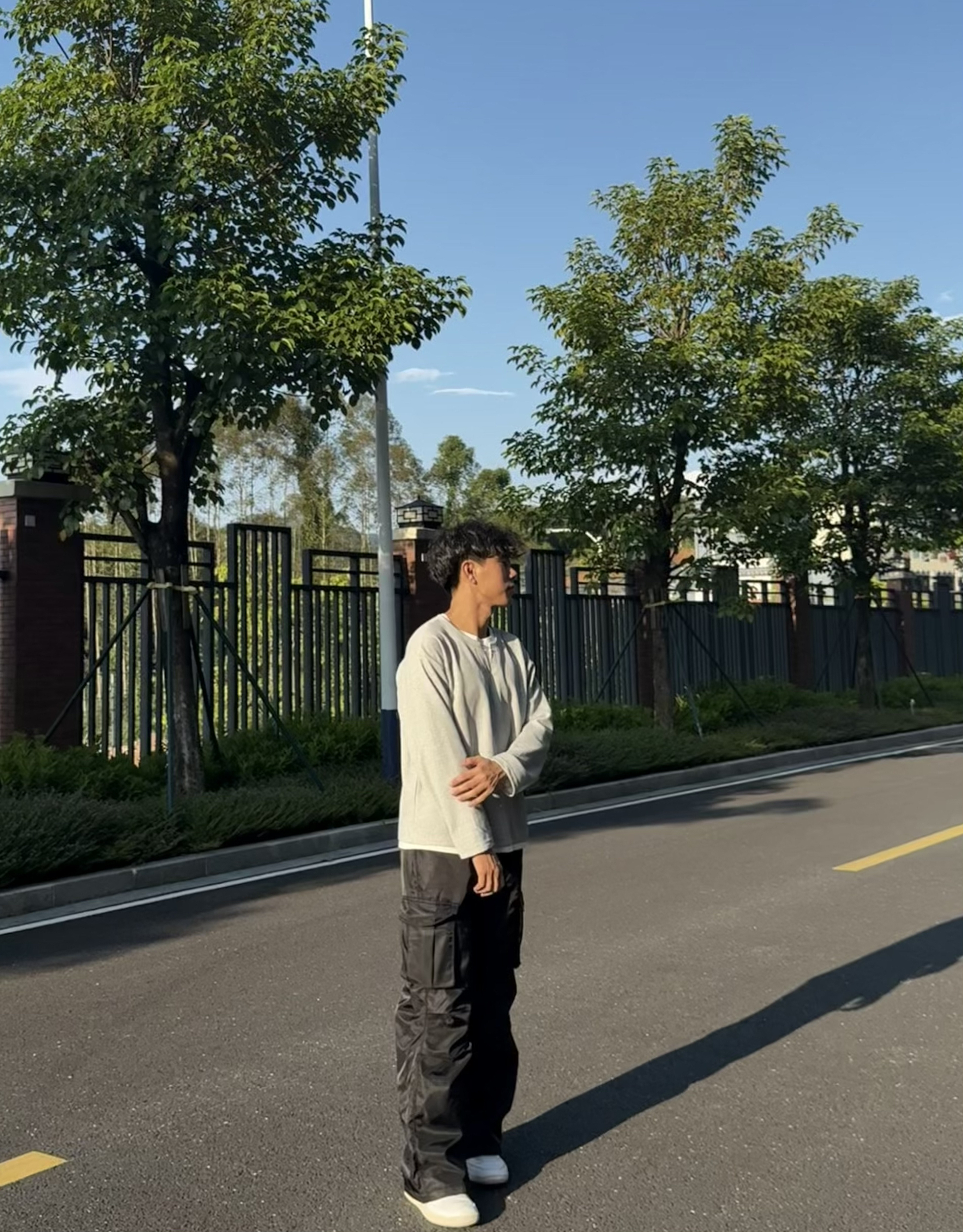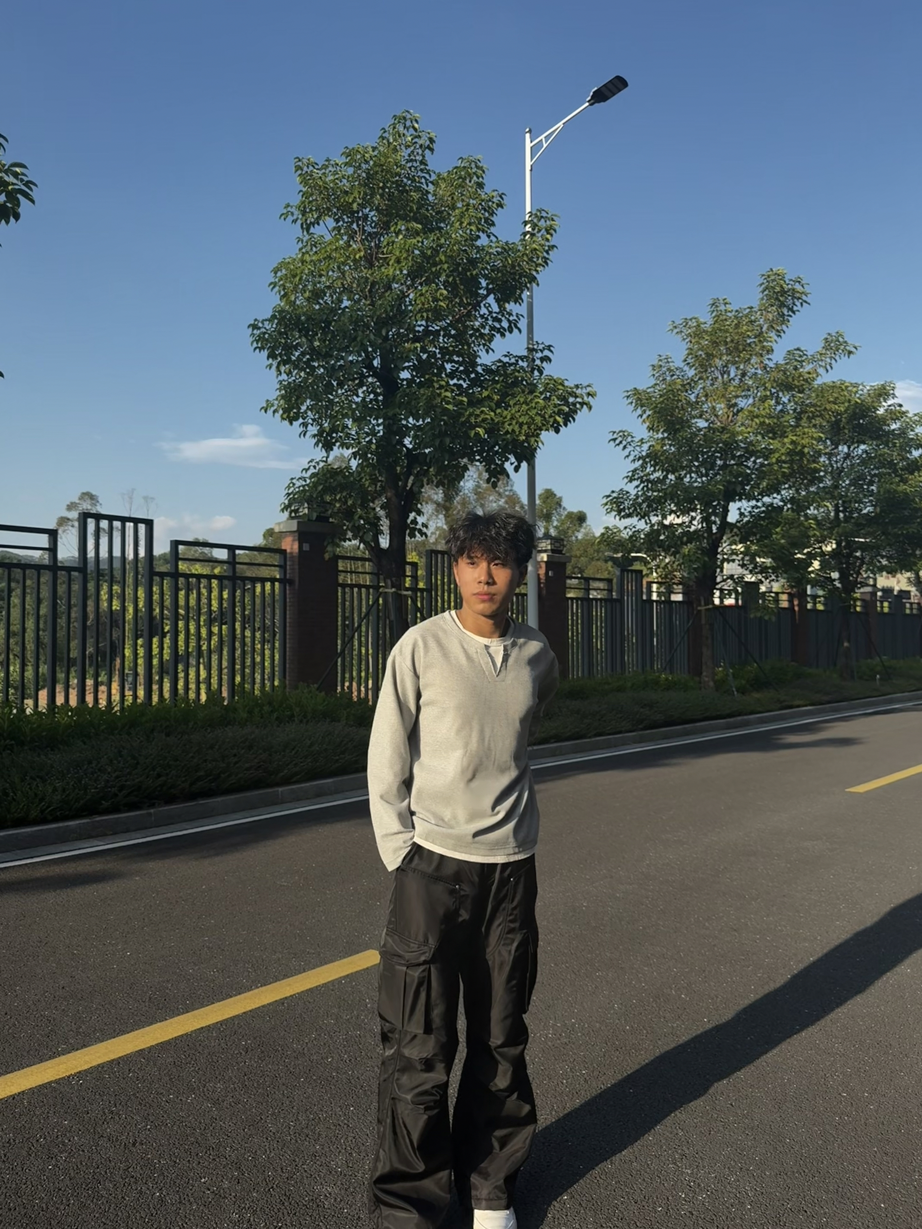 享受每一天的生活 这套穿搭走的是简约休闲与街头潮流结合的风格:浅灰色圆领卫衣简约百搭,宽松版型营造随性氛围;黑色多口袋工装裤是亮点,立体口袋设计充满街头感,阔腿剪裁修饰腿型且增添复古腔调;白色休闲鞋清爽干净,平衡整体色调。
