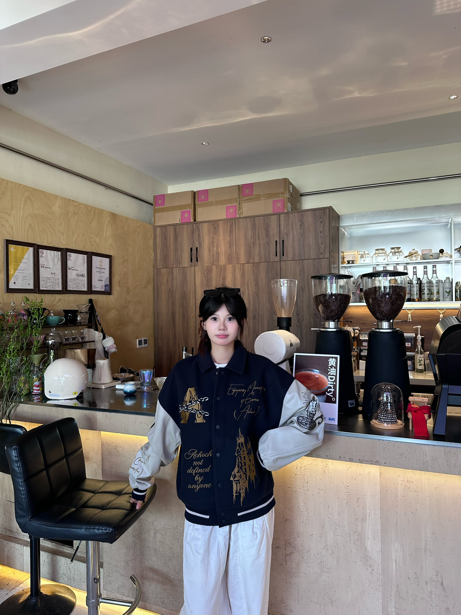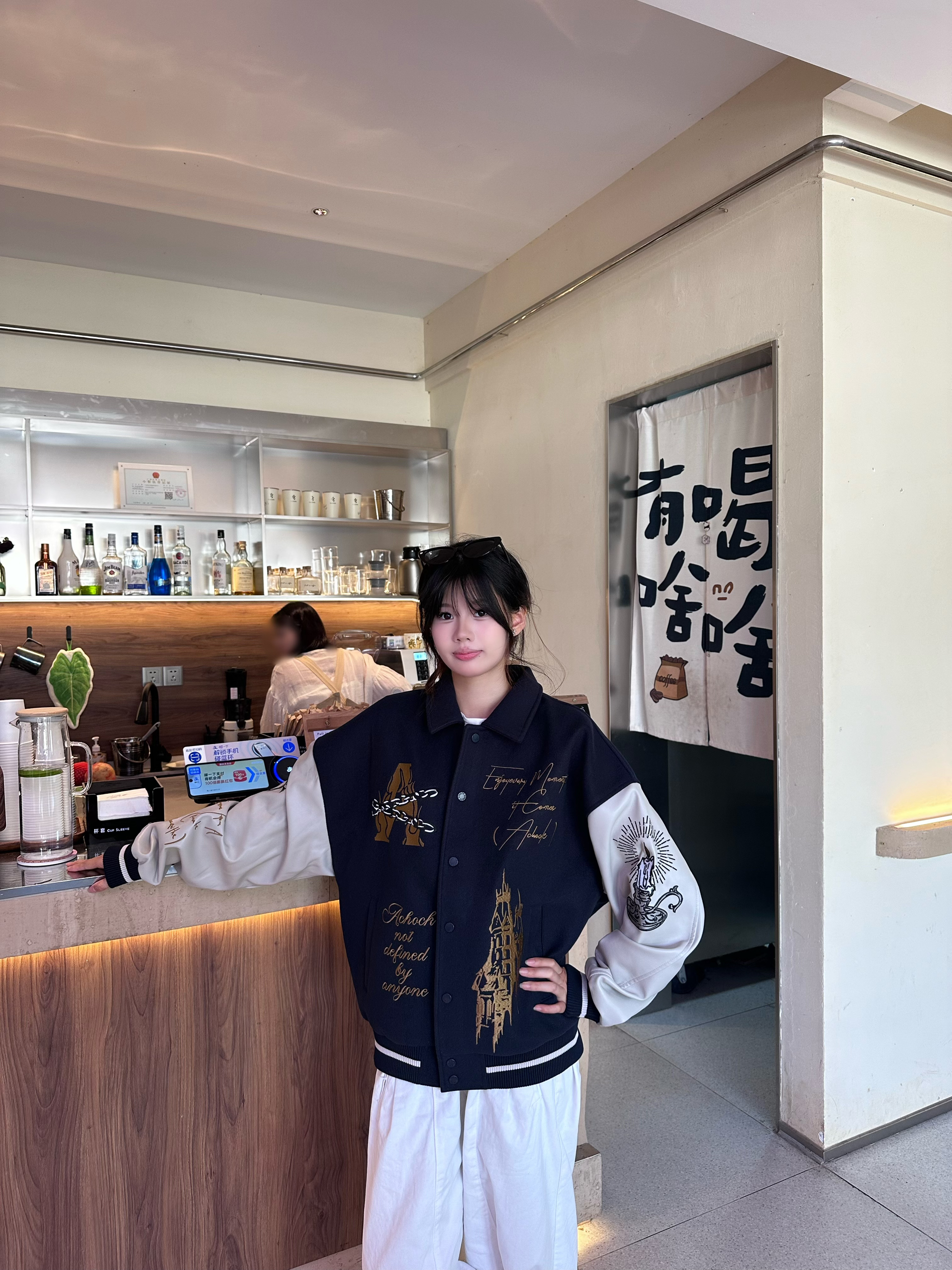 这款藏蓝拼白棒球服,是艺术与潮酷的碰撞。藏蓝主色复古大气,白色皮质袖臂搭配金色城堡、个性字母与图案,每一处细节都充满设计感。宽松版型随性又显瘦,日常搭配白色休闲裤,轻松打造复古潮人风格