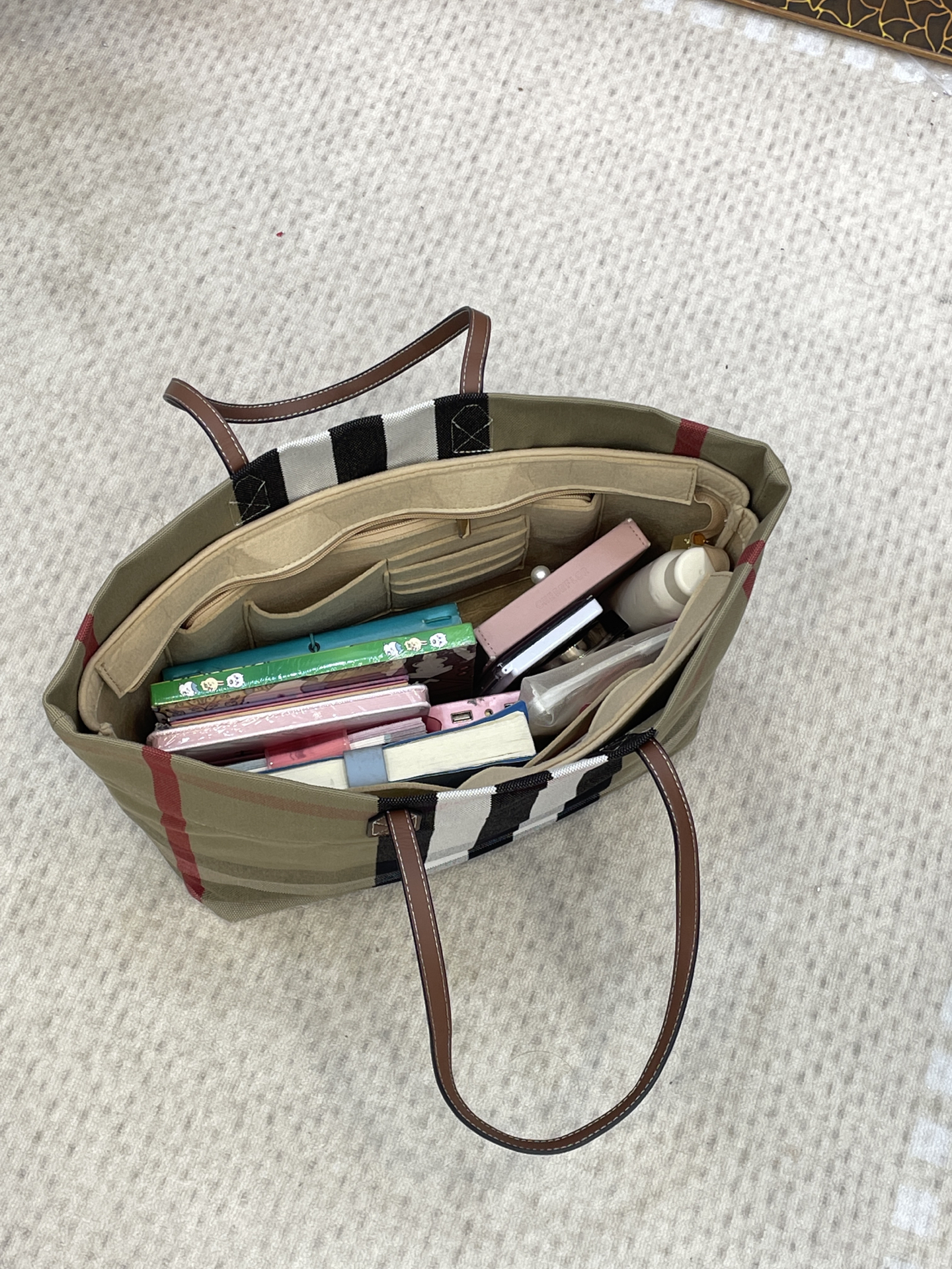 我发现这个包日常背太实用啦~条纹格设计很有风格,走在街上不容易撞款👍。米色毛毡内胆软软乎乎的,能保护包包不被刮花,这点我超爱~多隔层设计也很贴心,口红、钥匙这些小物件都能分类放好,找东西不用瞎翻啦👏。不过它没有肩带,只能手提或者单肩背,有时候赶时间想斜挎就不太方便😔。但整体来说,日常上班、逛街背都很合适,喜欢这种风格的姐妹可以考虑入手~