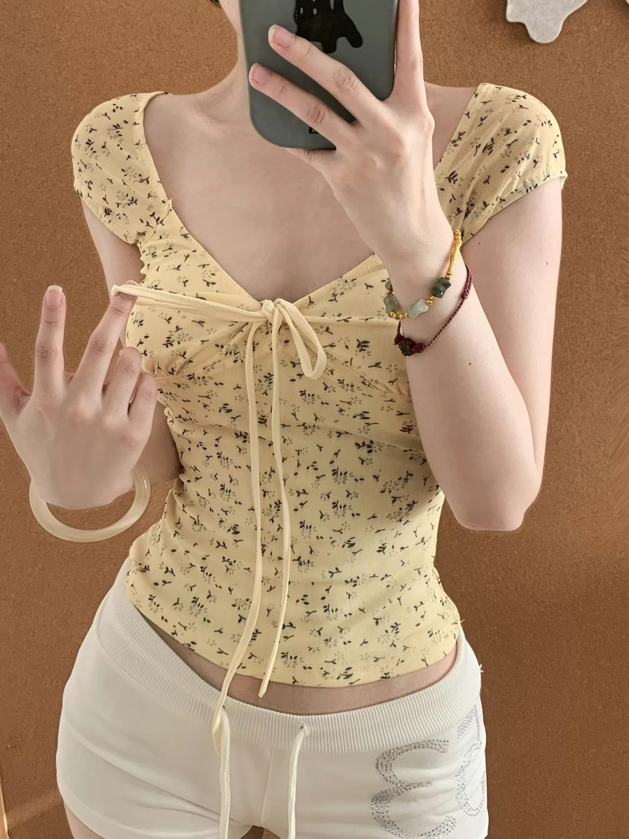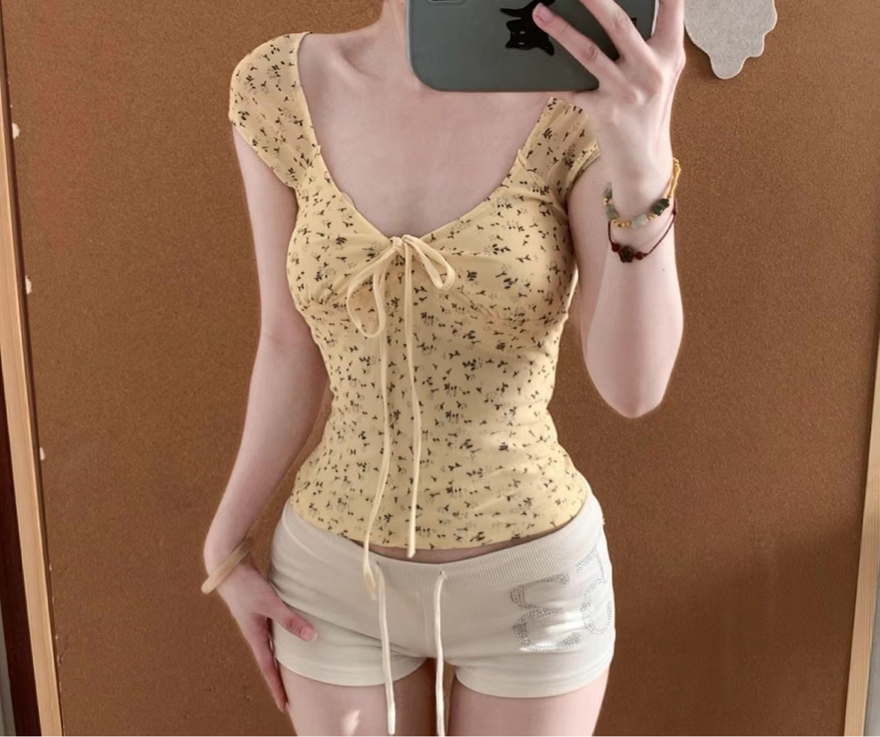 上衣是这件淡黄色碎花小衫,面料软软的很亲肤,领口的系带设计很有小心思,随便一系就很有氛围感,而且这个颜色特别显气色,夏天穿很清新。 下装搭了条米白色短裤,裤型很友好,宽松度刚好,不会贴在身上,上面还有点小钻饰,低调又精致。 配饰方面,我戴了个很润的玉镯,还有几条不同材质的小手链叠戴,增加了点层次感,整体看起来就不会太单调。 这套穿出去逛街或者和朋友喝咖啡都很合适,舒服又自在,关键是拍照也很出片,大...