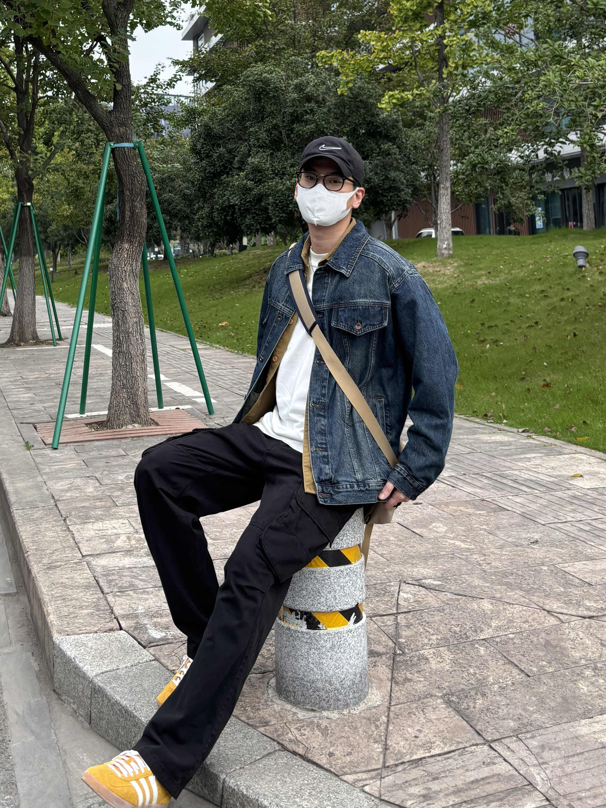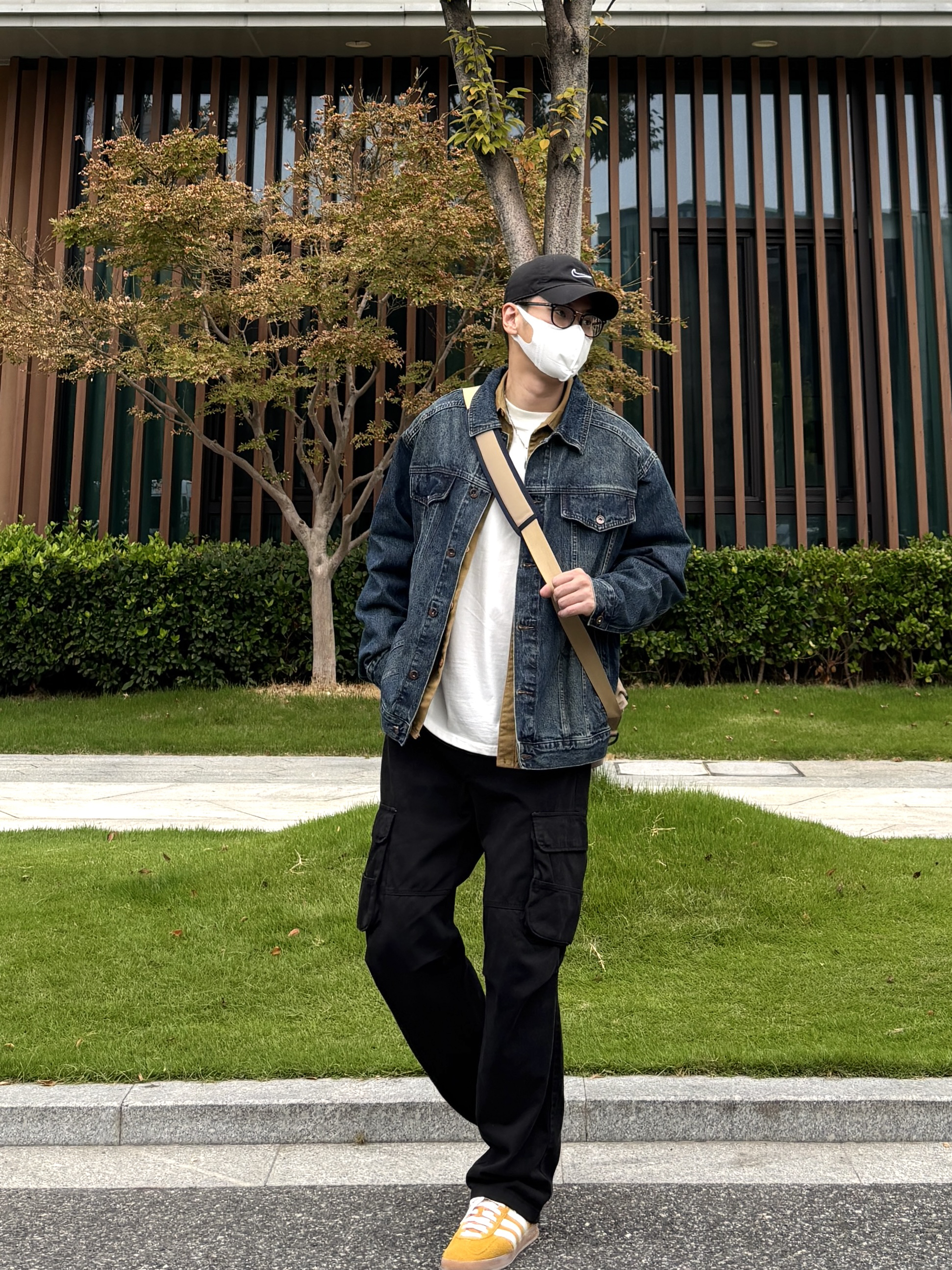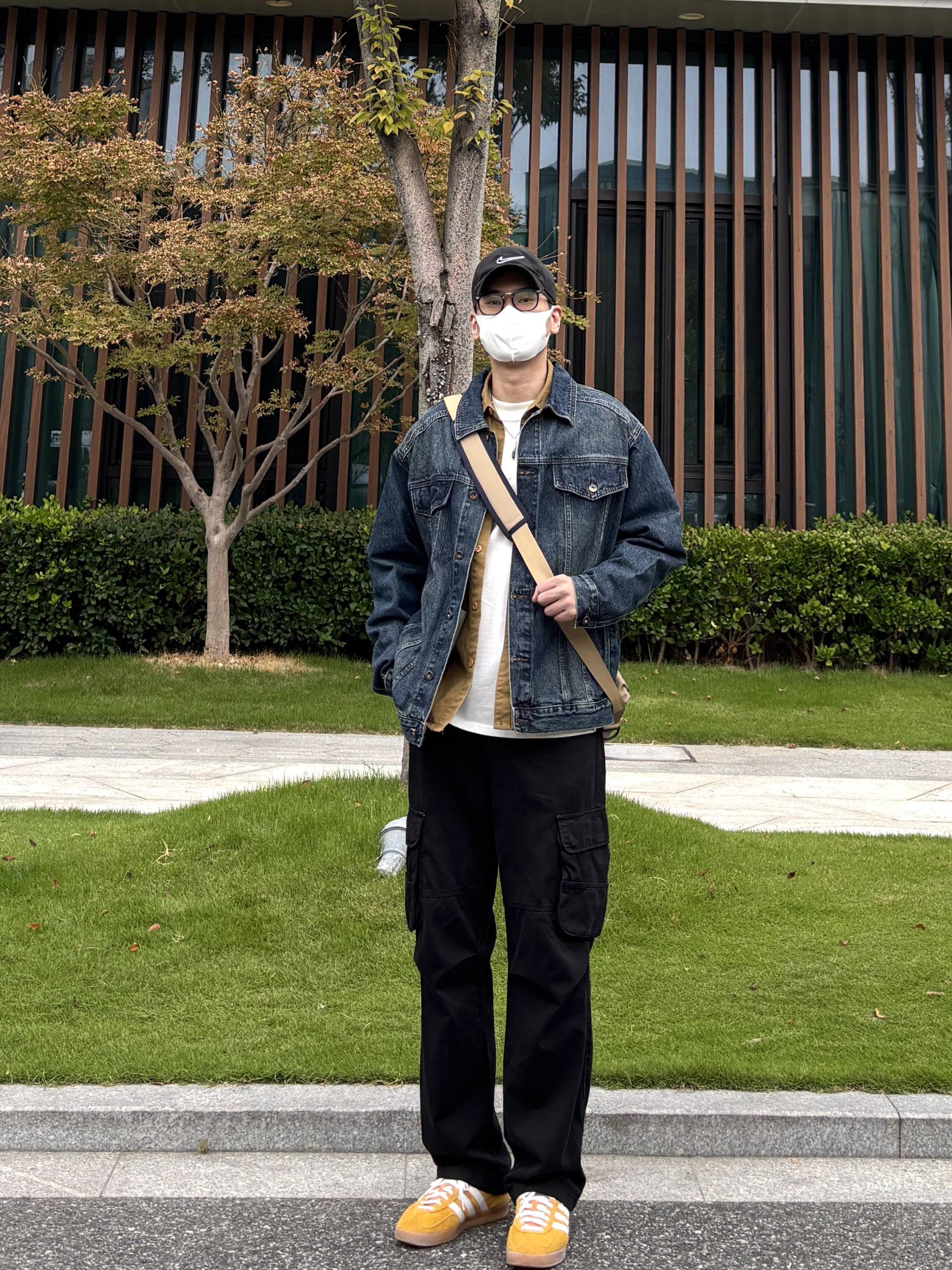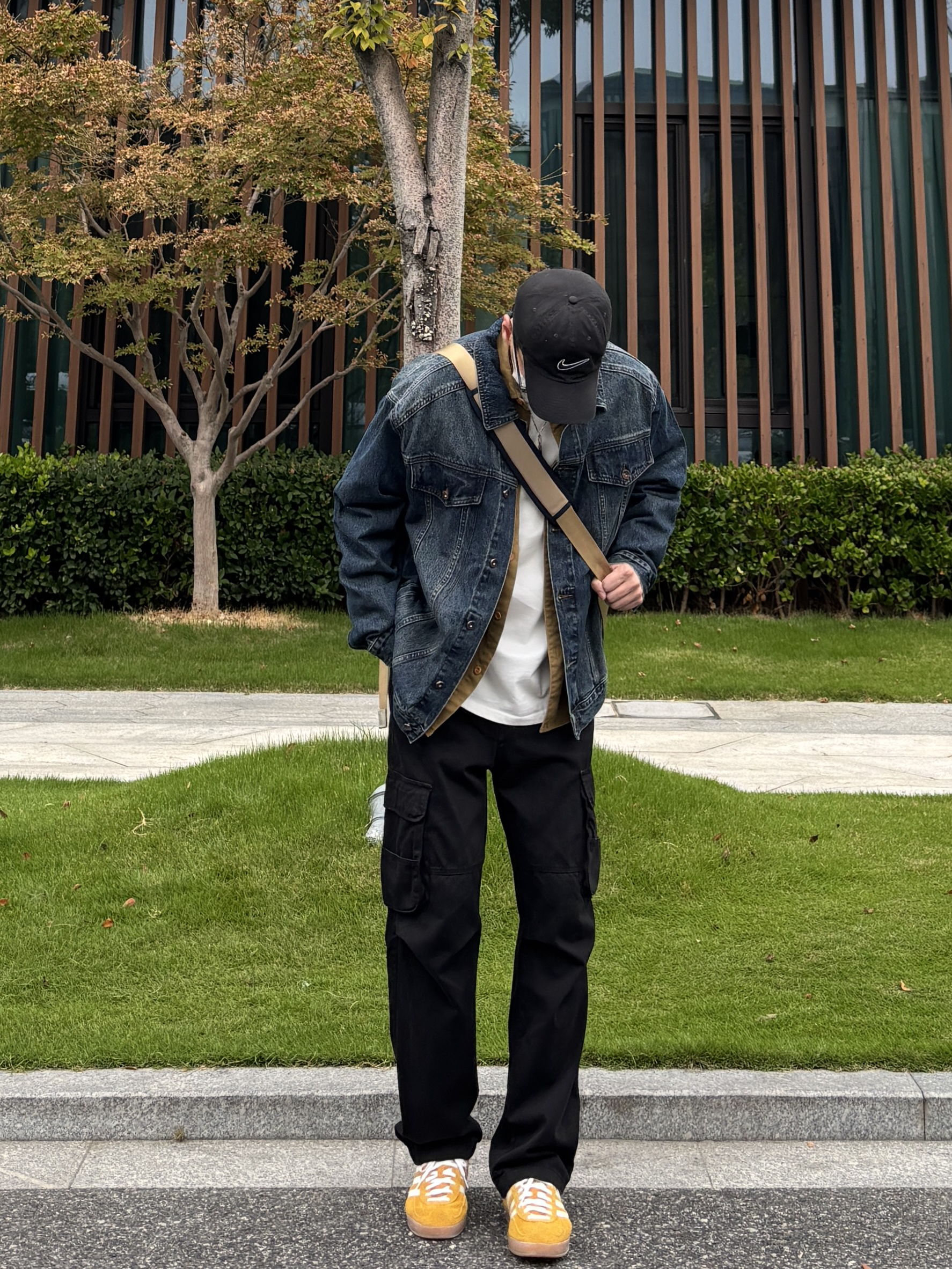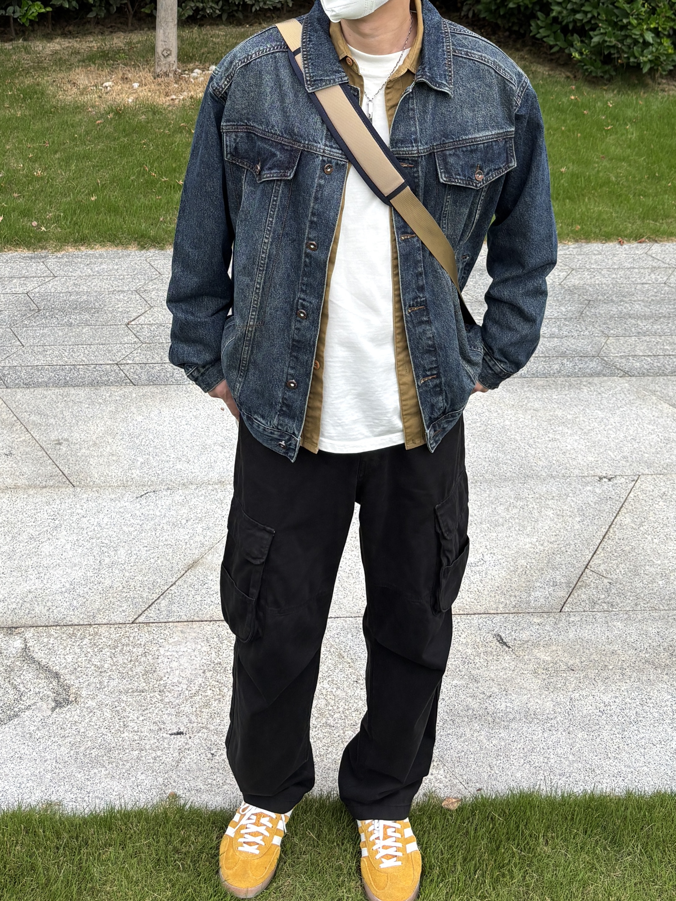 降温了,分享我的秋季万能穿搭公式: 牛仔外套 + 卡其衬衫 + 黑工装裤 = 不会错 再 + 一双亮黄板鞋 = 很对味 简单四件套,穿出工装少年感! - 衣服裤子:NICE LILI 鞋子:adidas