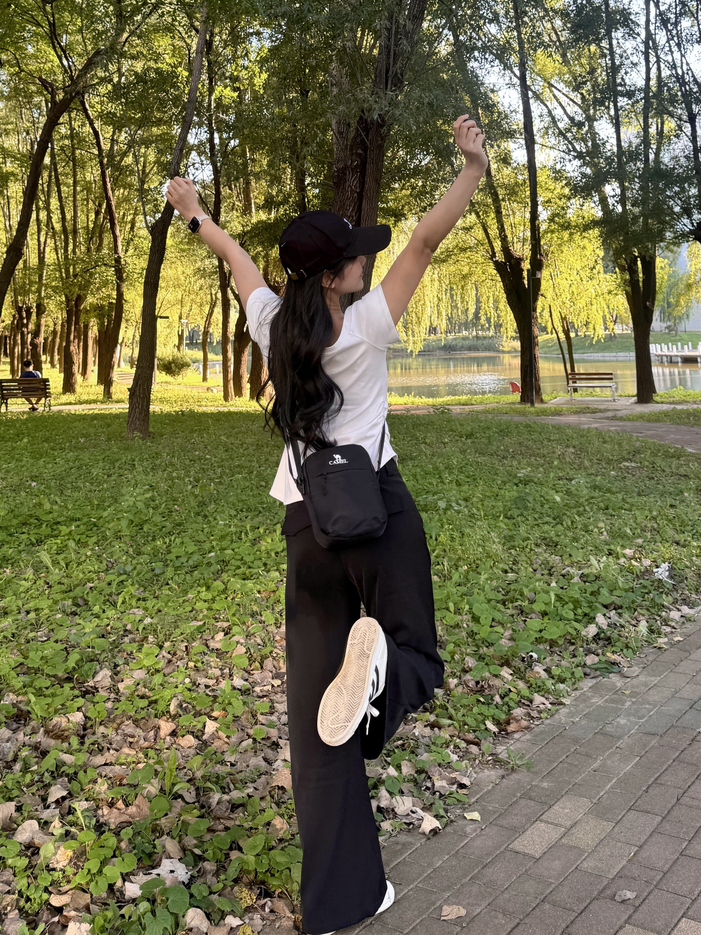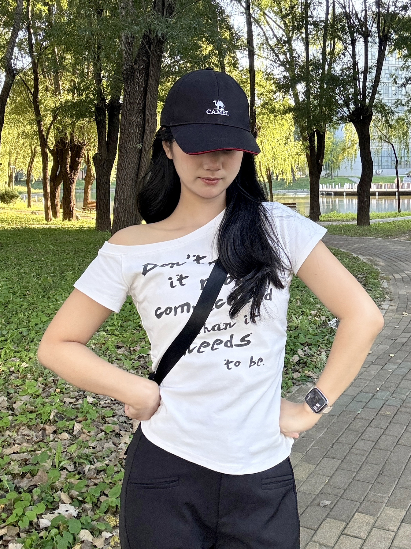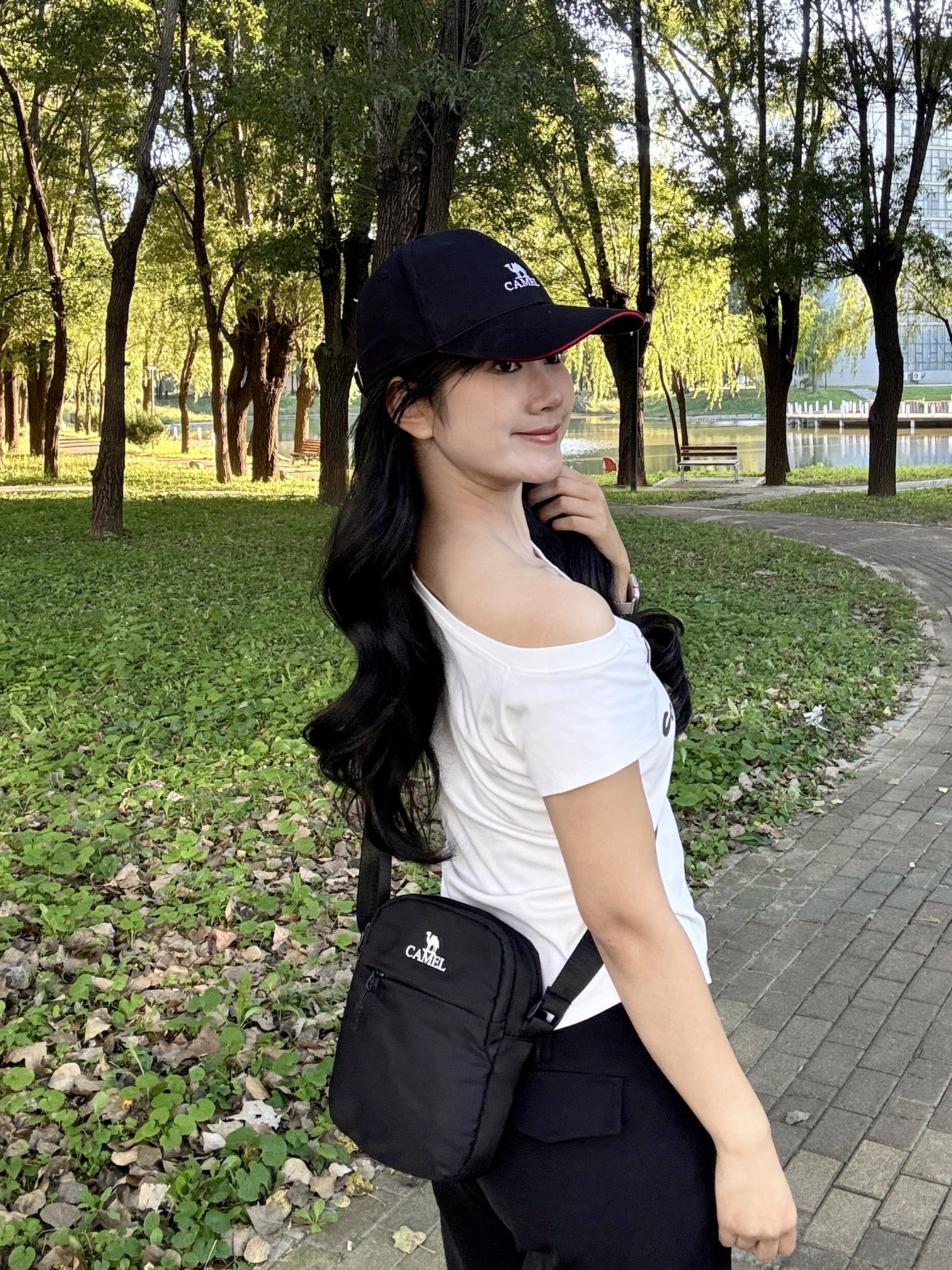 整体主要就是一个休闲感的ootd 一个偏运动风的黑色斜挎小包! 上面是小小的logo还是挺简约实用哒 出门手机充电宝放进去空间都够用 再加上一个同款的黑色棒球帽🧢 帽檐是红色的边边又有设计感~ 这一身装备妥妥的国庆出去嗨啦👋