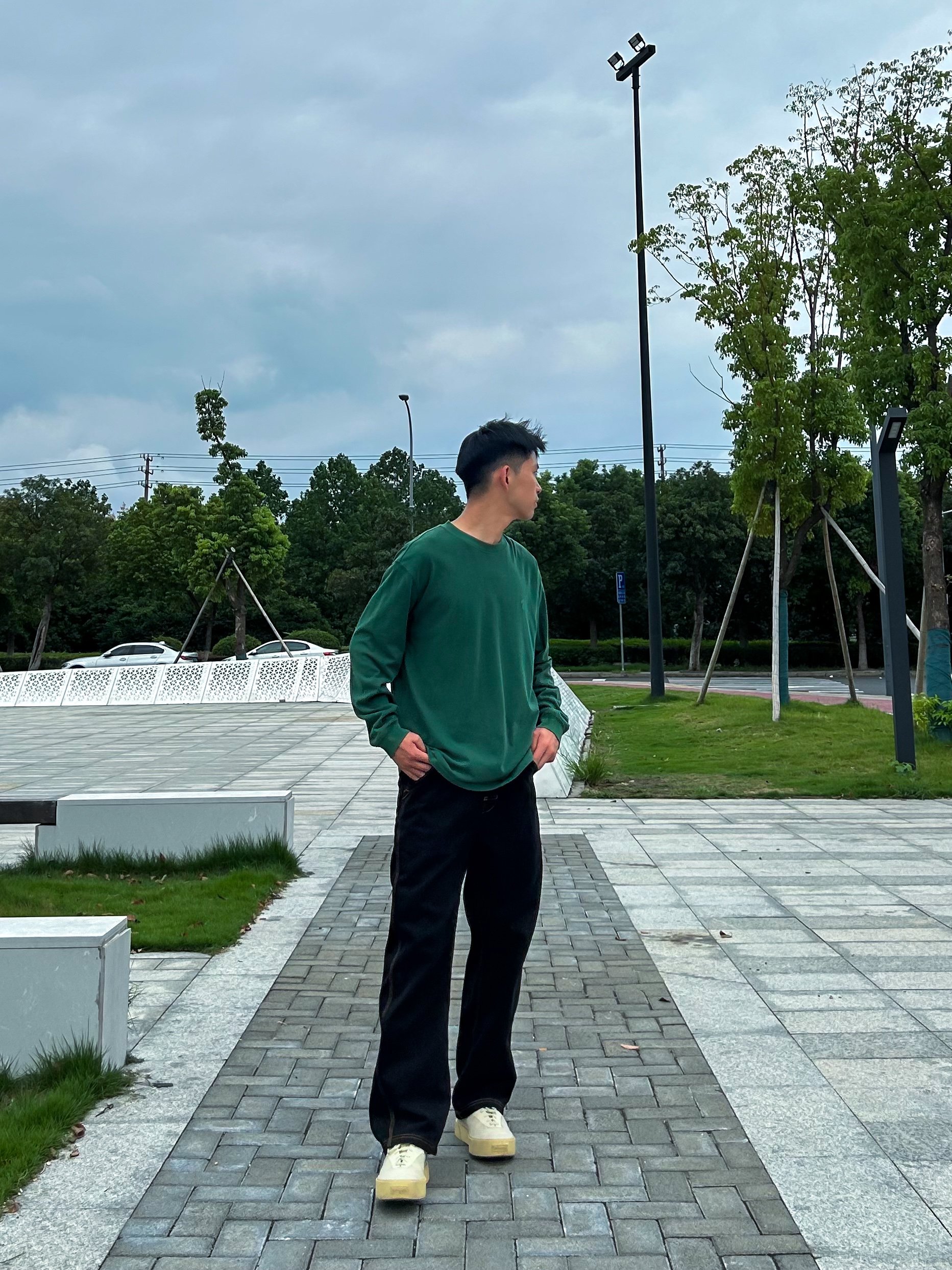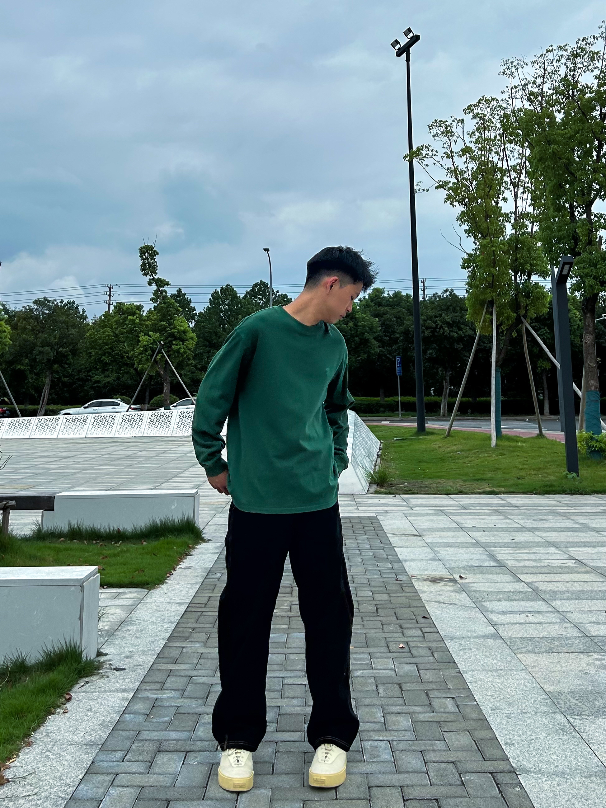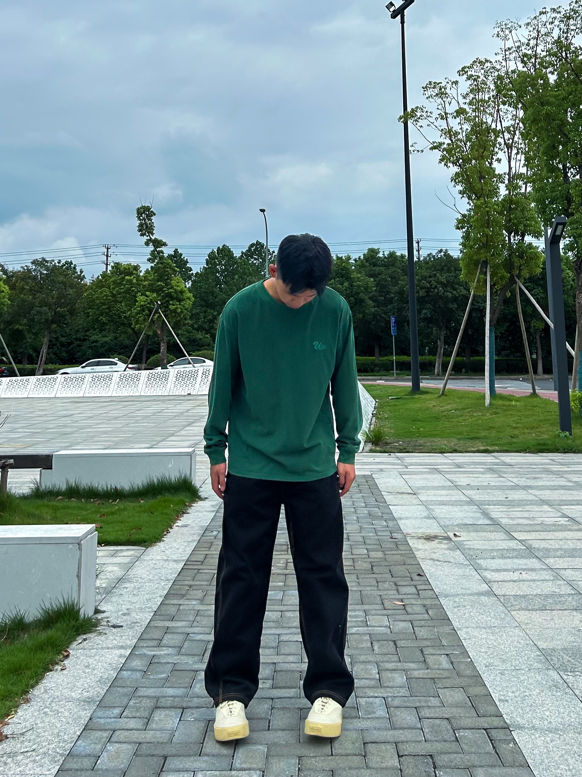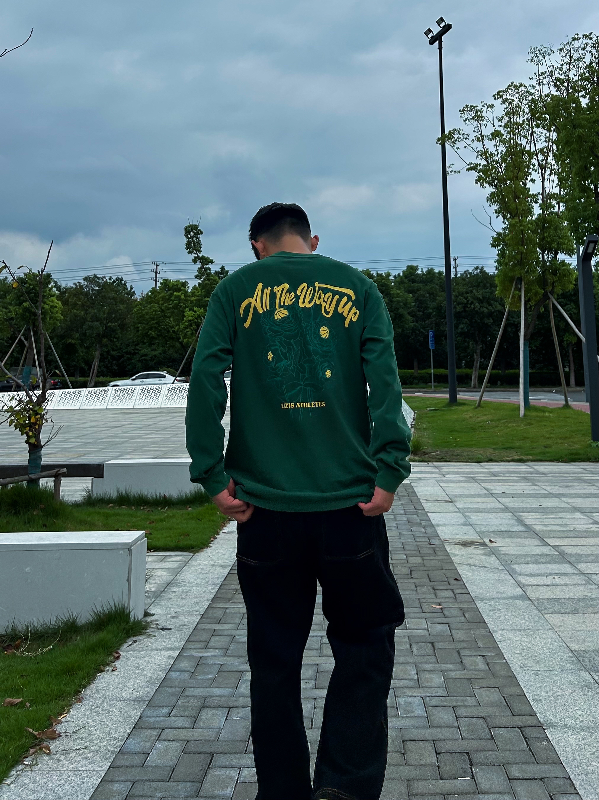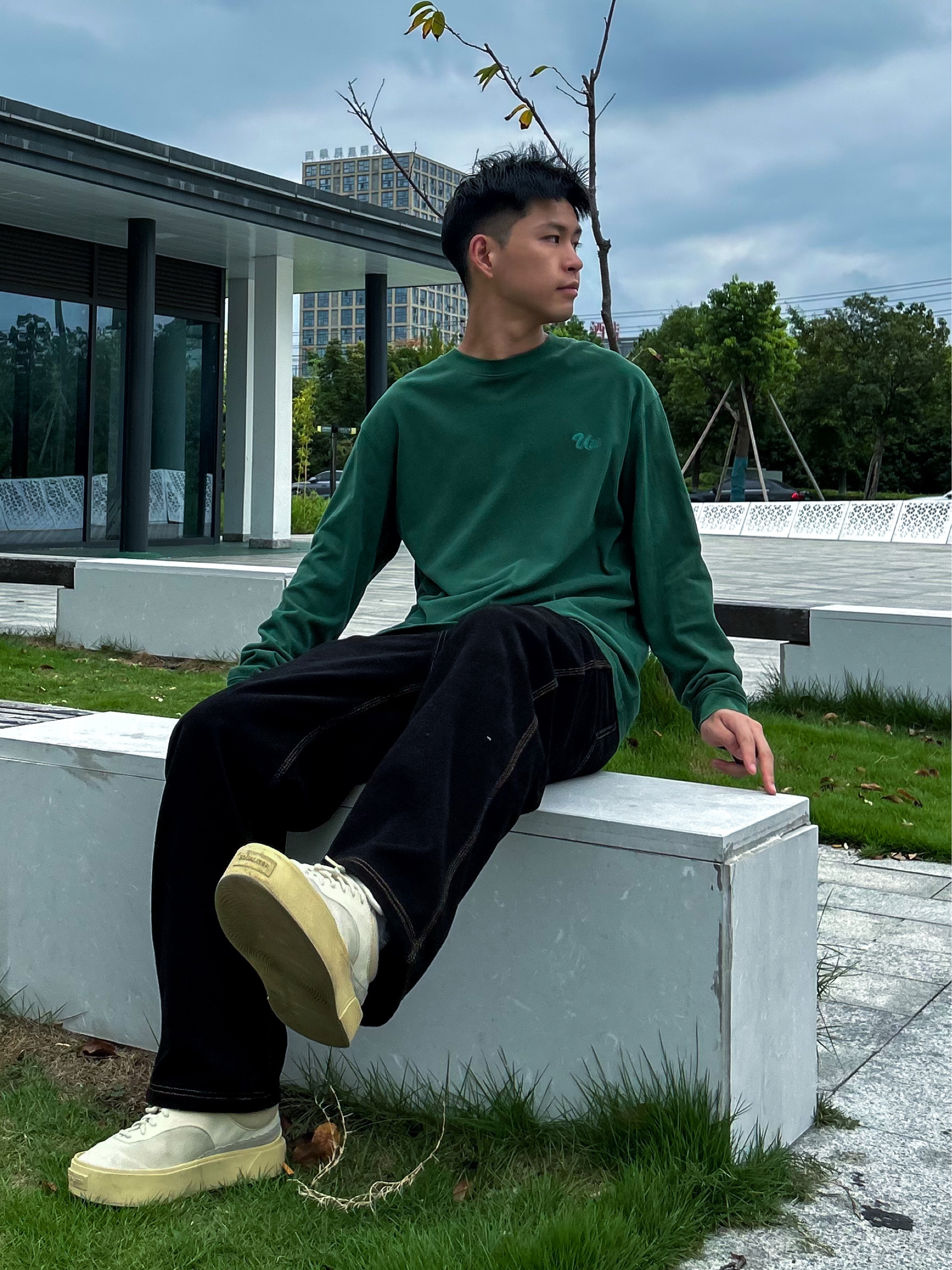 哈咯,这里是爱打球爱穿搭的卢_SG 秋日才是穿搭的主战场 今天上身穿的是绿色长袖,用黄色点缀 背后的印花真的太喜欢了 裤子选择了一条直筒版型的牛仔裤 黑配绿真的绝了,是心动啊 在配一双浅色板鞋,绝绝子!