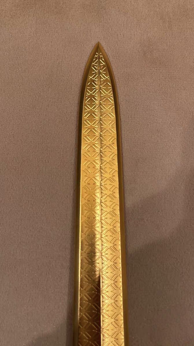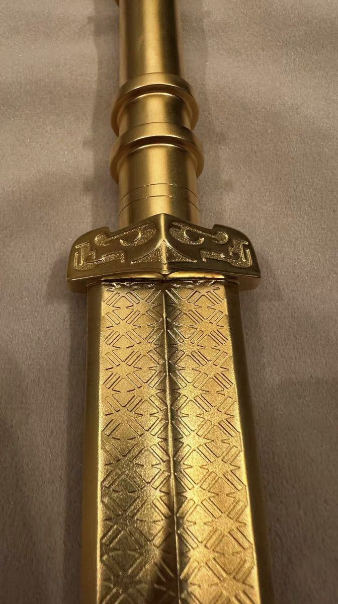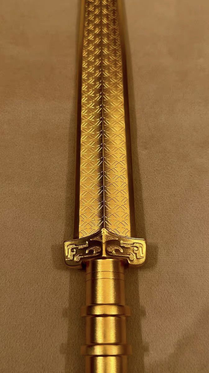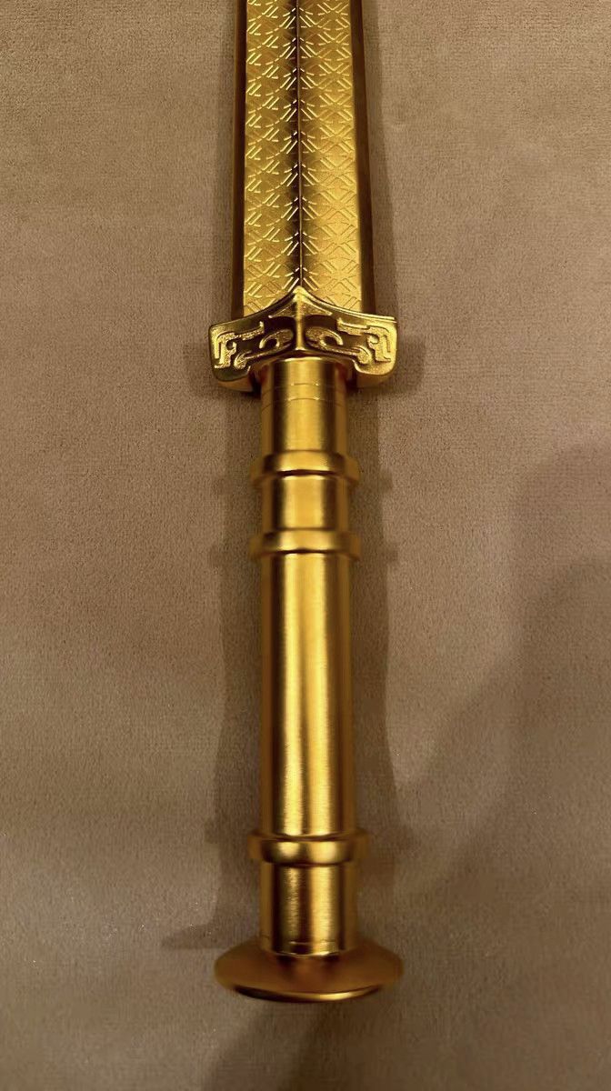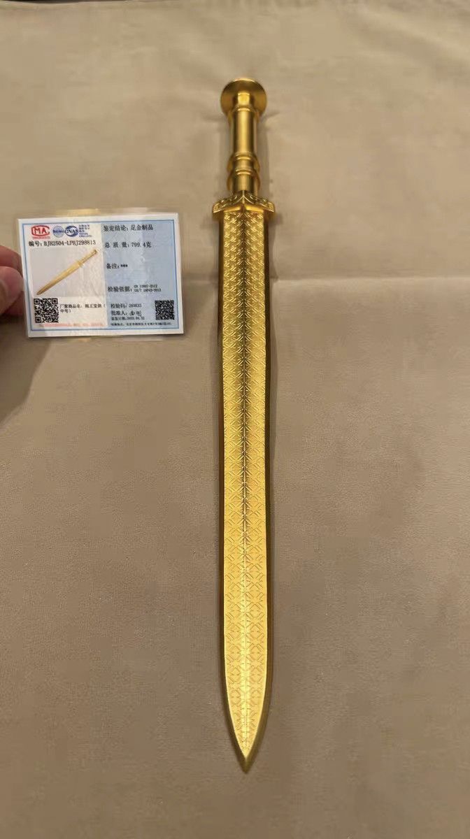 哇,这把金剑也太亮眼了吧!金灿灿的,剑身的花纹还挺精致,拿在手里(虽然是模型或者工艺品)肯定特别有分量感。还有鉴定证书,感觉很正规,当个收藏或者摆件,那格调一下子就上来了,绝对是个吸睛的玩意儿!