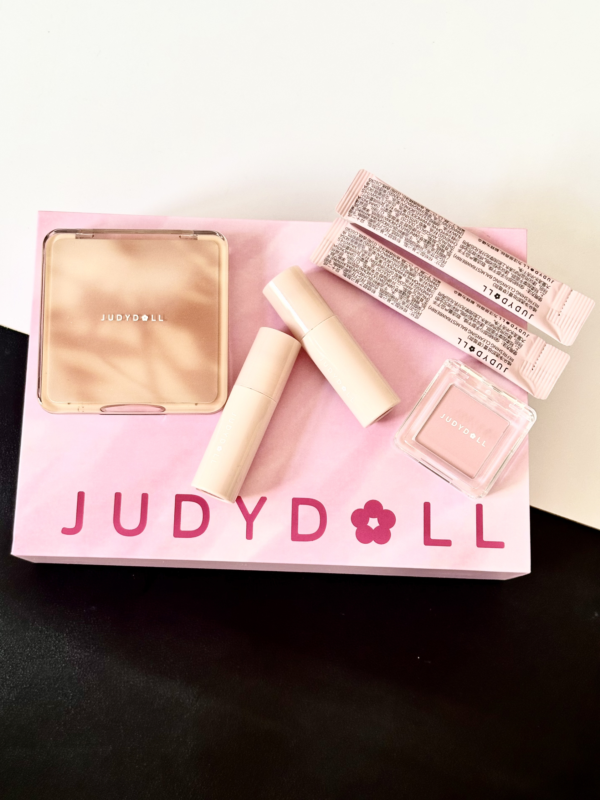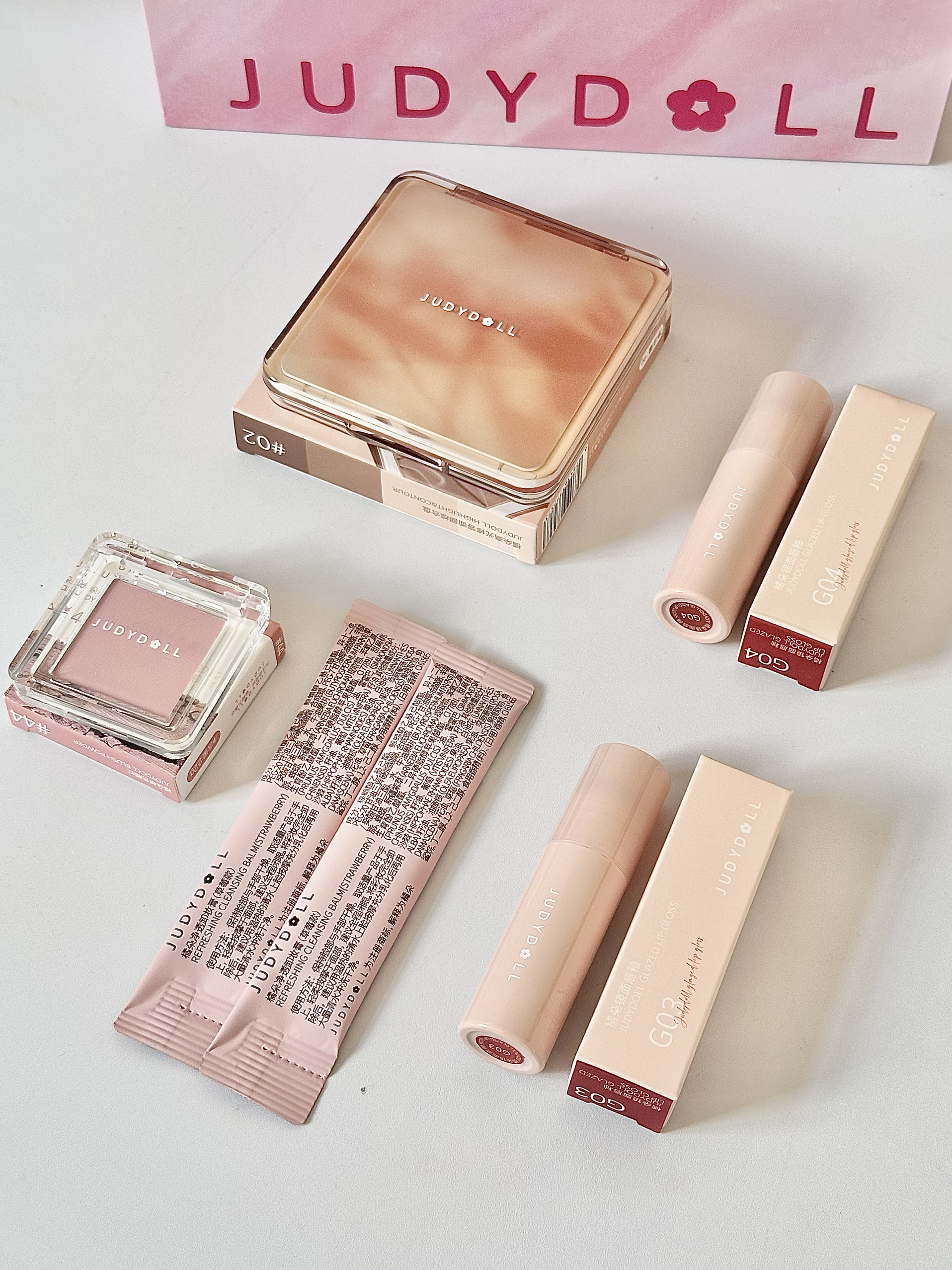 介个橘朵滴粉红礼盒 直入我的少女心!! 真的太漂亮了,而且产品尊嘟很实用 #02树影盘4️⃣种颜色的修容盘 挺上色的 颜色也比较日常 适合淡妆 #44草莓牛奶腮红 淡淡的粉色 适合日系妆容和淡妆 很日常的颜色 #G03太妃糖 、G04玫瑰糖 口红 刷头贴合唇部好涂匀!持久不沾杯 不粘腻不拉丝不糊嘴的 质地我敲爱! 还有两小条卸妆膏。 性价比还蛮高的,姐妹们双十一值得入呀