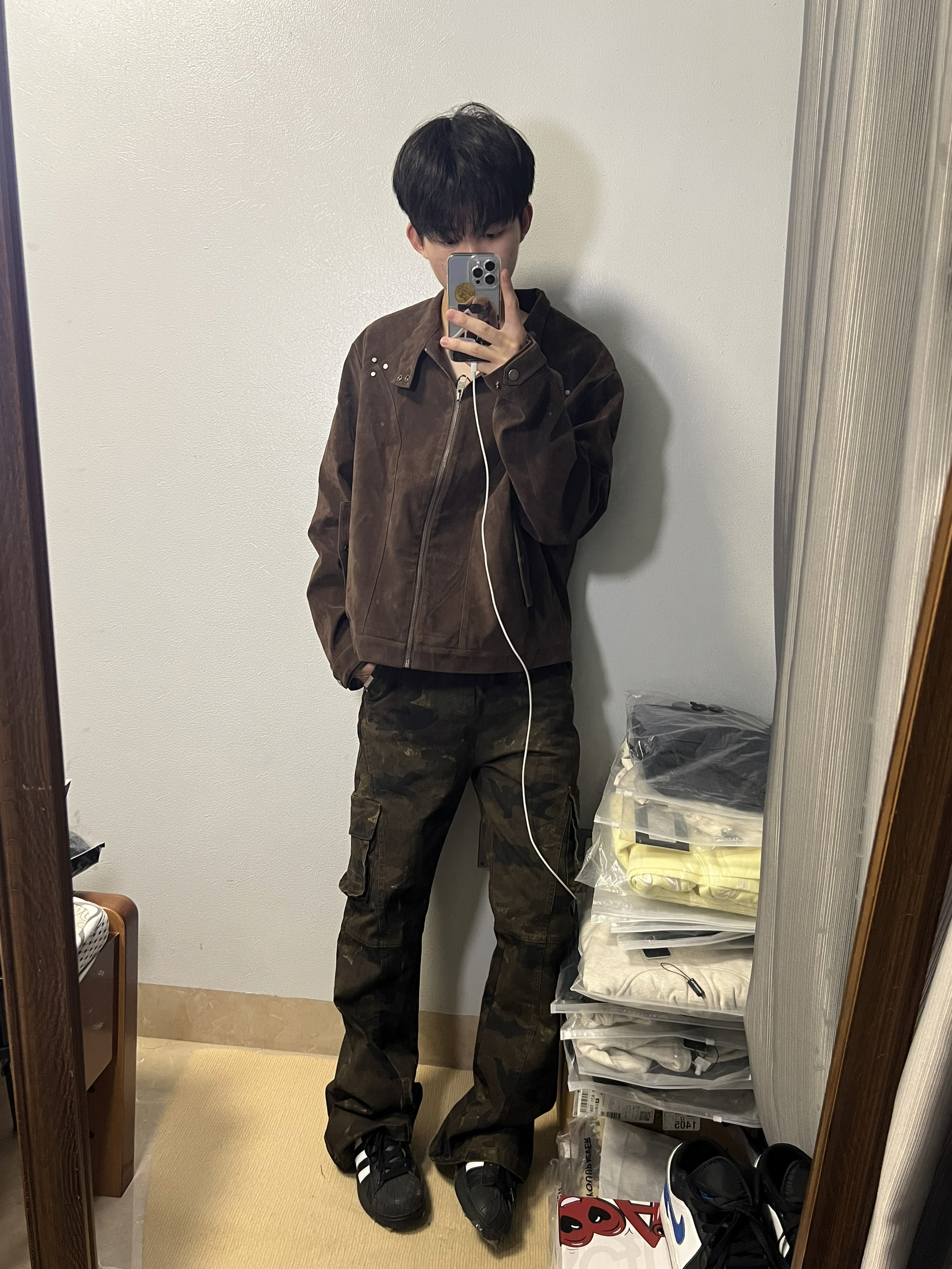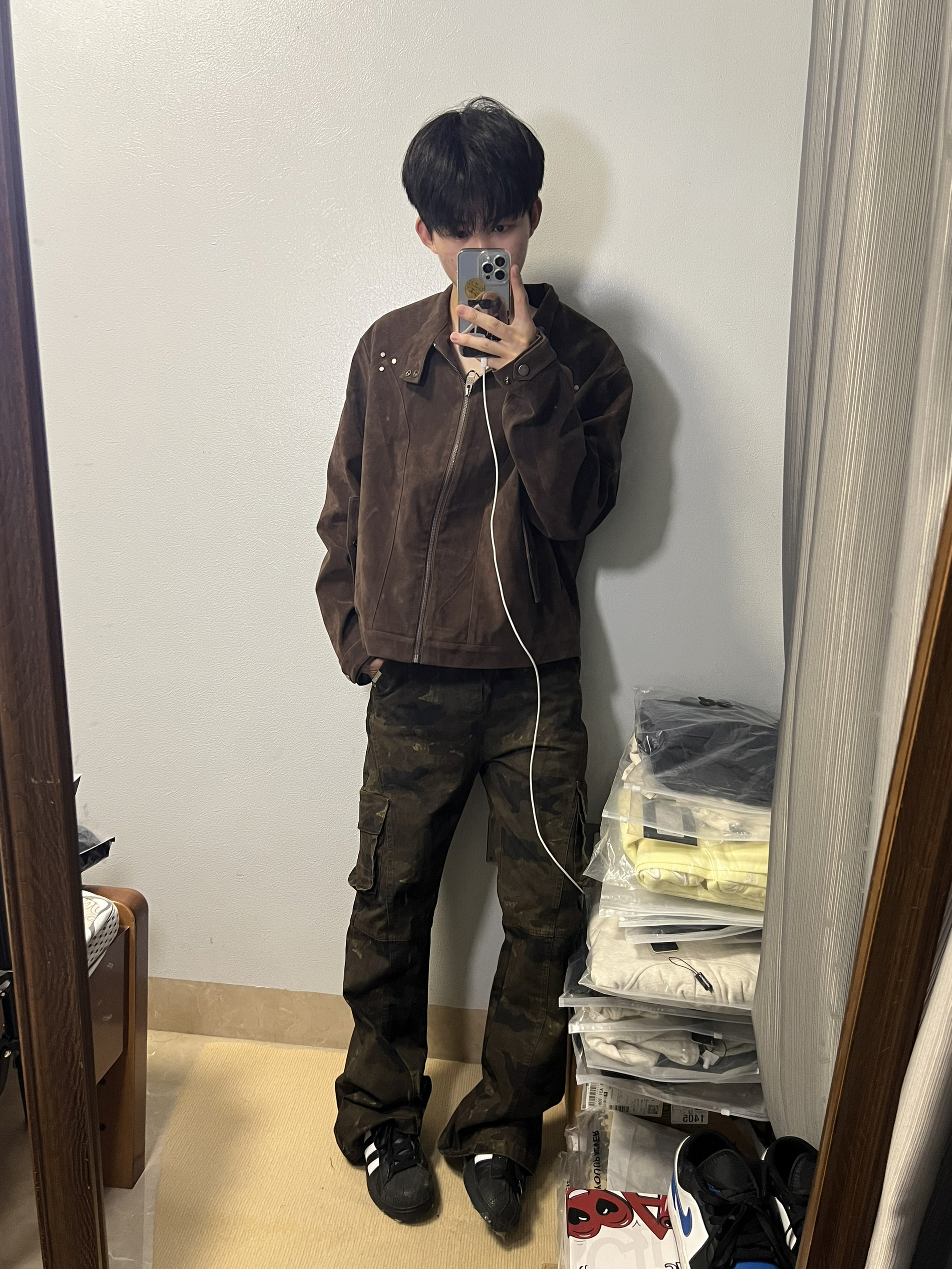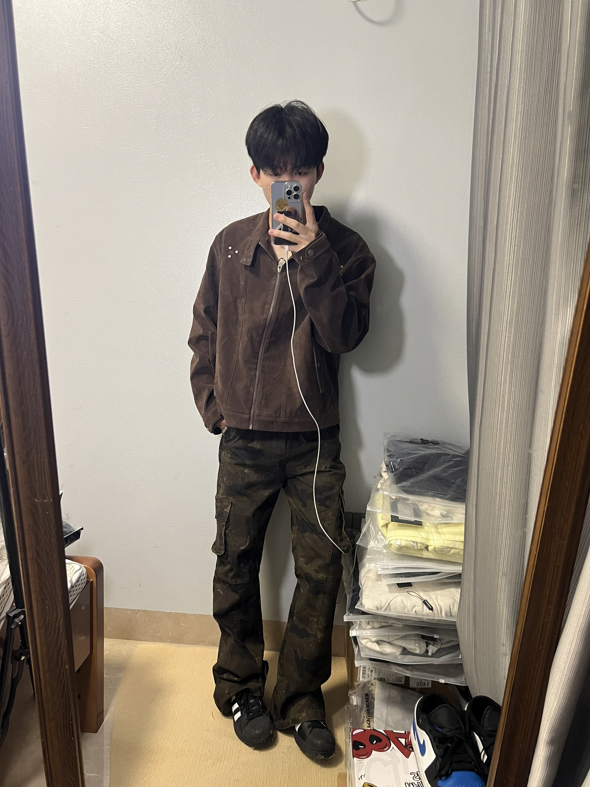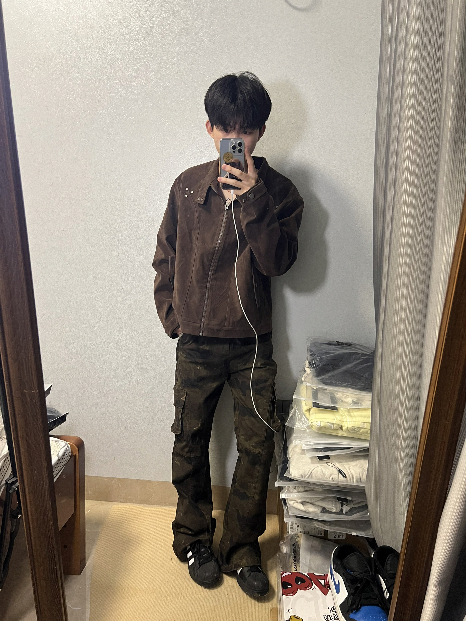Hello👏 今日份穿搭来啦! 上身一款麂皮夹克外套🤩 咖色的 面料摸起来舒服~ 搭配一款迷彩裤📮 帅的不要不要的!!