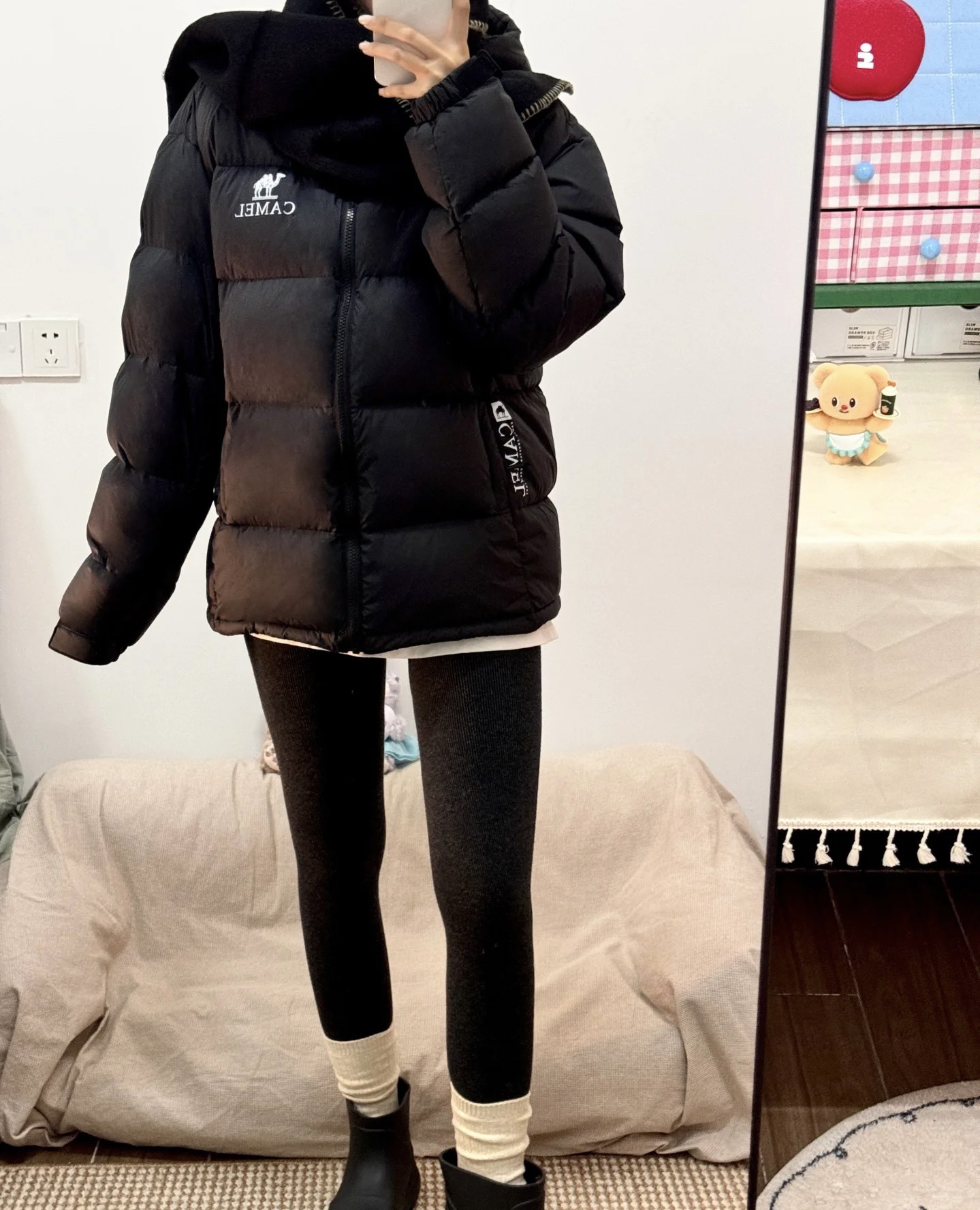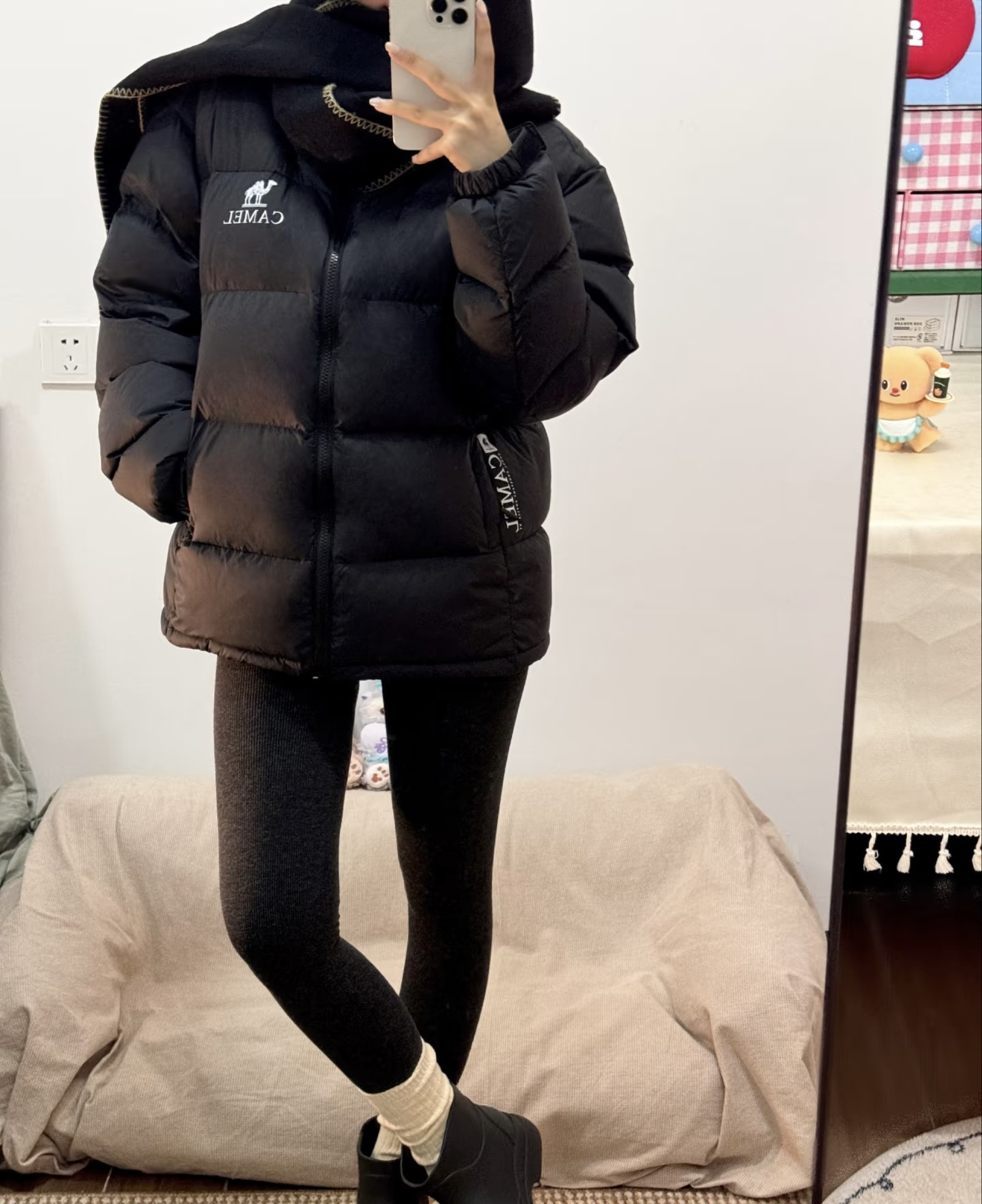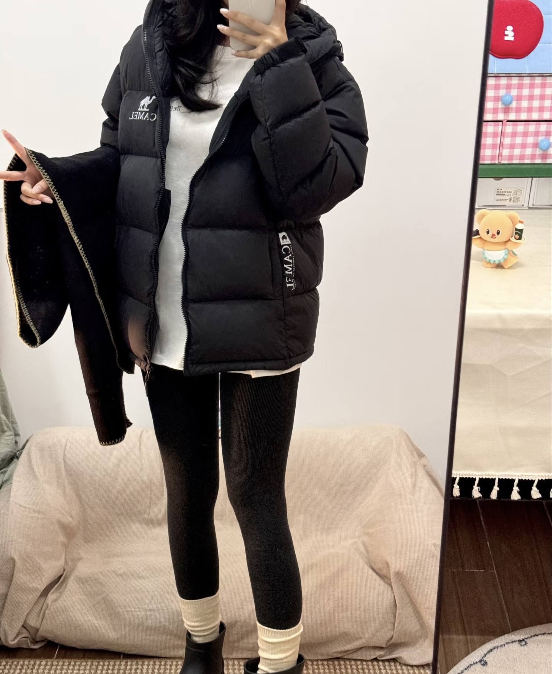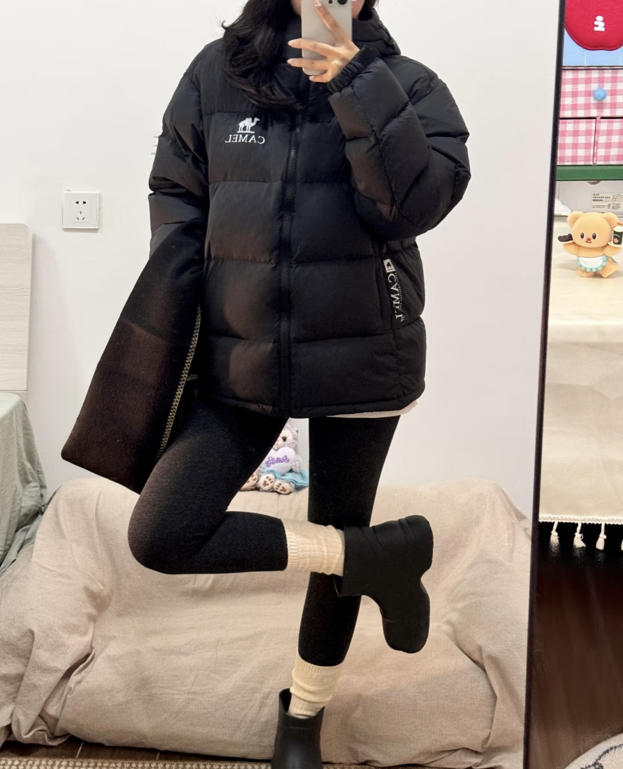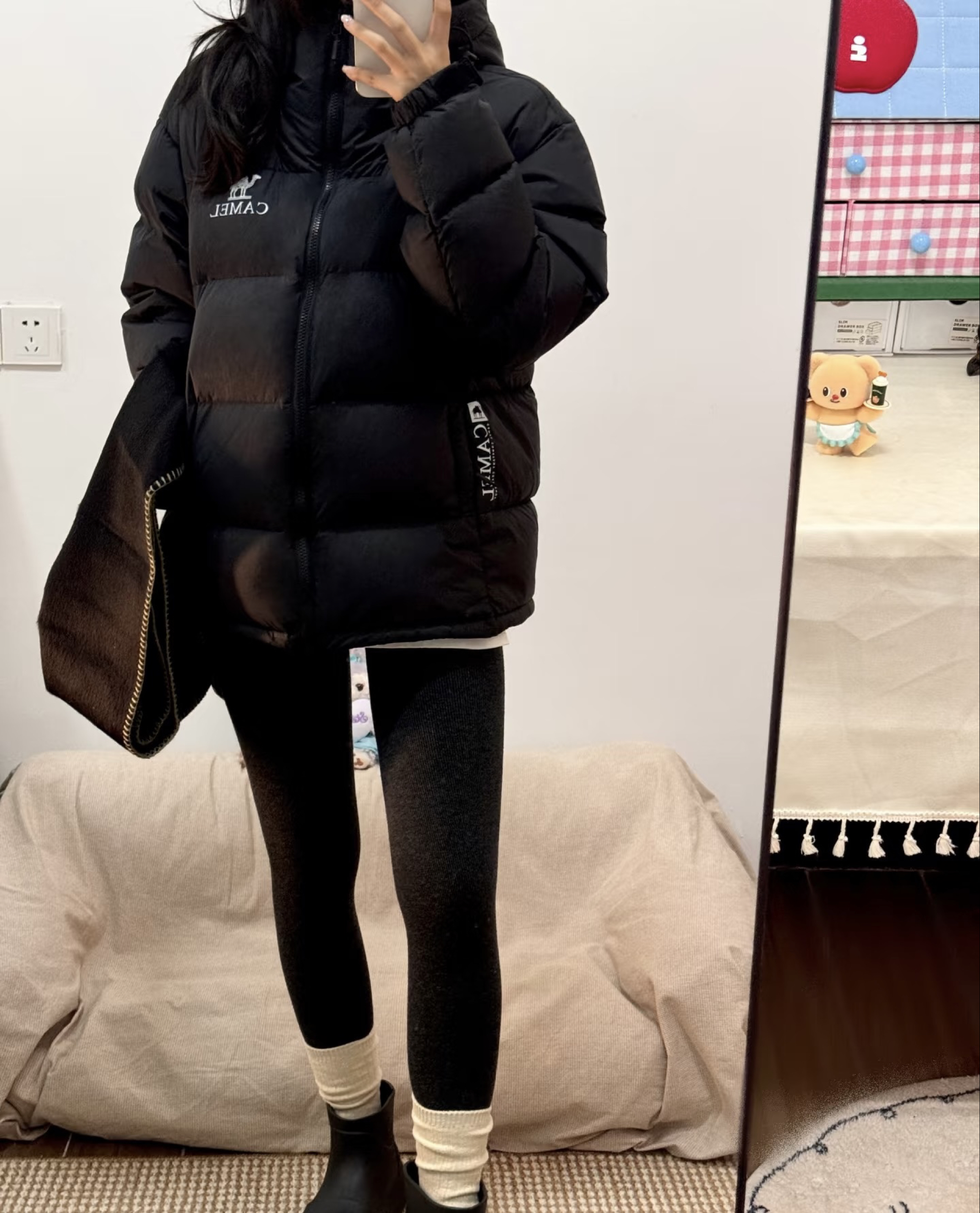 最近穿这件骆驼黑色羽绒服出门,朋友说看着就很暖和。 宽松的版型裹着很舒服,黑色也百搭,配了leggings和短靴,日常出门买菜或者逛公园都合适,感觉冬天这样穿既暖和又自在。