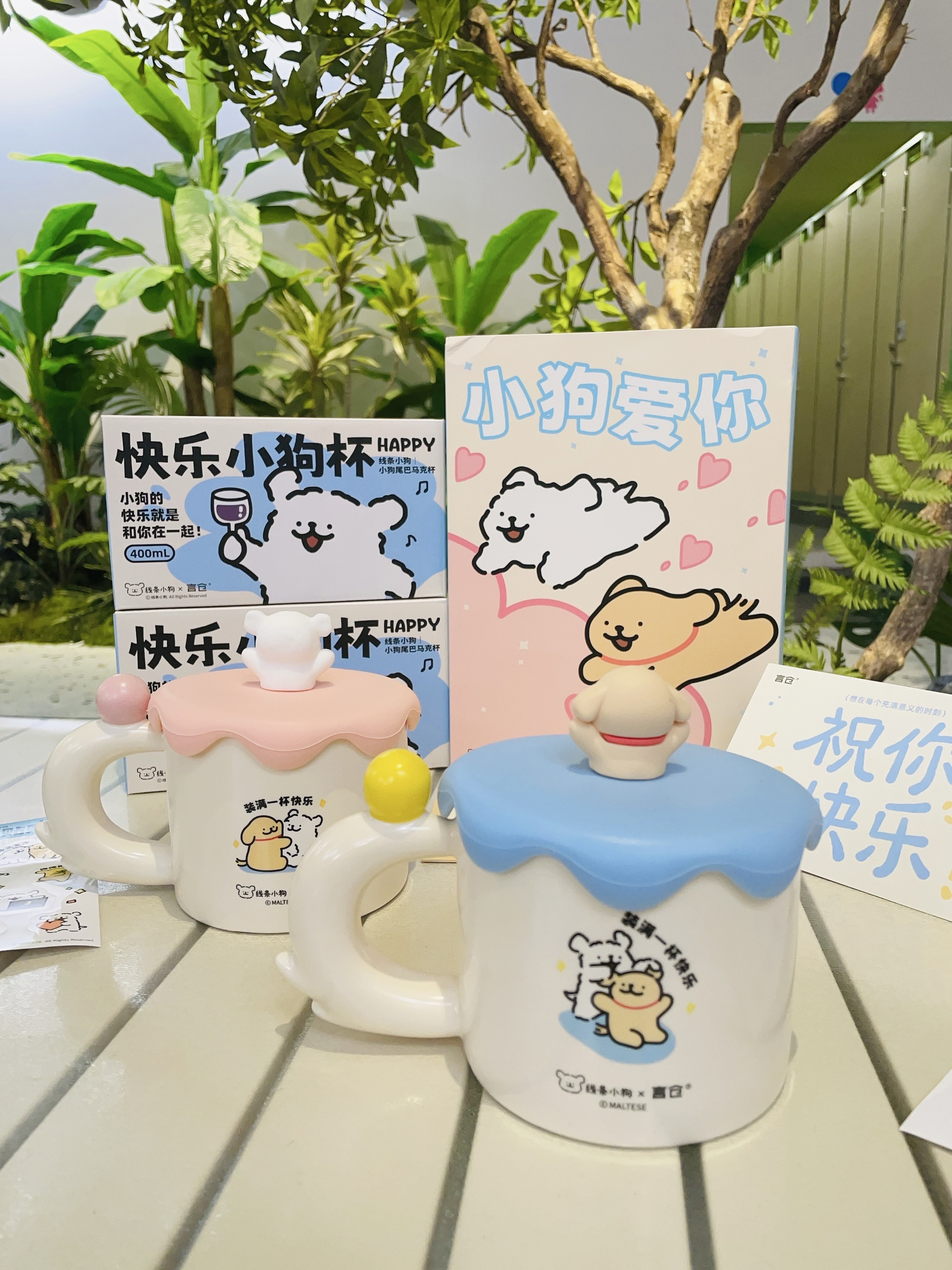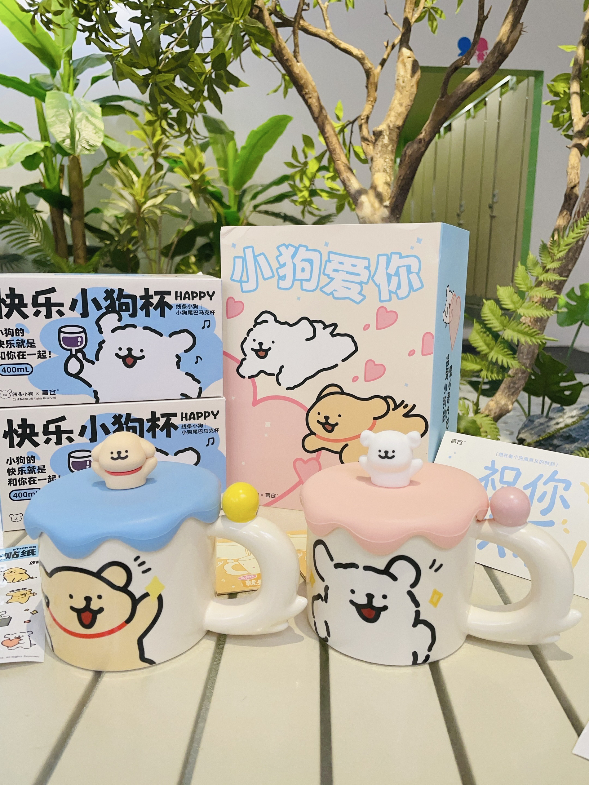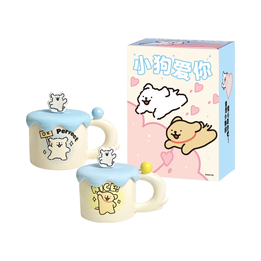 换季啦当然要准备新的杯子喝水 言仓×线条小狗礼盒 打开有两个马克杯好好看啊 陶瓷材质我感觉蛮厚实的 容量大小刚好用来喝牛奶 咖啡都可以 硅胶杯盖的小白和小金毛好可爱 礼盒包装精致 送礼都可