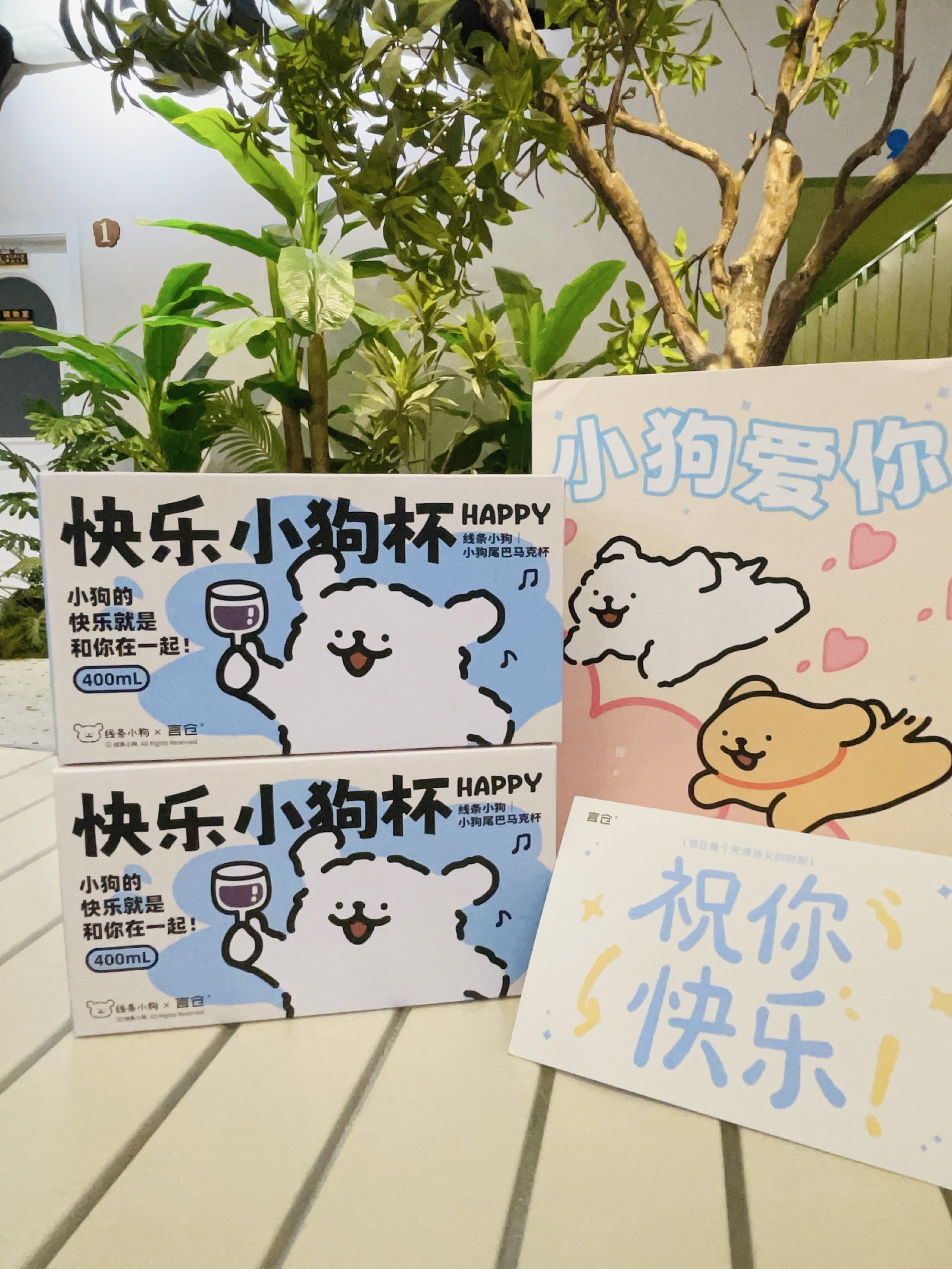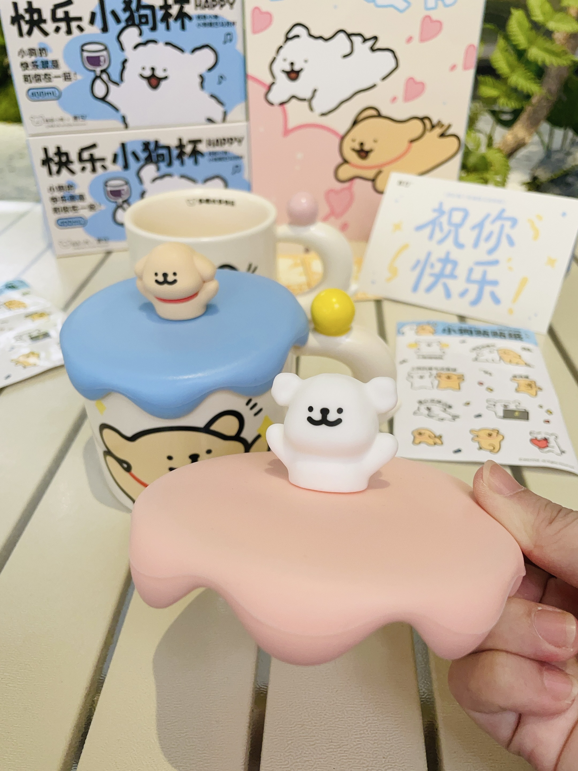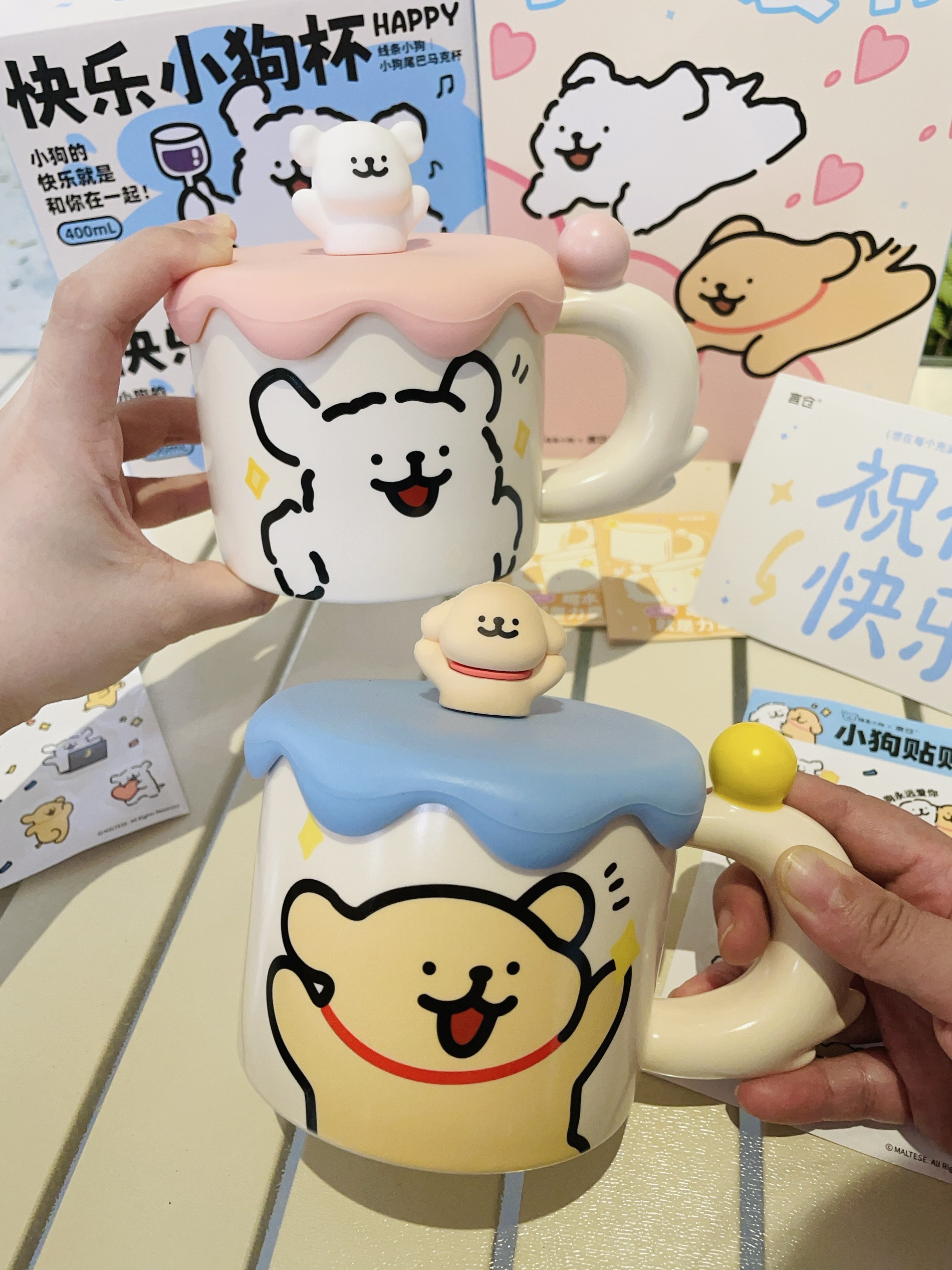 换季啦当然要准备新的杯子喝水 言仓×线条小狗礼盒 打开有两个马克杯好好看啊 陶瓷材质我感觉蛮厚实的 容量大小刚好用来喝牛奶 咖啡都可以 硅胶杯盖的小白和小金毛好可爱 礼盒包装精致 送礼都可