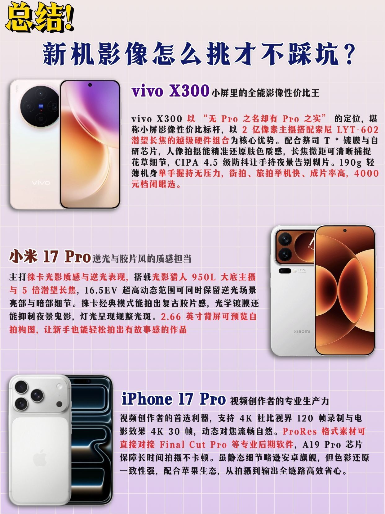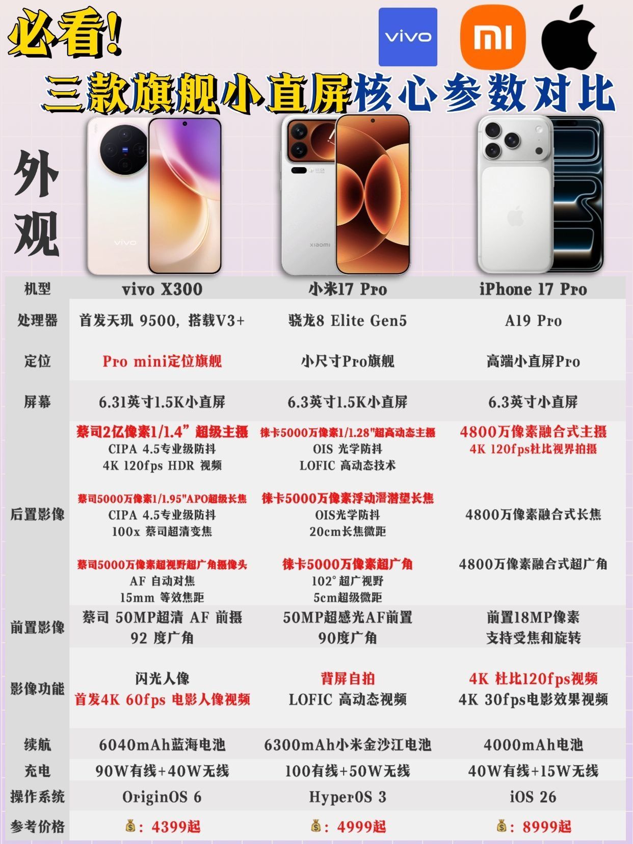 不会还有人不知道小屏旗舰怎么选吧? 是谁在纠结 vivo X300、小米 17 Pro、🍎17 Pro? 看过来!影像 + 性能 + 续航全维度对比,选机不踩坑📱 🟦vivo X300:Pro mini 级全能性价比王 影像王牌:2 亿像素蔡司主摄 + 5000 万 APO 潜望长焦,人像肤色真实,长焦微距能拍清花瓣纹理。支持增距镜,堪称演唱会神器。CIPA 4.5 级防抖太顶,夜市随手拍夜...