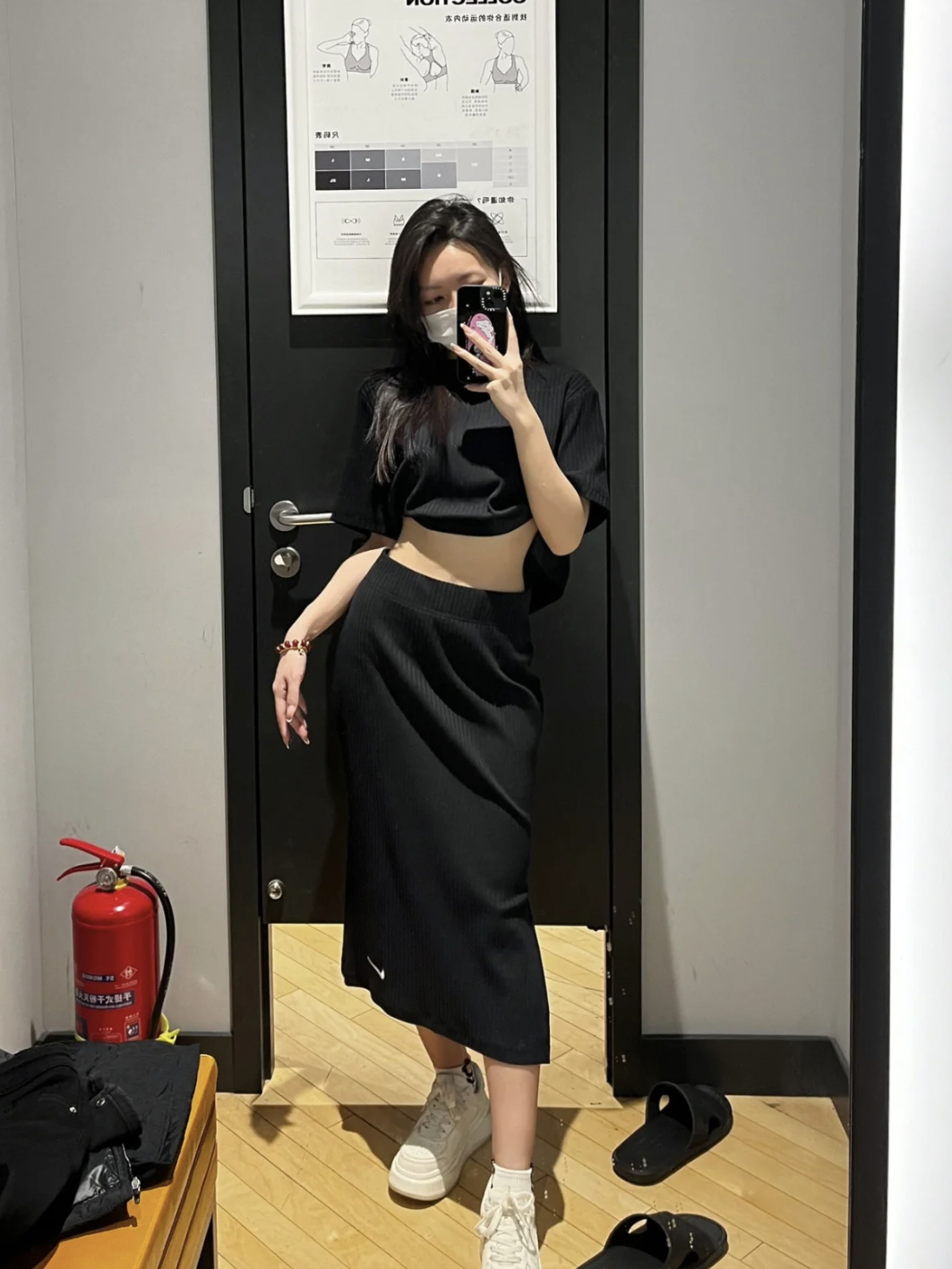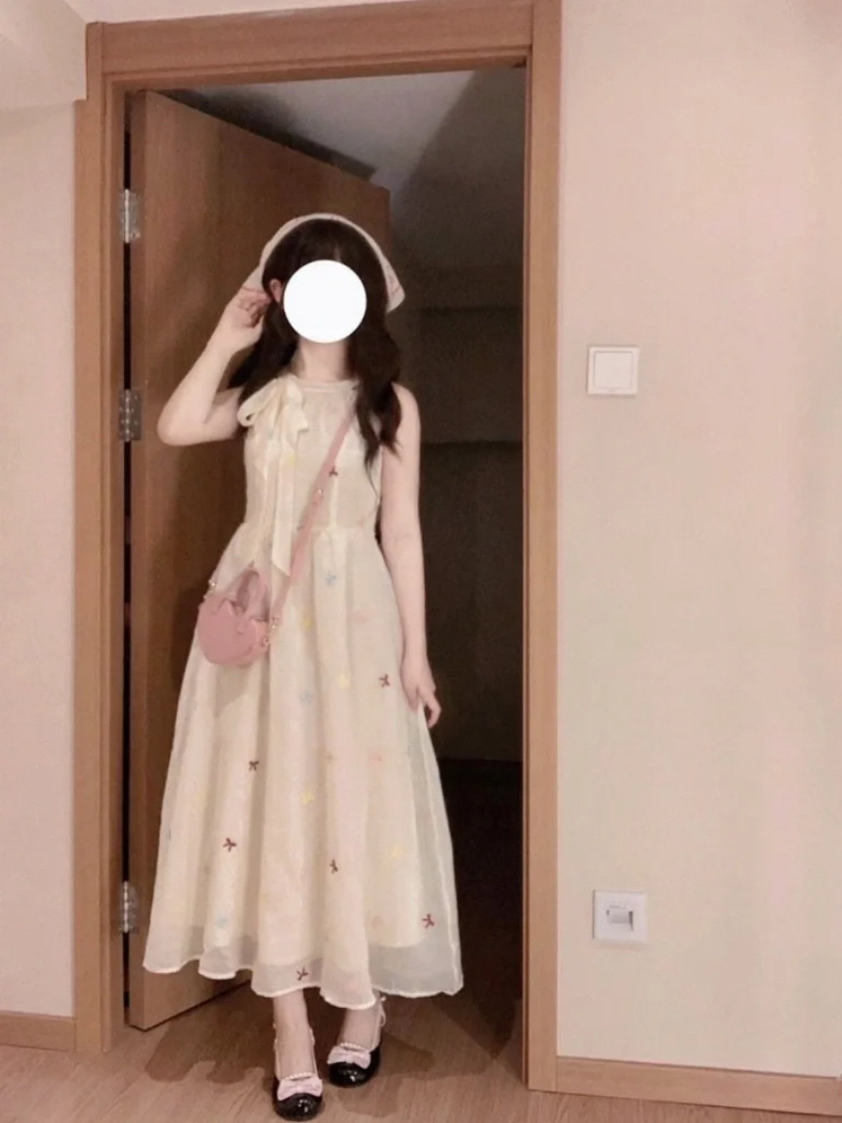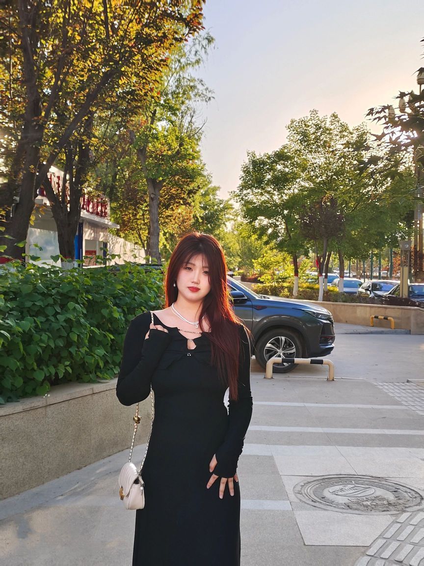 这条裙子是典型的 MiuMiu 女孩专属款,黑白配色经典又显质感。领口做了标志性的娃娃领设计,边缘缀着细白边,甜妹感直接拉满;裙摆是微蓬的 A 字版型,长度到膝盖上方,既能遮住胯部肉肉,又能露出纤细小腿,显高又显瘦。面料是带点挺括的棉质,不会软塌塌贴在身上,走动时裙摆会轻轻晃动,灵动又减龄。