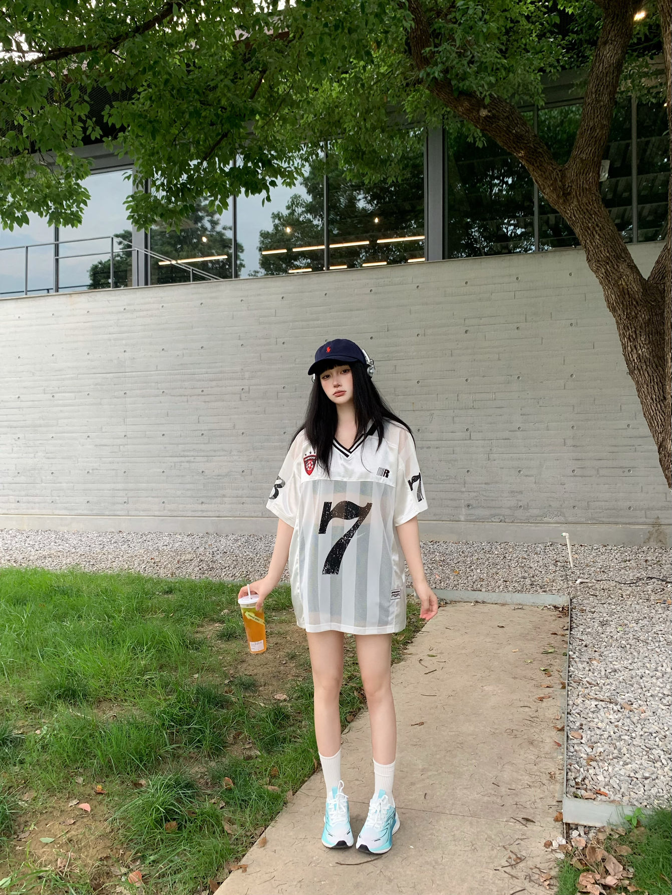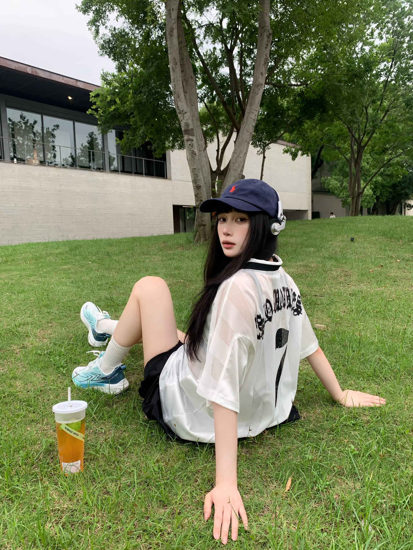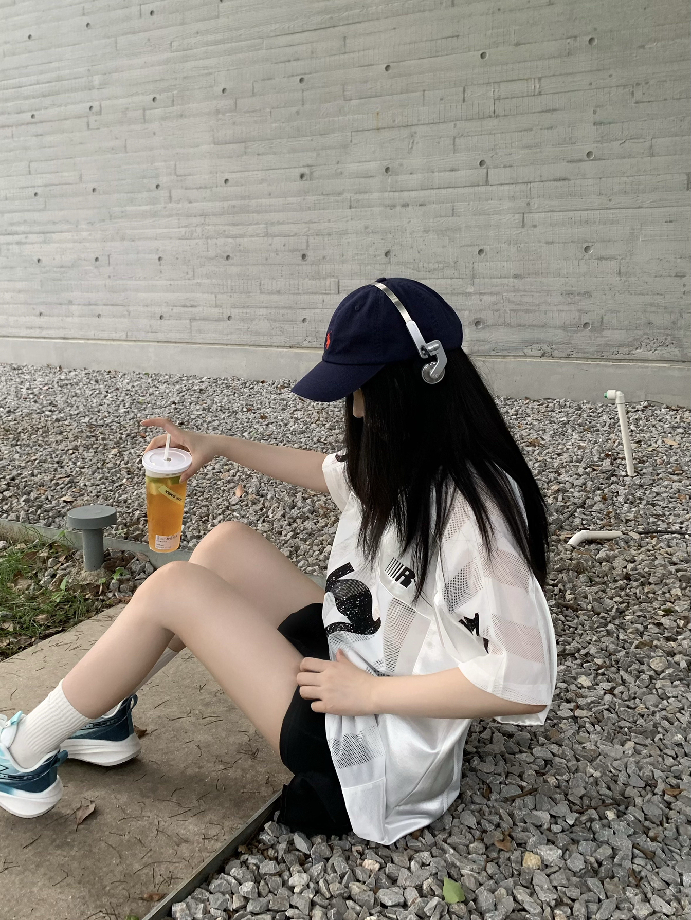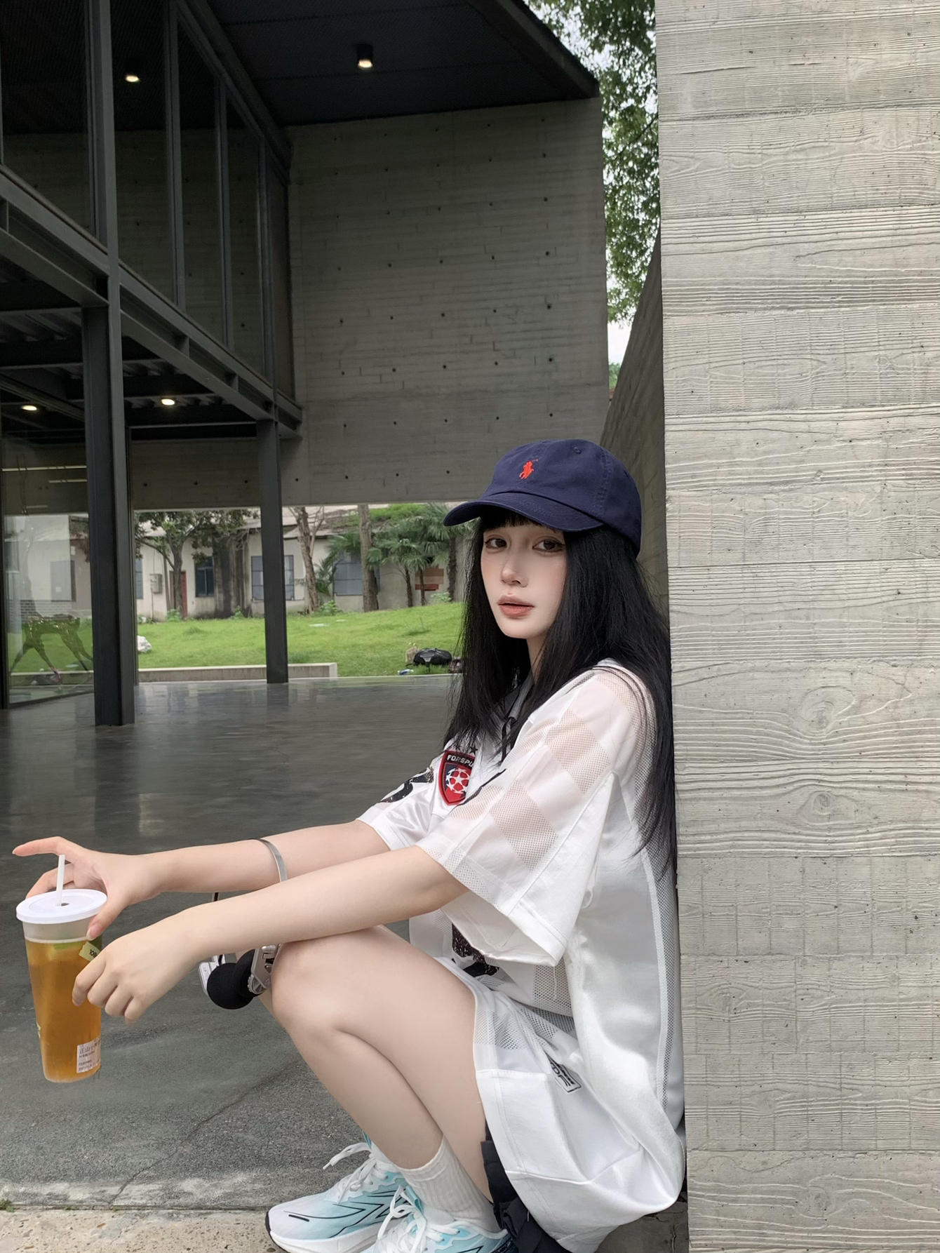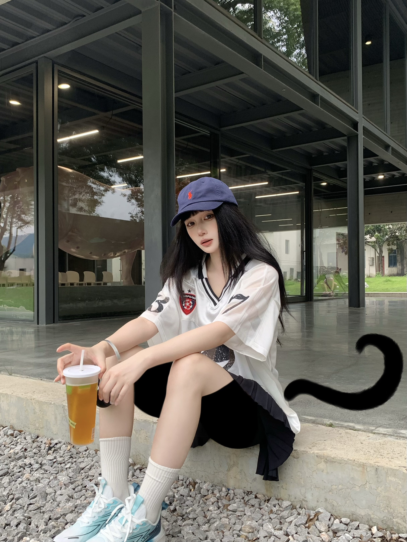 今日是潮流又吸晴的穿搭 穿白色网状白球衣又潮又透气 搭配黑色运动裙活力满满 戴着百搭的帽子配饰出街 户外活动这么穿舒适