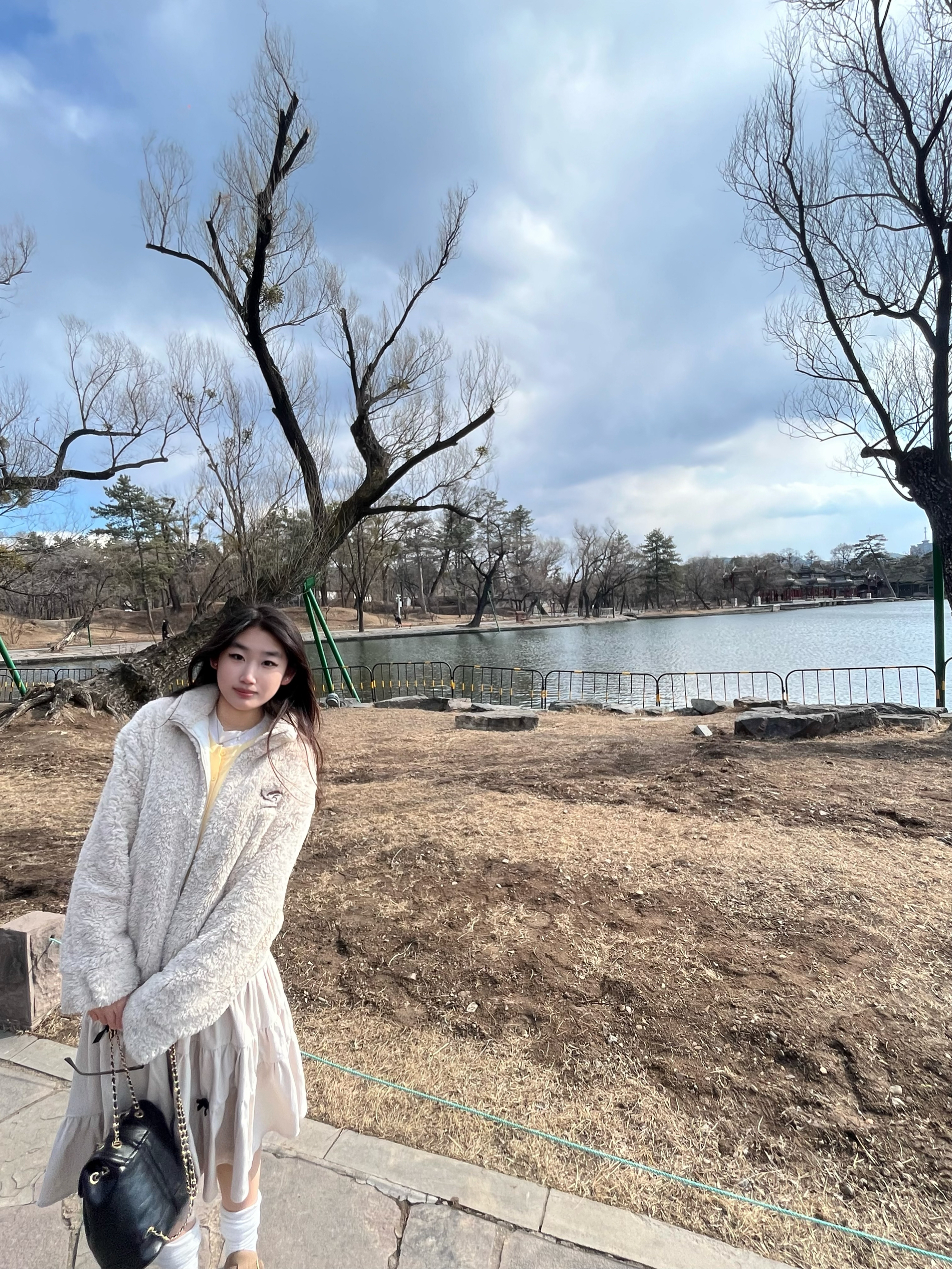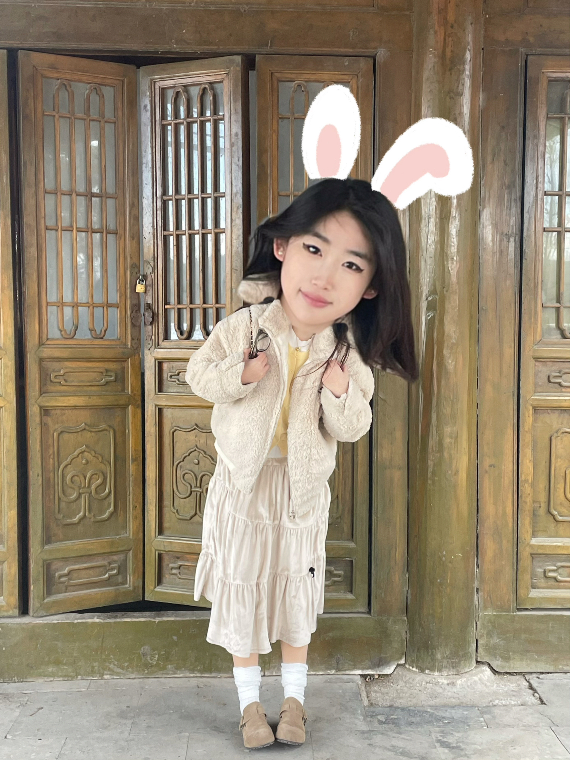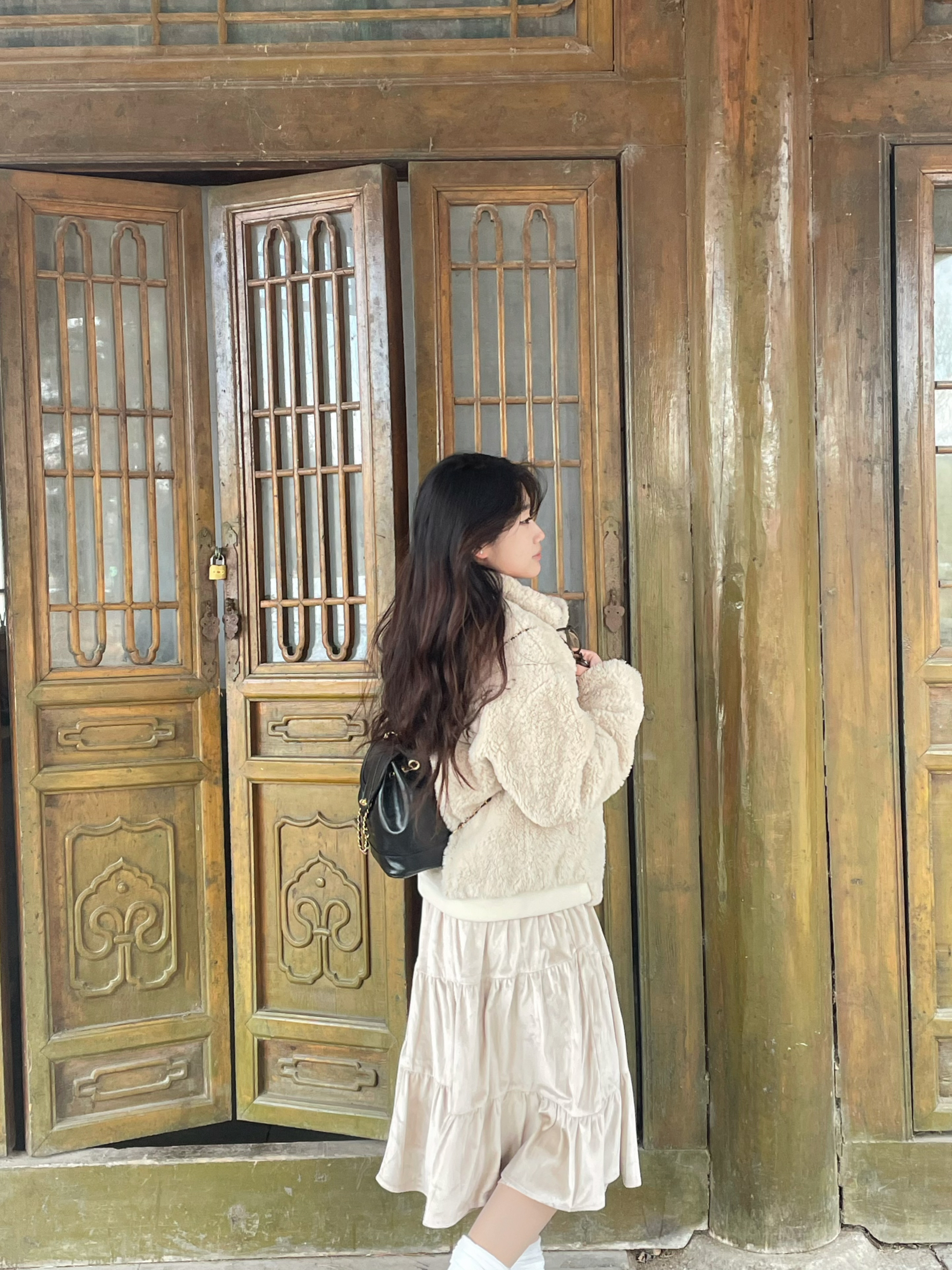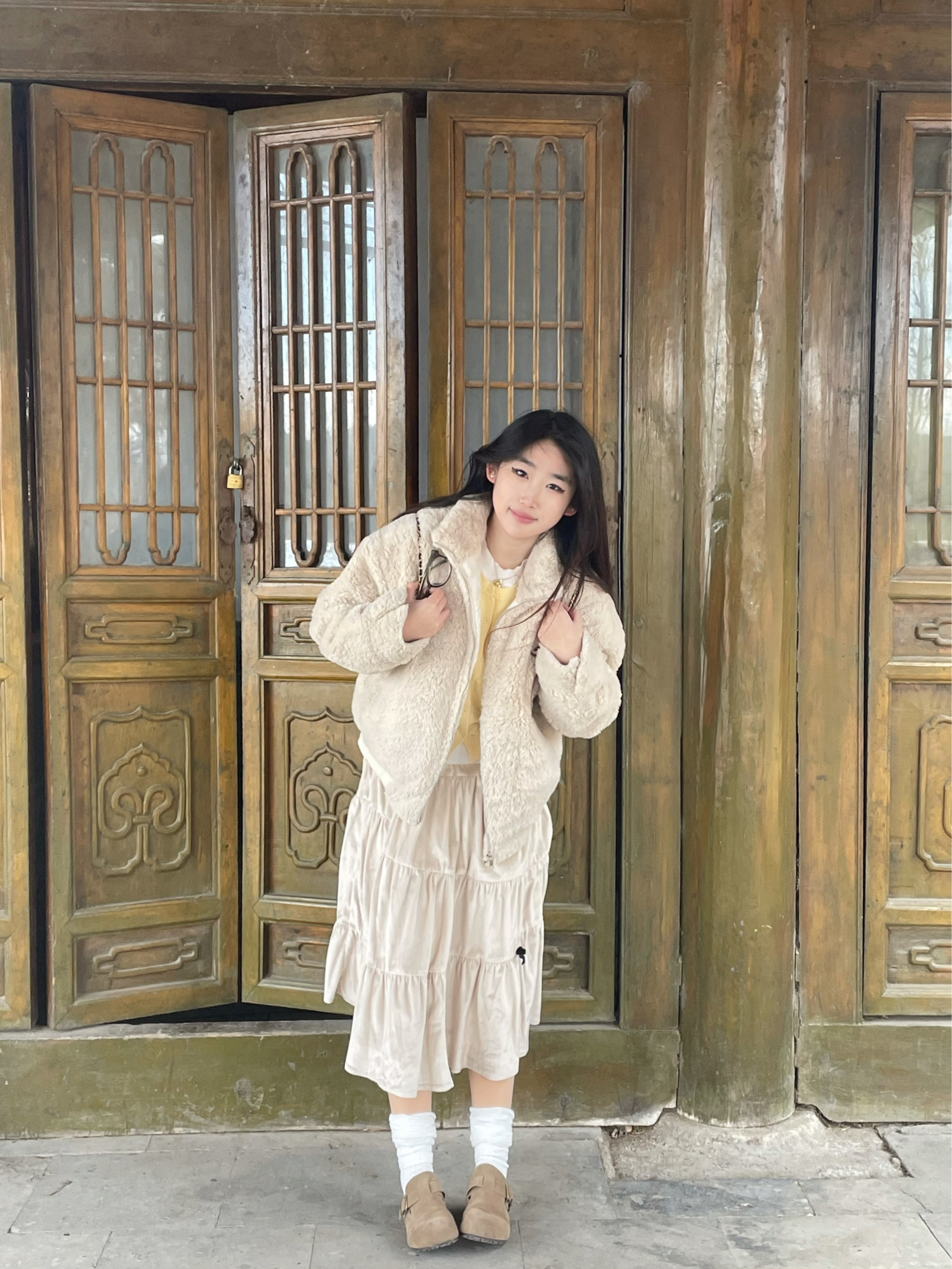 这套穿搭是温柔系的冬日浪漫范本~米白色羊羔毛外套软糯保暖,搭配同色系丝绒蛋糕裙,层次与质感兼具。内搭鹅黄针织衫点亮整体,白色堆堆袜配棕色小皮鞋增添复古俏皮,再挎上黑色链条包,在中式木门的映衬下,甜系与复古感碰撞,尽显慵懒又精致的冬日氛围感。