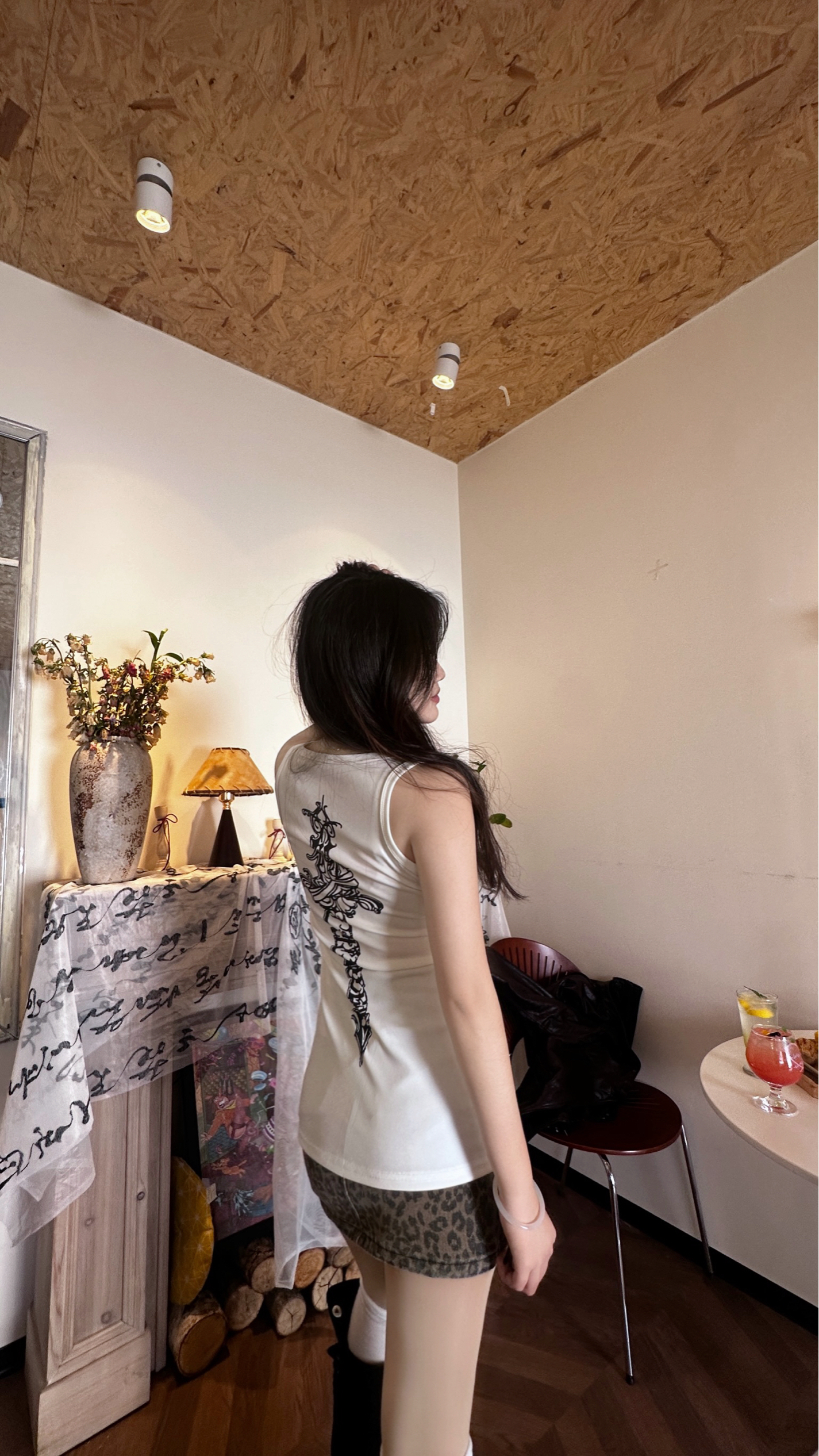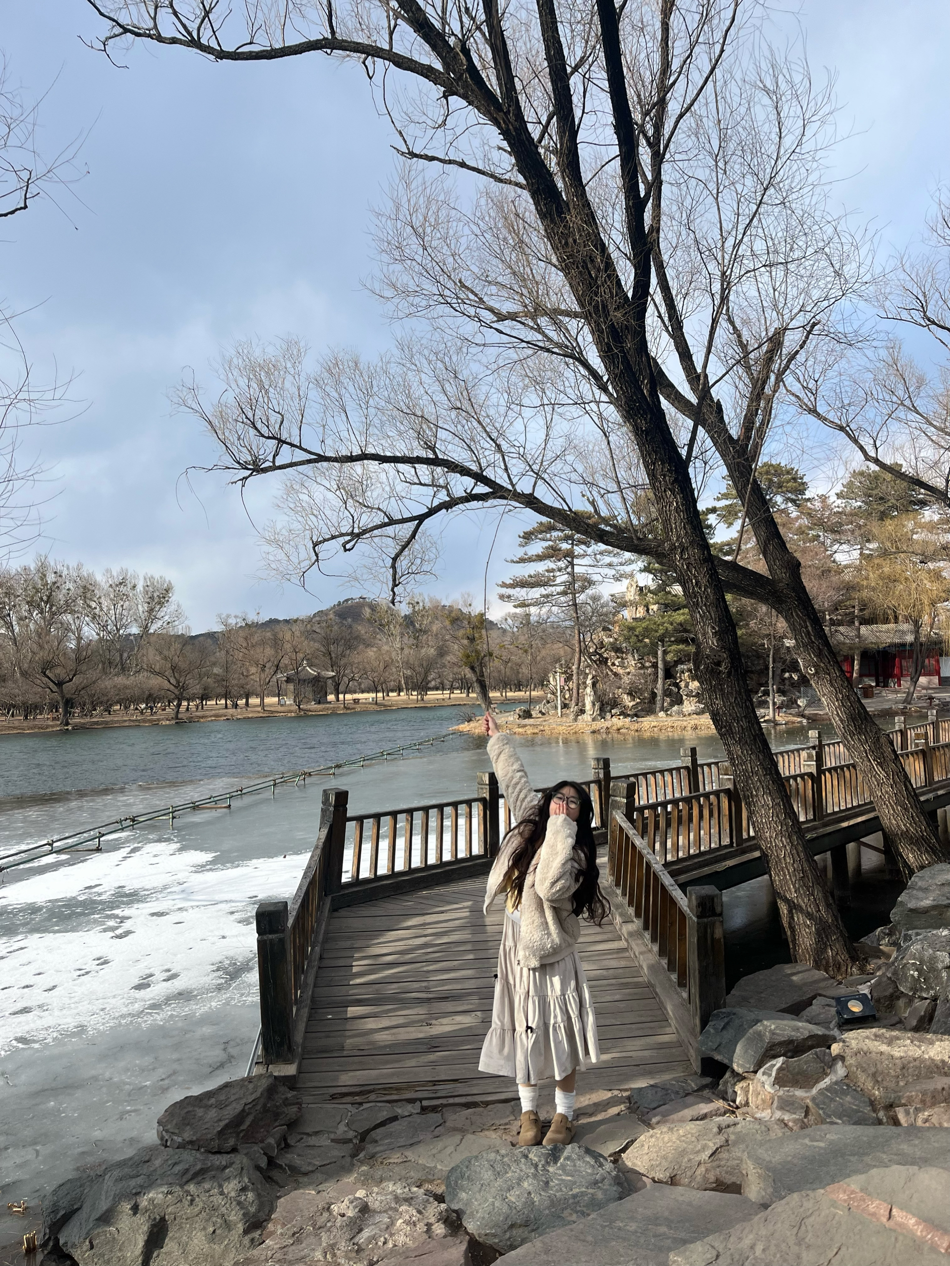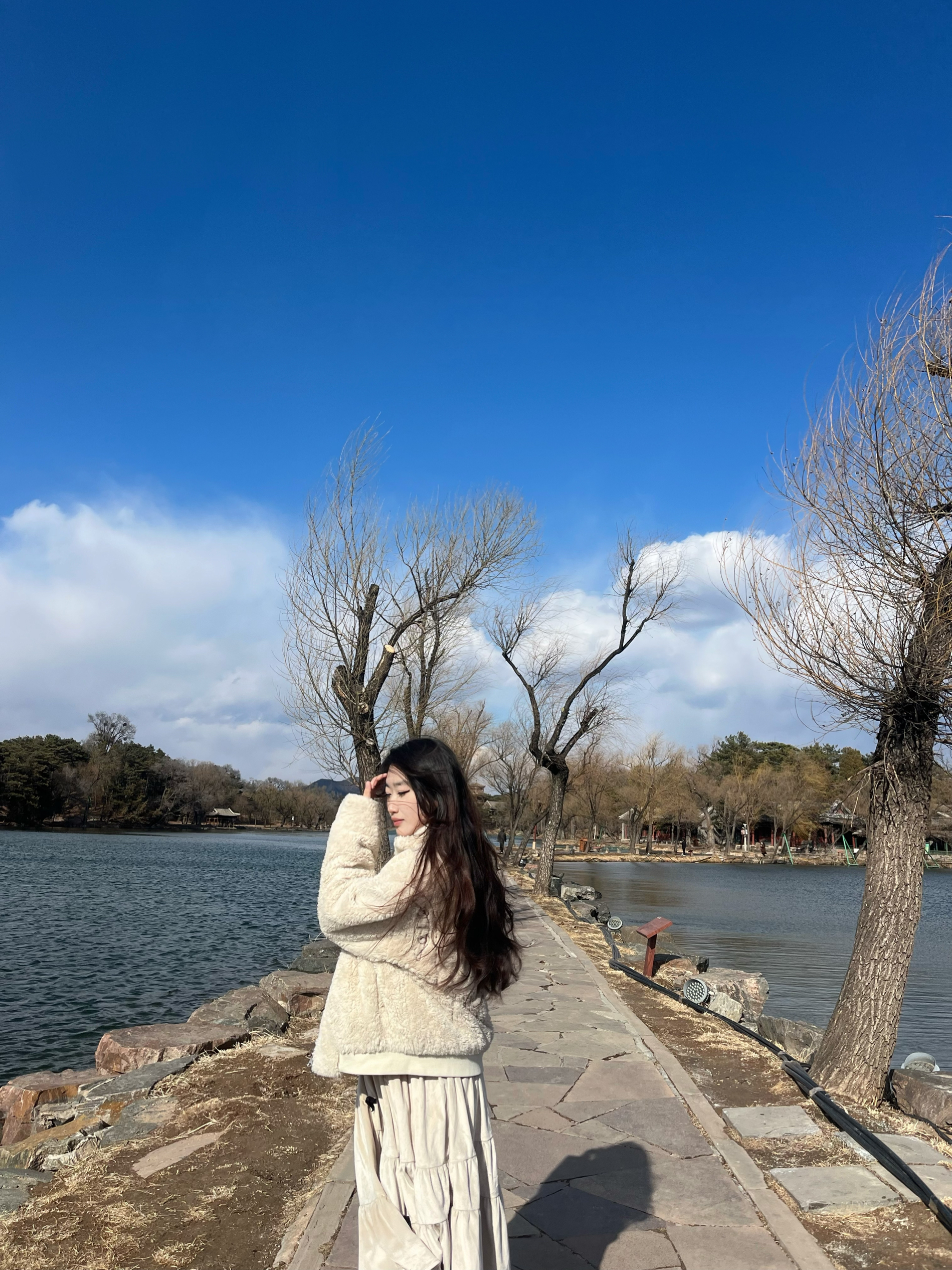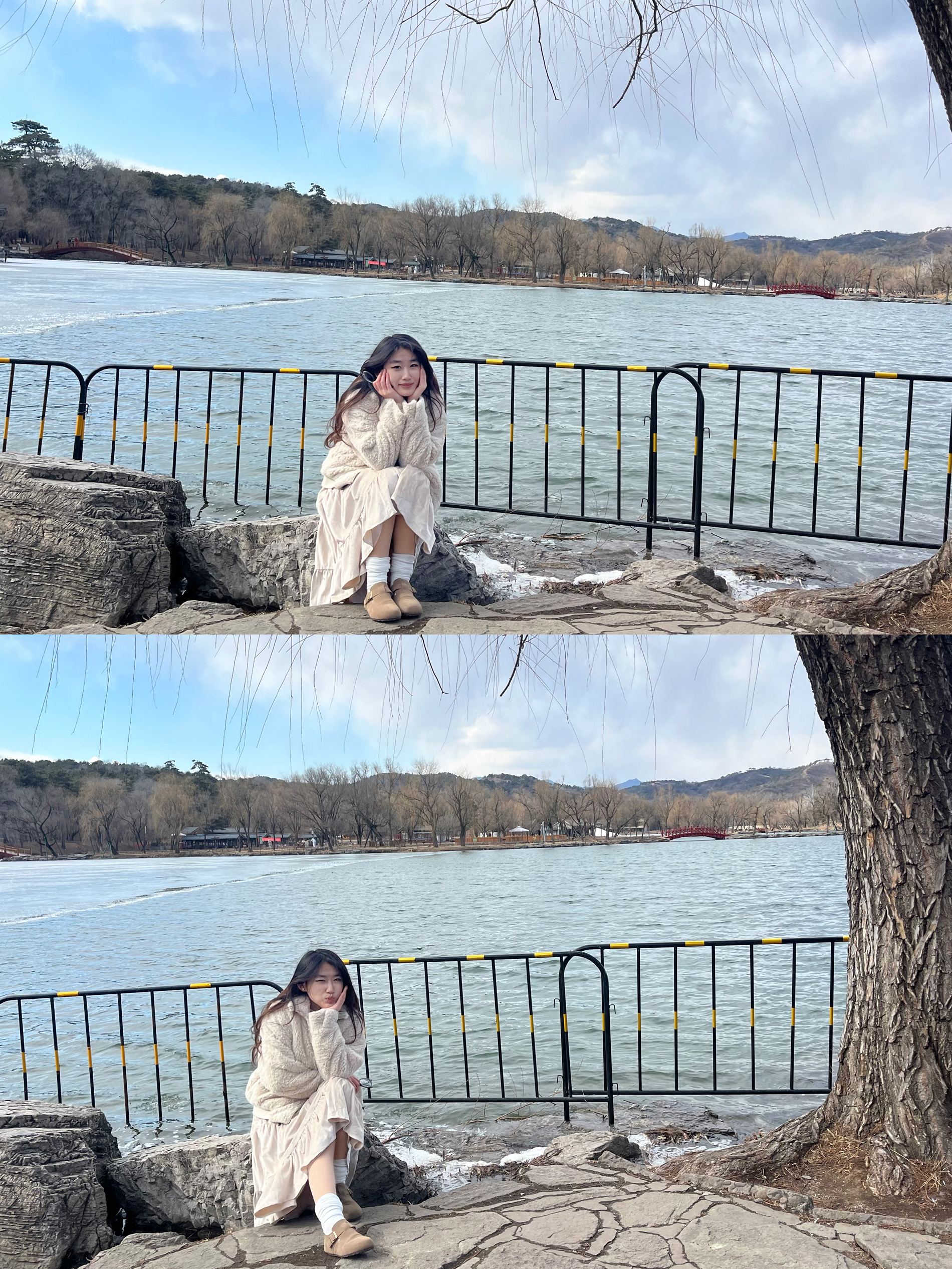 这套穿搭是温柔系的冬日浪漫范本~米白色羊羔毛外套软糯保暖,搭配同色系丝绒蛋糕裙,层次与质感兼具。内搭鹅黄针织衫点亮整体,白色堆堆袜配棕色小皮鞋增添复古俏皮,再挎上黑色链条包,在中式木门的映衬下,甜系与复古感碰撞,尽显慵懒又精致的冬日氛围感。
