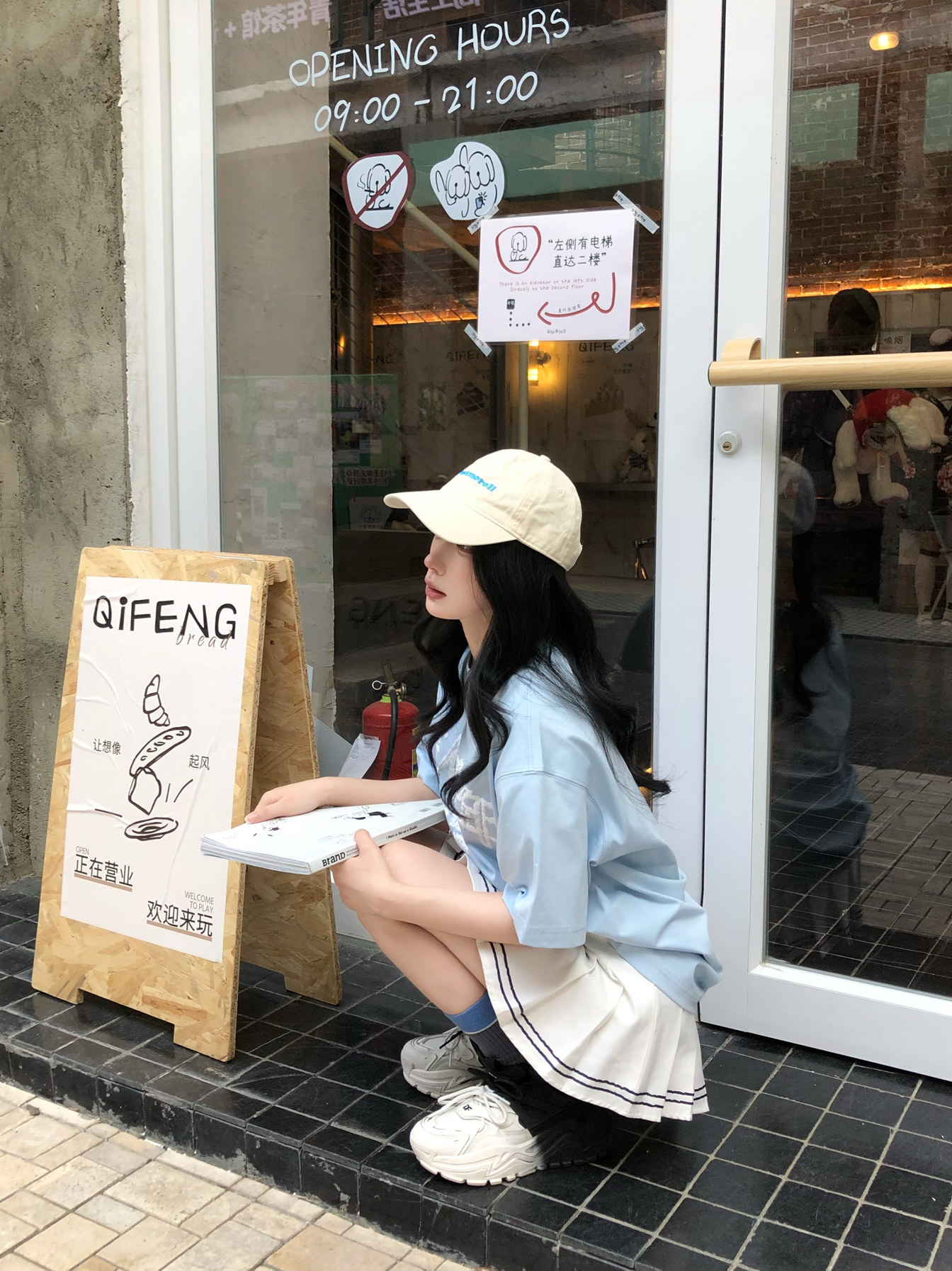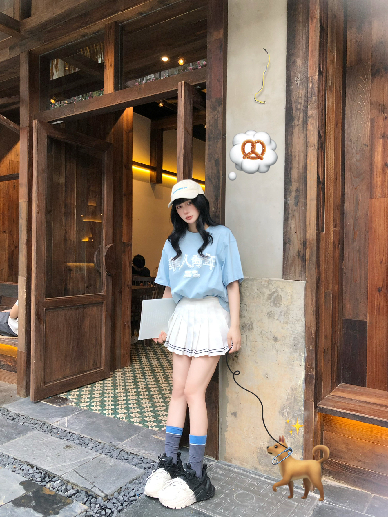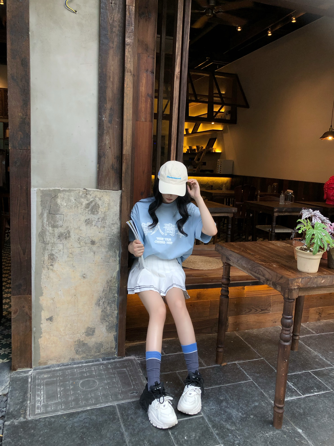 青春活力感的校园风穿搭来咯😋 蓝色的华人青年云朵短袖好治愈☺️ 上身舒适百搭 我162穿m挺宽松的 搭配白色百褶裙满满的学院风~ 鞋子是黛西法罗的老爹鞋👟 整套look百搭又潮流🥰