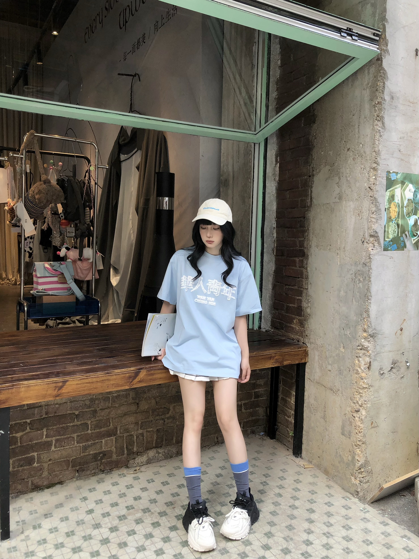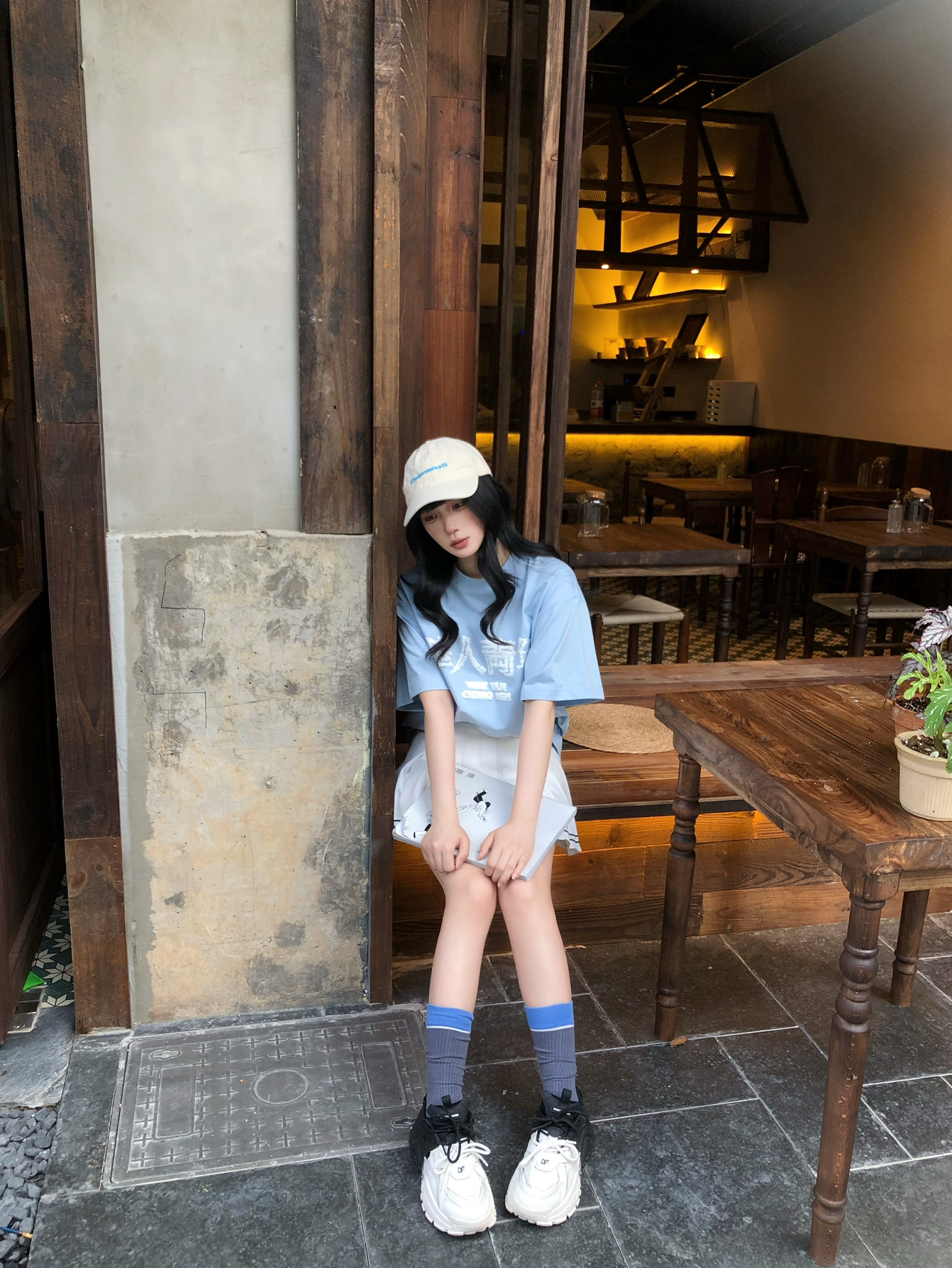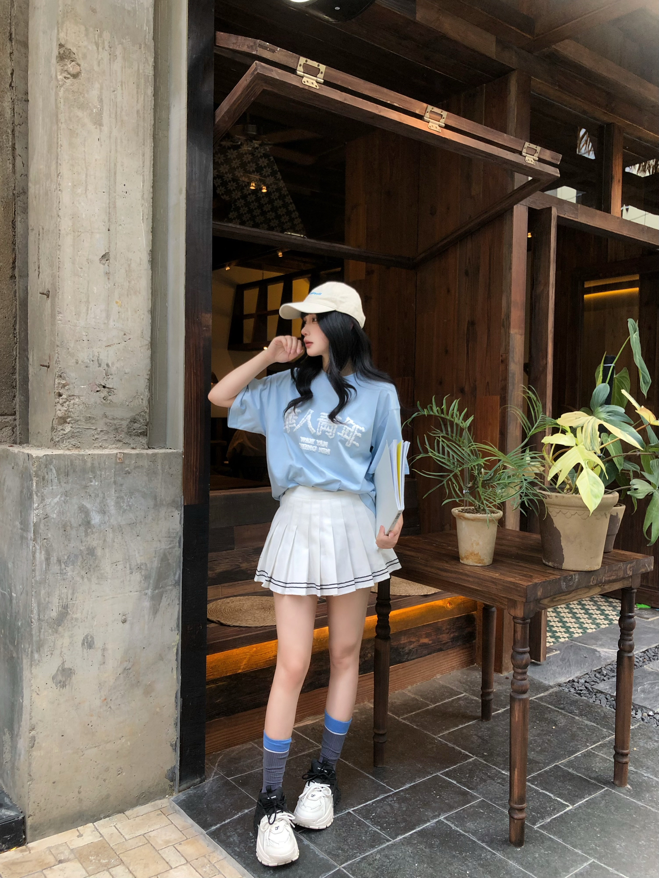 青春活力感的校园风穿搭来咯😋 蓝色的华人青年云朵短袖好治愈☺️ 上身舒适百搭 我162穿m挺宽松的 搭配白色百褶裙满满的学院风~ 鞋子是黛西法罗的老爹鞋👟 整套look百搭又潮流🥰