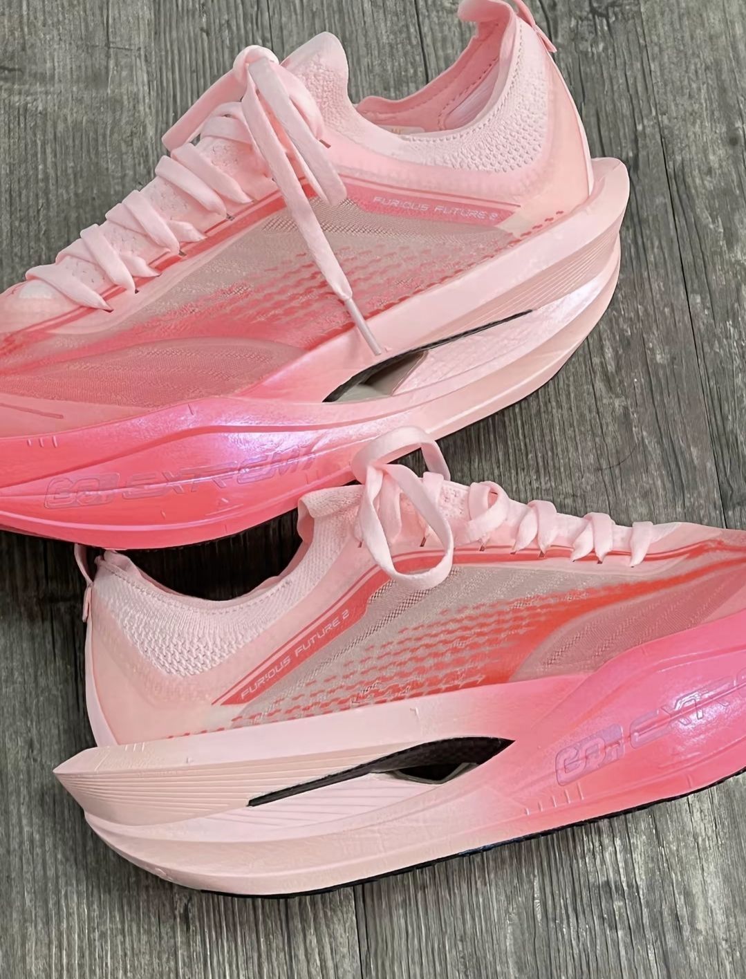 子的飞飚future二代 这个丘比特渐变粉老夫的少女心被拿捏了 这个配色猛男可以放心冲💪🏻 这一代的中底双密度的叠加 是软弹的脚感 不是傻软的那种 全掌局部加厚的碳板 刚性不是很强 驾驭门相较于上一代槛降低了 碳丝的鞋面结合弹性袜套鞋舌 透气和舒适性都不错的 RPU大底耐磨抓地表现依旧在线 缺点刚开始的时候有点响 尺码方面正常选择就可以~