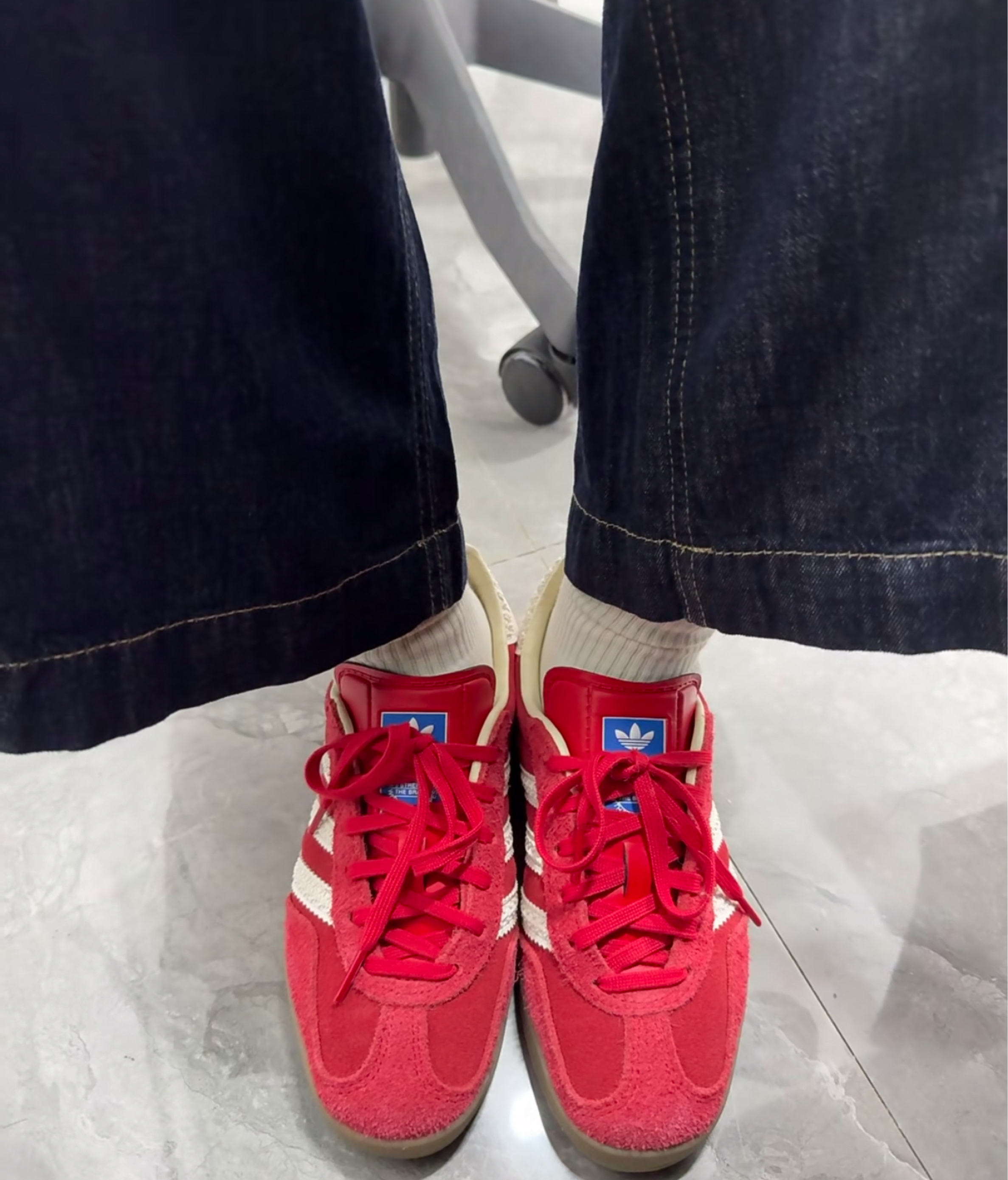德训鞋的天下来了~ 红色真的很能打 而且还是一挑十的那种 真的好好看 颜色虽然很亮但是还是很好配裤子的~ 📝 优点:颜色特别正 非常好看又好搭配 鞋底软脚感很好 缺点:麂皮的设计可能会不好打理和褪色的可能性,鞋舌比较长容易跑来跑去。(美貌让我看不清缺点😂)