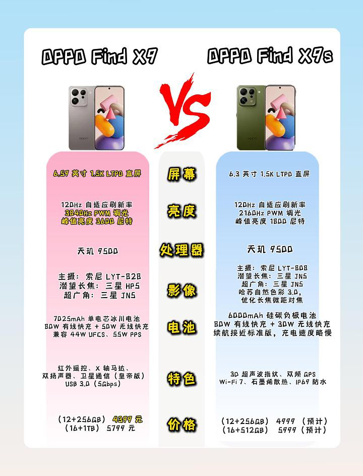 OPPO Find X9 与 Find X9s 的同系列对决即将拉开帷幕,作为迭代款的 X9s 在传承基础上暗藏不少升级巧思,两款机型的差异点足以让用户根据需求精准选择。 影像仍是核心看点。Find X9 搭载 2 亿像素主摄与独立原色镜头,凭借成熟的色彩校准算法,直出画面能精准还原场景本真质感,尤其适合追求 “所见即所得” 的日常记录者。Find X9s 则在此基础上新增一颗 85mm 长焦镜...