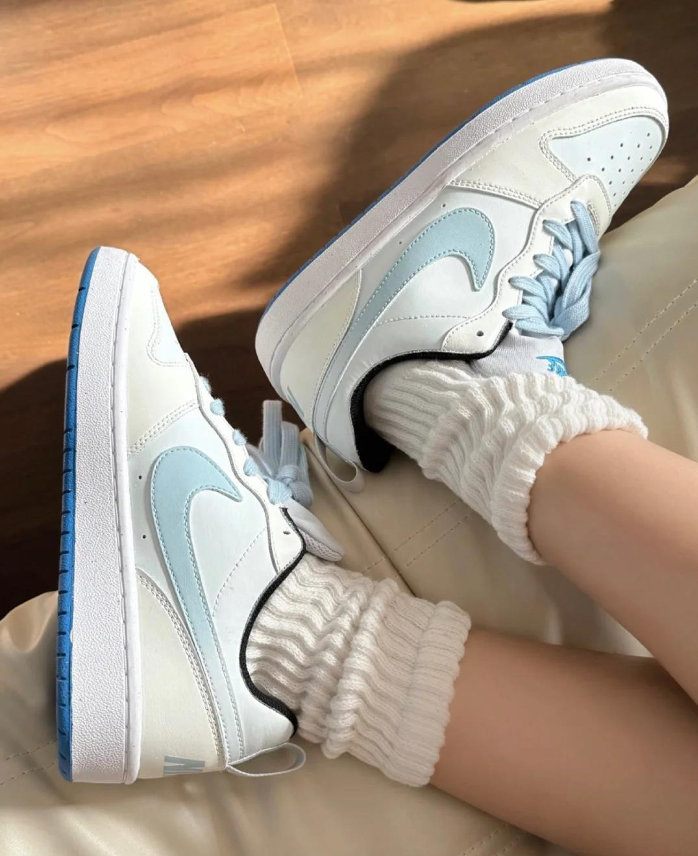 这奶白加冰蓝的搭配也太戳少女心了吧!鞋身质感细腻,耐克勾的渐变设计很有层次,配我那件浅蓝色卫衣绝绝子,日常穿出去喝咖啡、逛书店,被问了好几次链接。低帮版型特别显脚腕细,穿长袜短袜都好看,属于那种‘随便一搭就很日系清新’的款。 之前买的小白鞋要么容易脏要么硬邦邦,这双我穿了一周,鞋面几乎没怎么脏,而且脚感软乎乎的,上次逛了一下午文创店,脚也没喊累。皮质很透气,现在这个季节穿刚好,不会闷脚。 耐克...