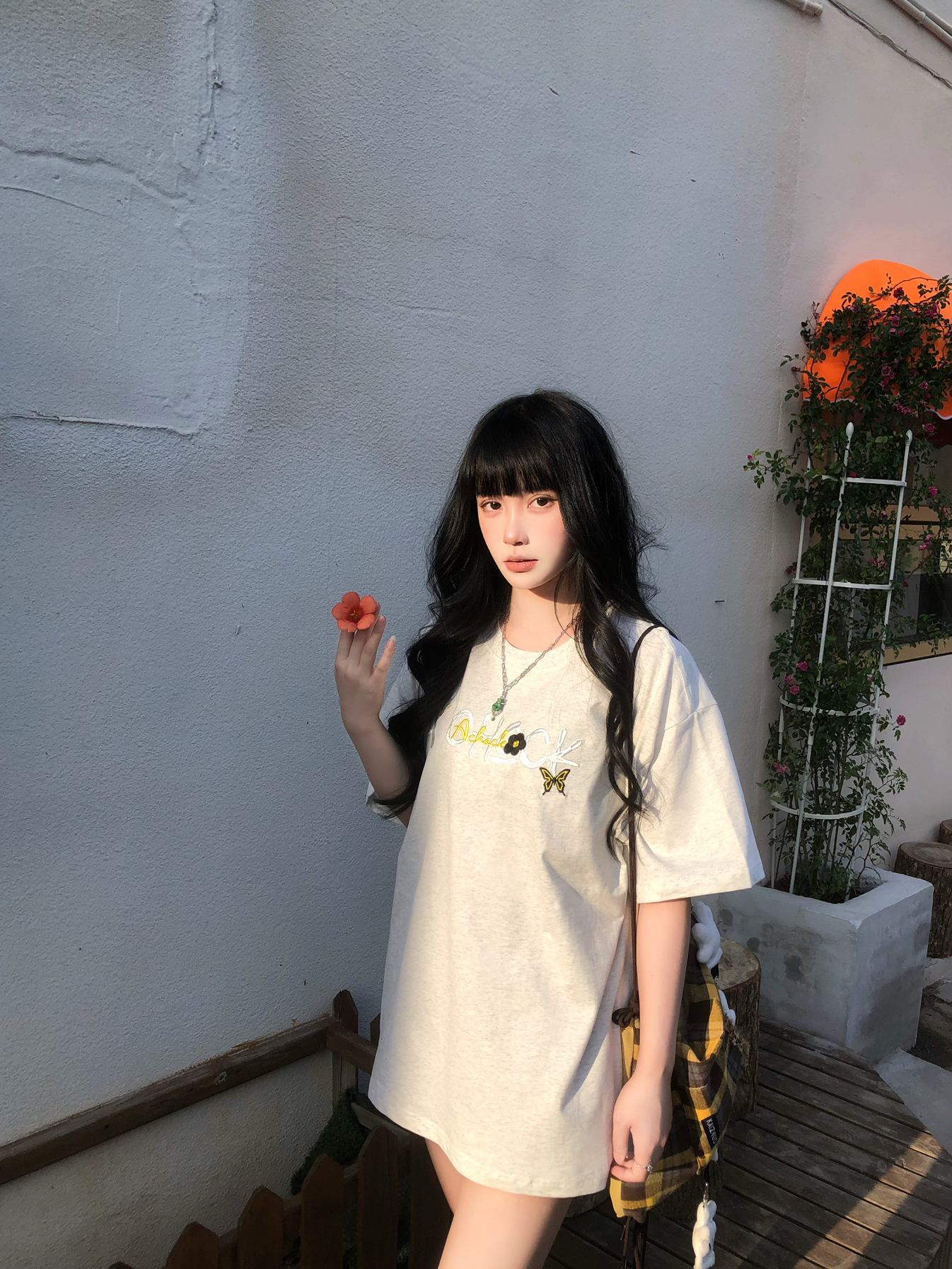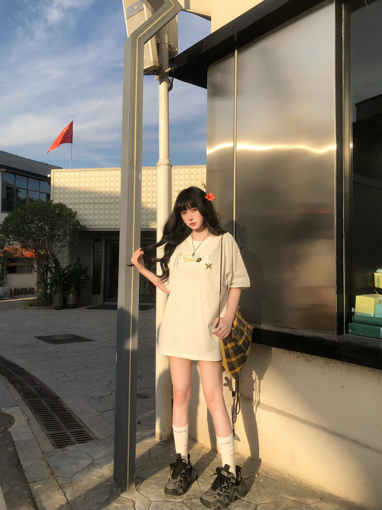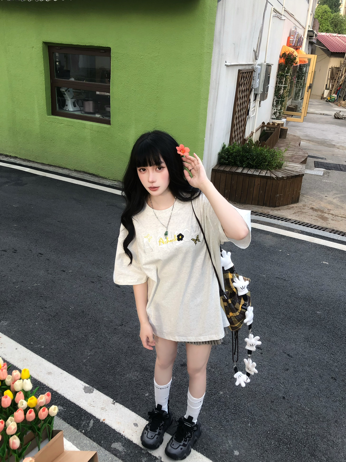 纯穿搭不吃建模版来咯🥹 简约的A chock美式灰T搭配百褶裙 我162穿L挺宽松的 满满的松弛感🥰 搭配格子包配饰很加分