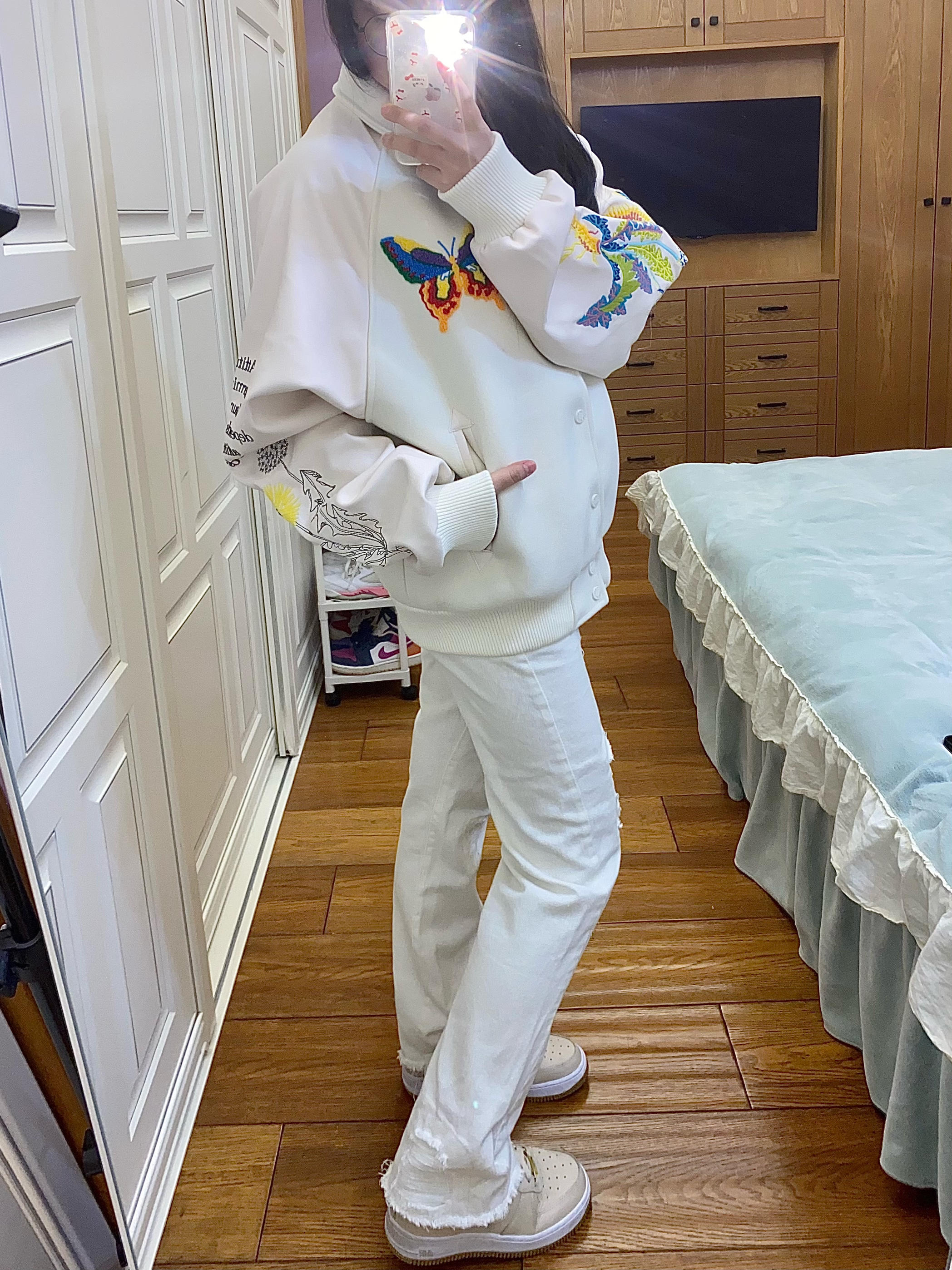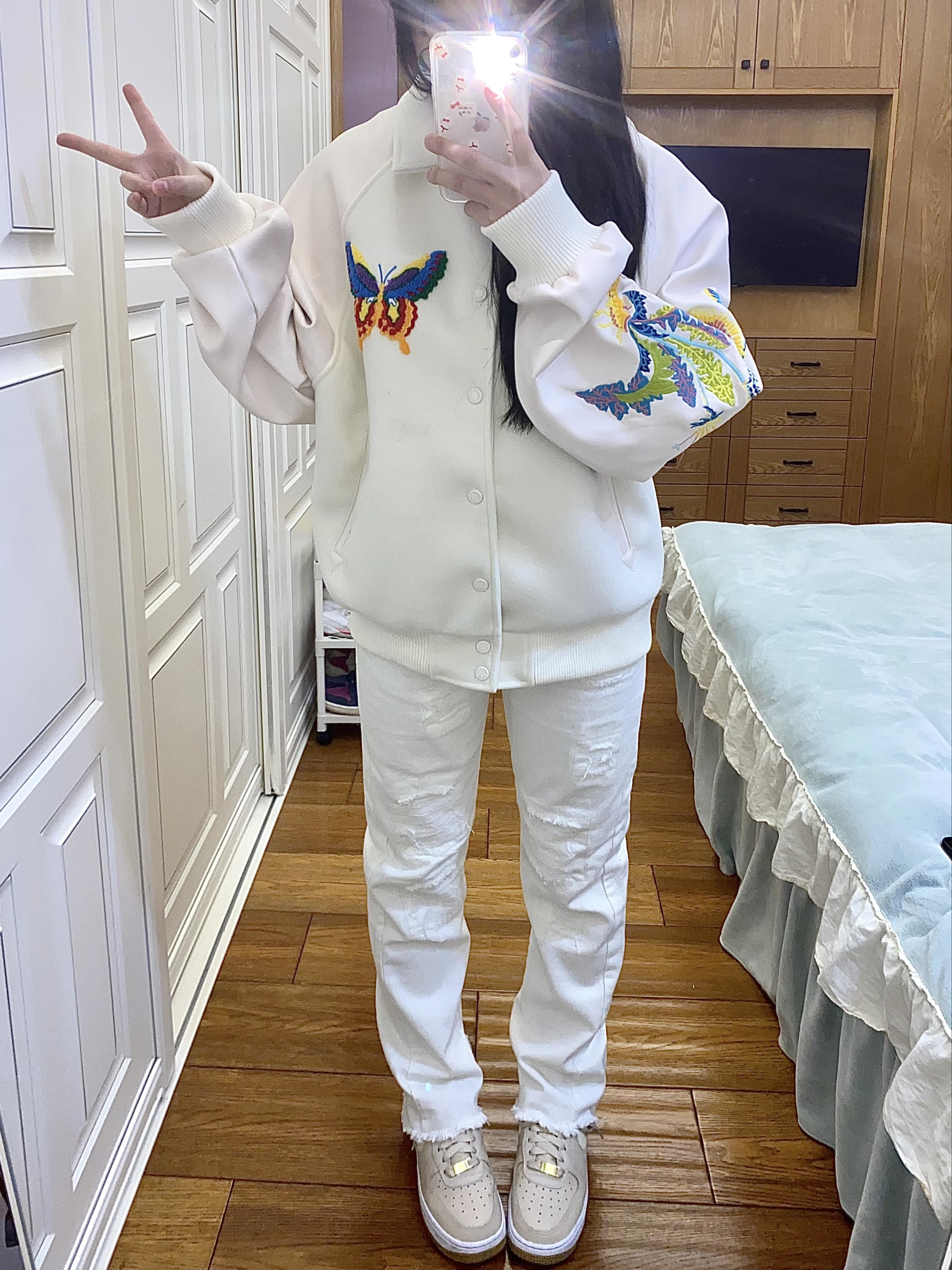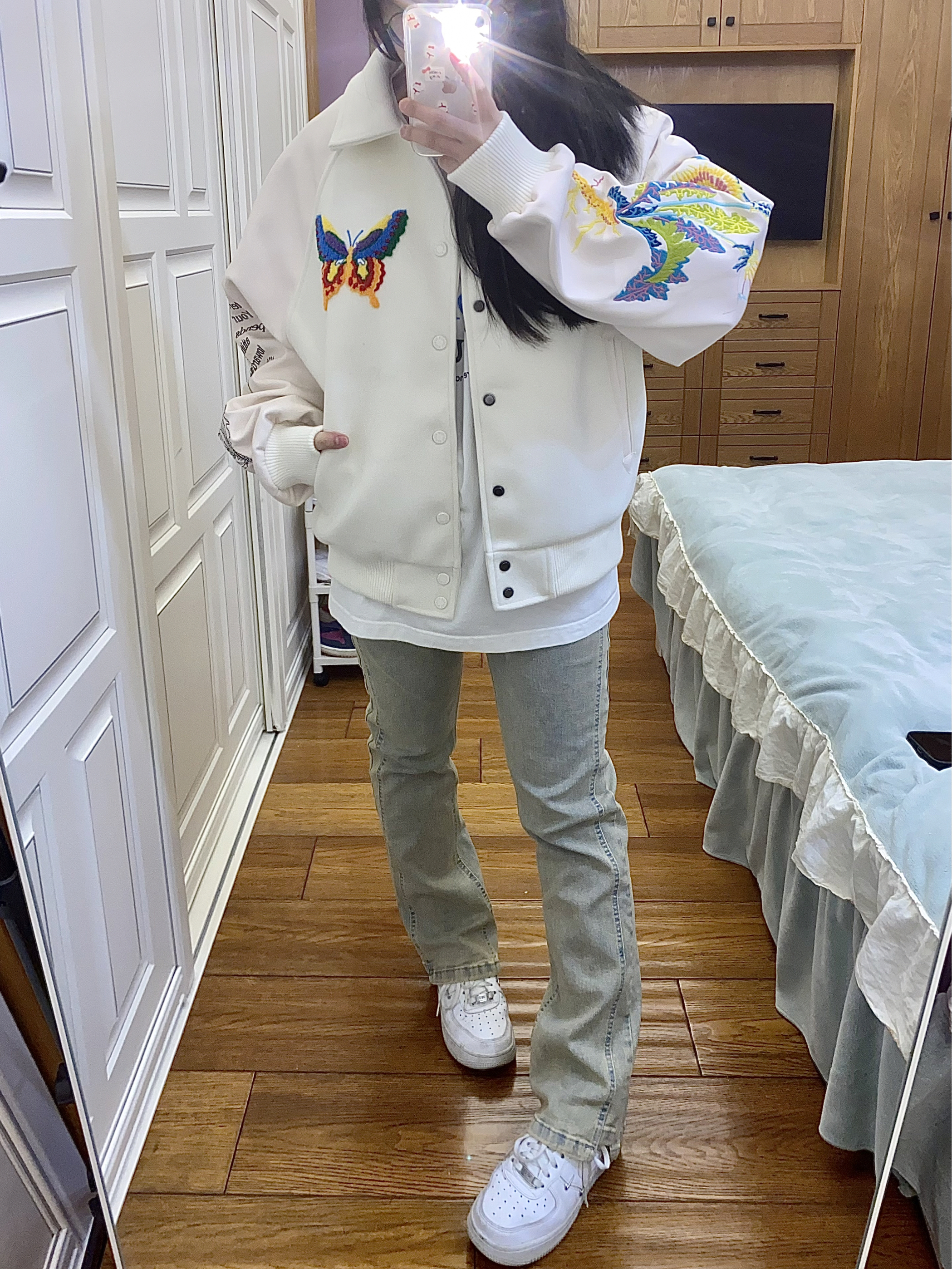 今日份穿搭分享来啦! 又是一套米白色系穿搭 这件棒球服真的很好看! 刺绣做的都很高级 色彩搭配也很好看 我就随便搭配了一条白色牛仔裤! 根本盖不住棒球服的风采哈哈哈