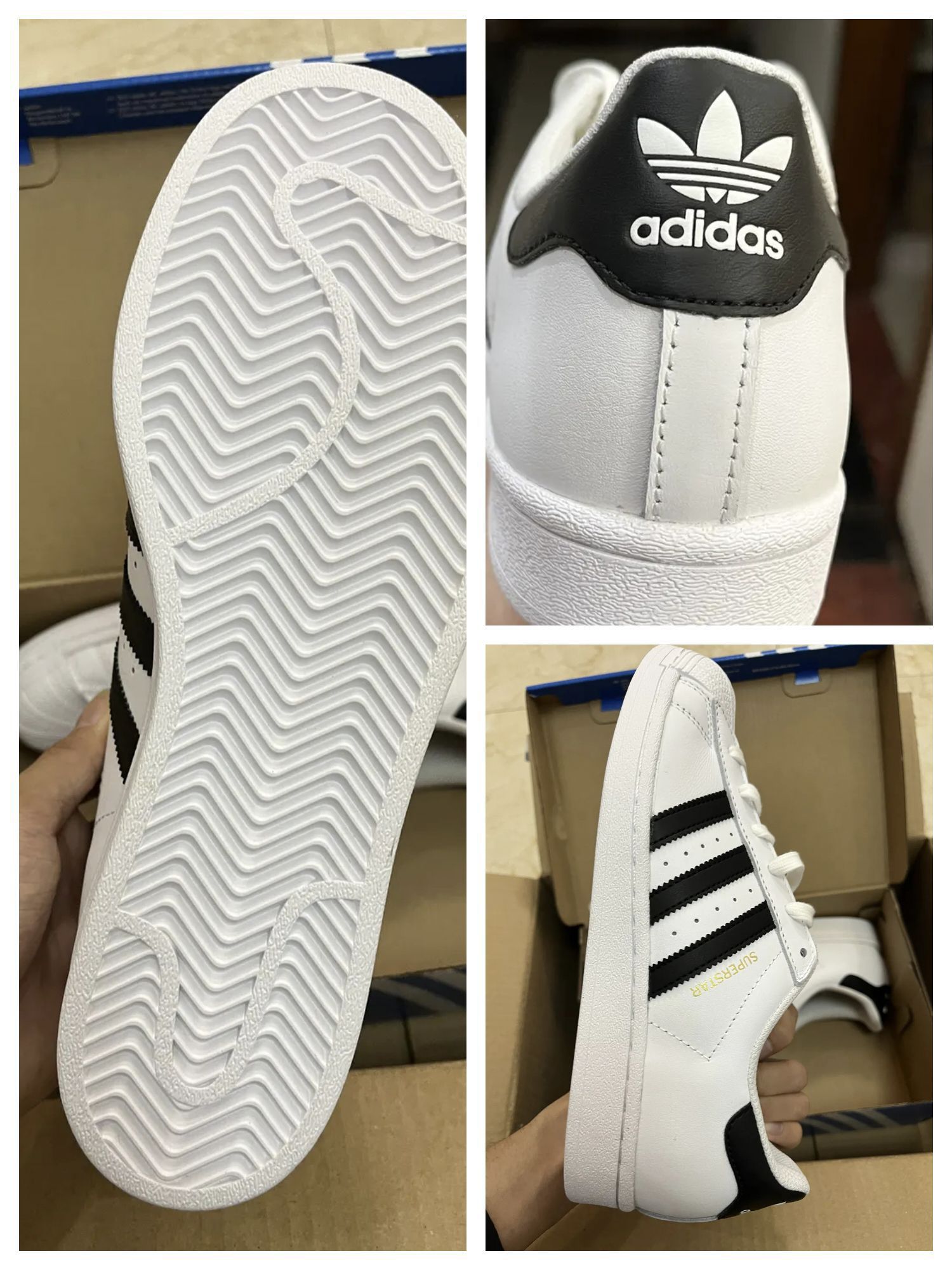 - 设计特征:以白色皮革为主体,搭配黑色三道杠和黑色后跟片,后跟片印有阿迪达斯三叶草标志与品牌名;鞋底为白色波浪纹设计,鞋头采用标志性贝壳状包边,侧面印有“SUPERSTAR”字样。