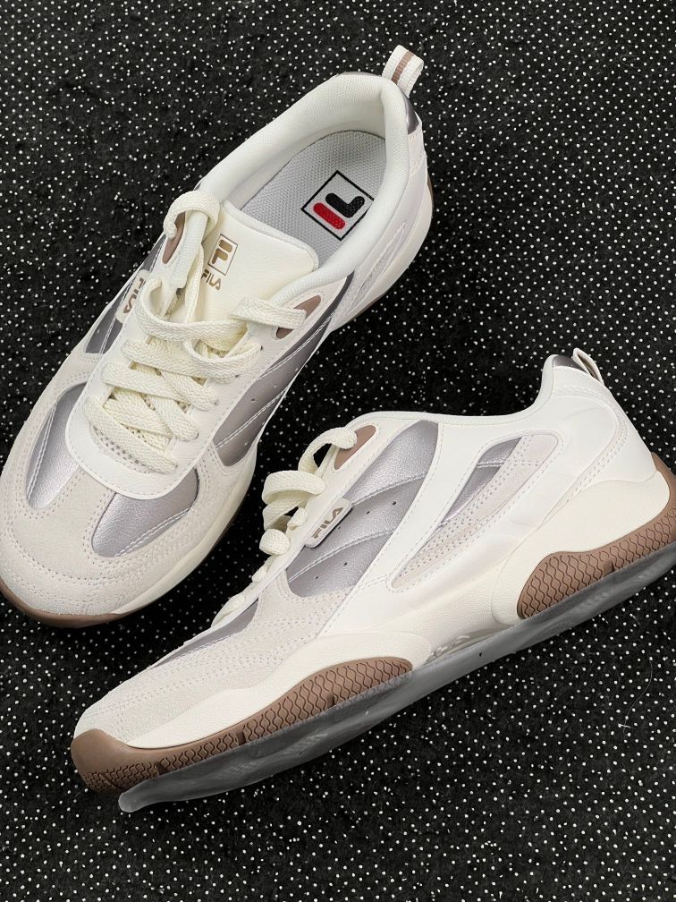 宝子们,斐乐这双运动鞋真的绝绝子! 米白主色调搭配银色、咖色元素,简约又高级,轻松拿捏时尚感 鞋面材质细腻,质感满满, 走线工整细节拉满 鞋底软弹又防滑,走路不累脚 无论是日常通勤还是运动出街,都超适配,闭眼冲就完事儿!