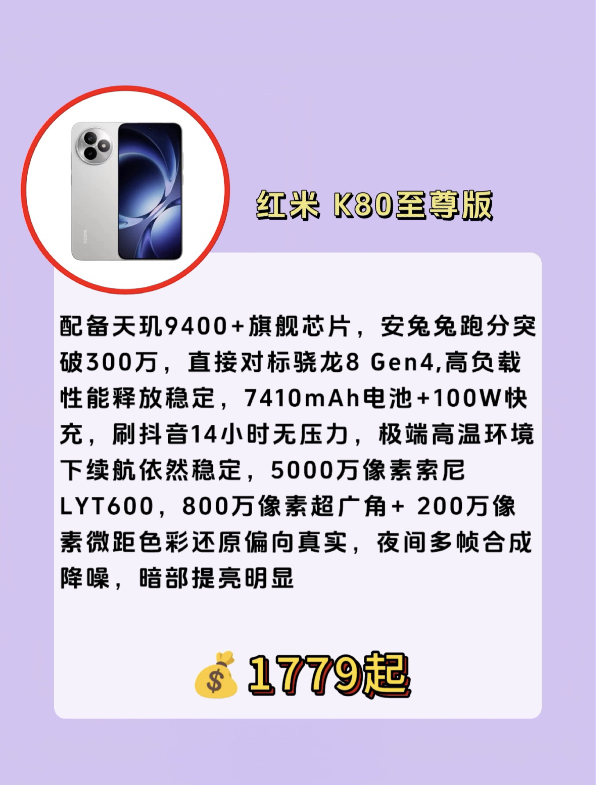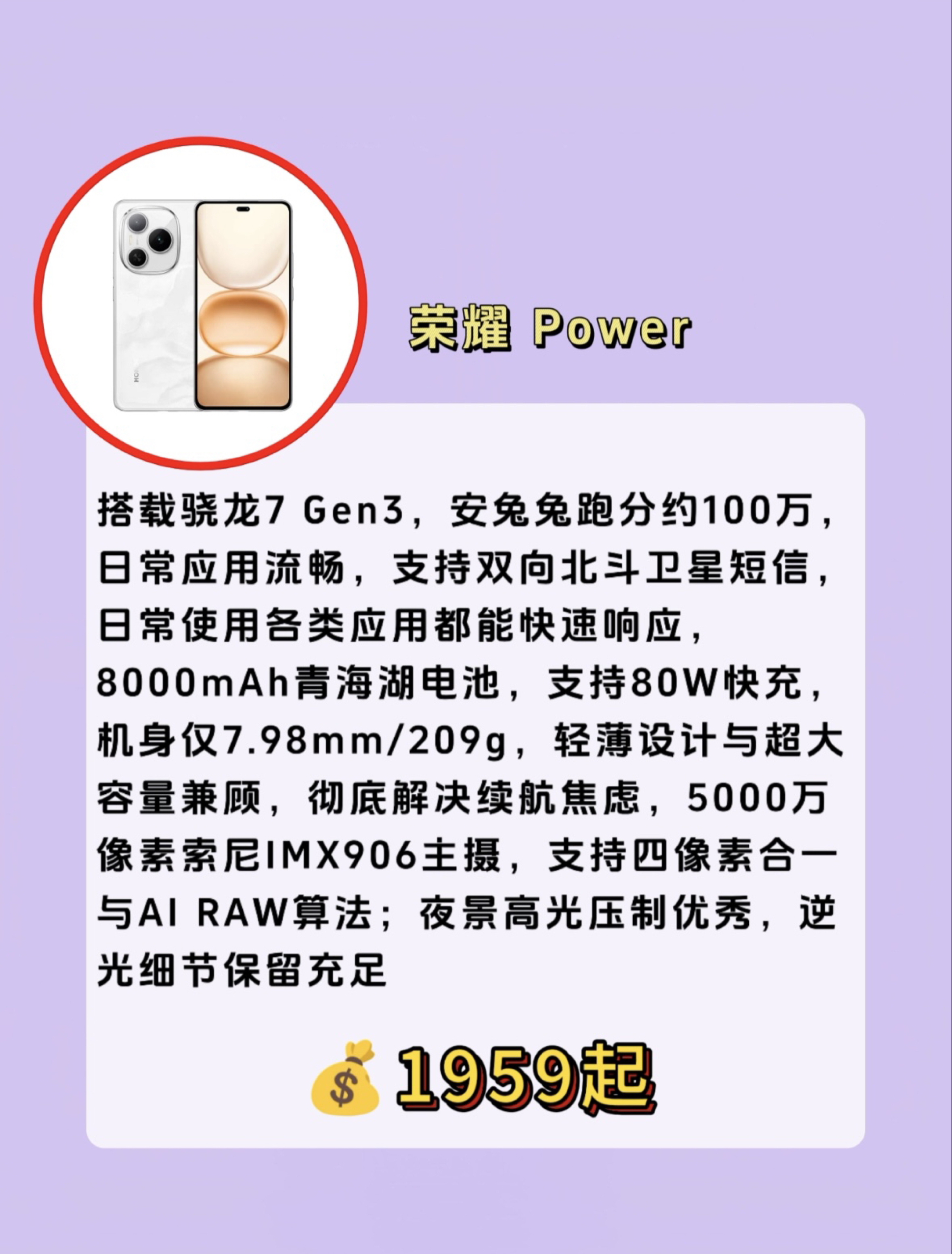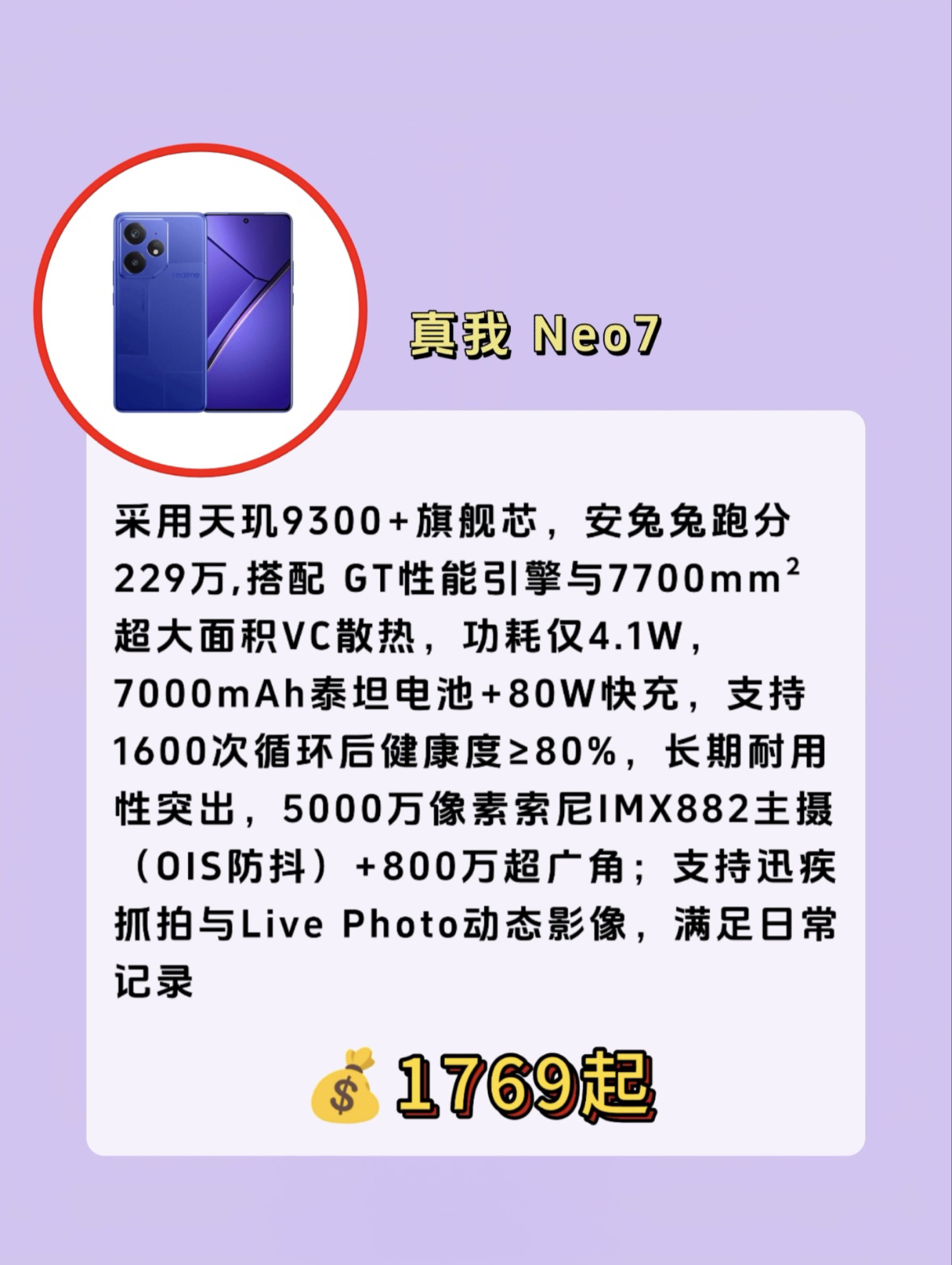 ✅真我 Neo7 采用天玑9300+旗舰芯,安兔兔跑分229万,搭配 GT性能引擎与7700mm²超大面积VC散热,功耗仅4.1W,7000mAh泰坦电池+80W快充,支持1600次循环后健康度≥80%,长期耐用性突出,5000万像素索尼IMX882主摄(OIS防抖)+800万超广角;支持迅疾抓拍与Live Photo动态影像,满足日常记录 ✅一加 Ace5竞速版 首发天玑9400e处理器,安兔...