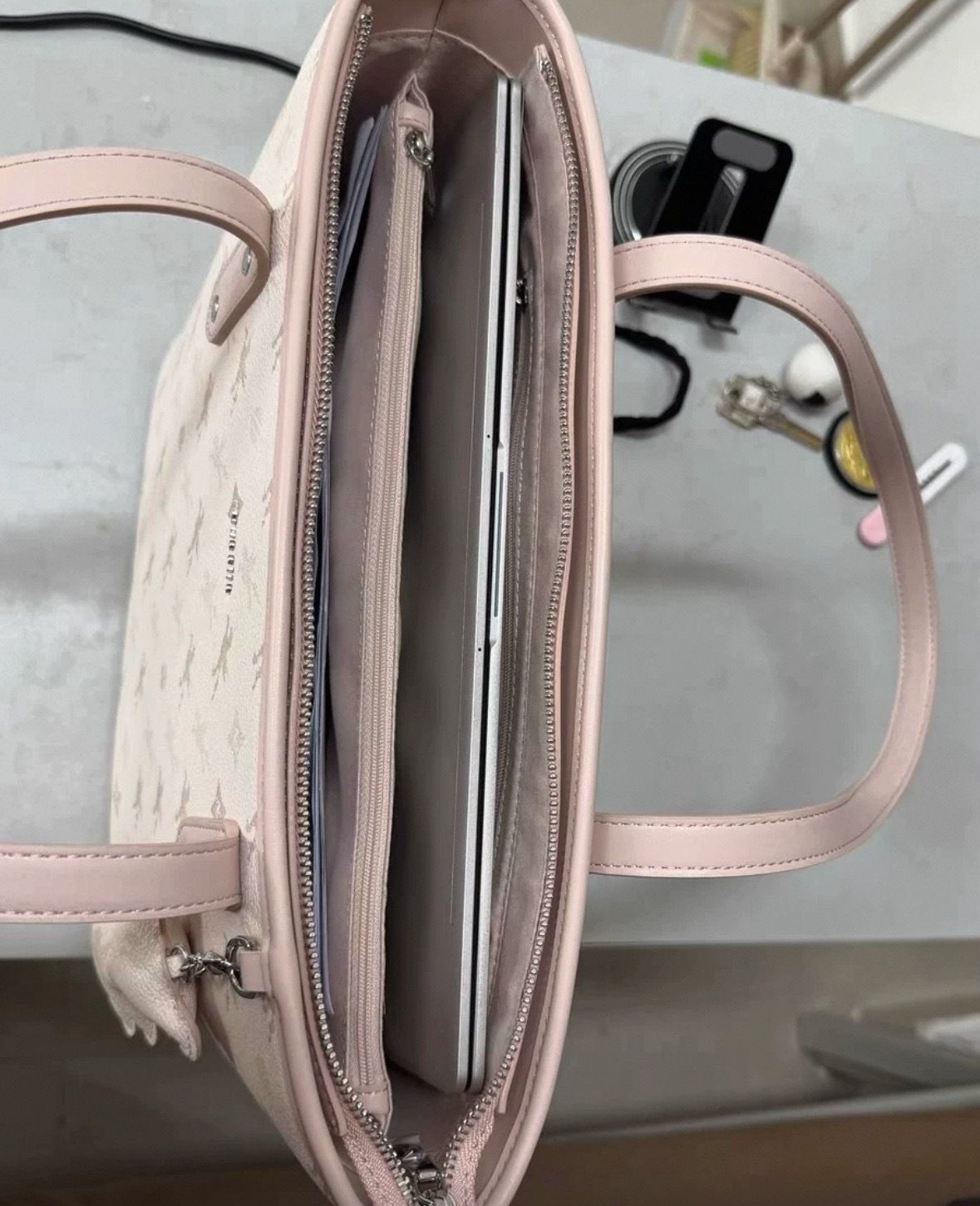 这款手提包是日常出街的甜美“助攻”。 - 风格设计:浅色系老花搭配粉色包边,满印的飞马图案别致又有辨识度,整体是温柔甜美的少女风。搭配洛丽塔风格的小狐狸挂饰,可爱度直接拉满,很适合喜欢甜美风的女生。 - 实用性:托特包型容量可观,能轻松装下笔记本、化妆品、水杯等物品,日常通勤、逛街都能满足。手提设计简约大方,拎在手上很显精致。 - 质感表现:包身材质看起来细腻有质感,五金配件也很精致,细节处彰显品...