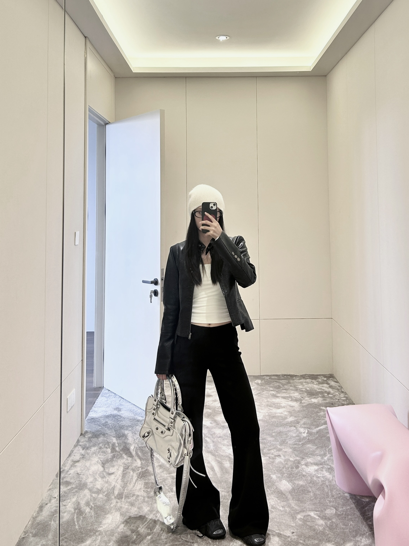黑色短款皮夹克自带酷感buff, 内搭白色露腰小吊带增添小性感, 下身黑色微喇裤拉长腿部线条, 再拎上白色机车包、戴上白色针织帽, 甜酷平衡的穿搭小心机直接拉满~ 日常出街这么穿,复古又时髦,回头率想不高都难!