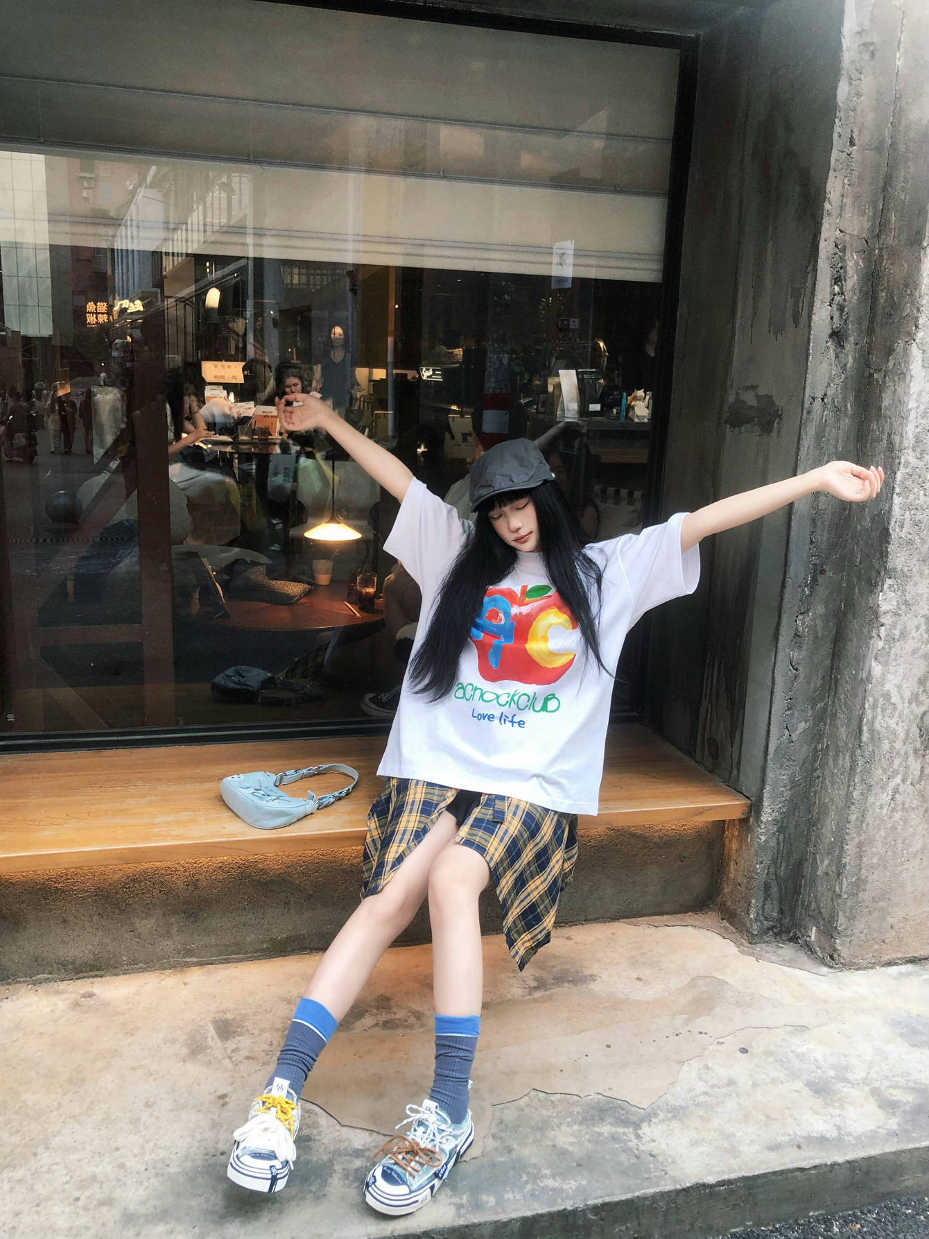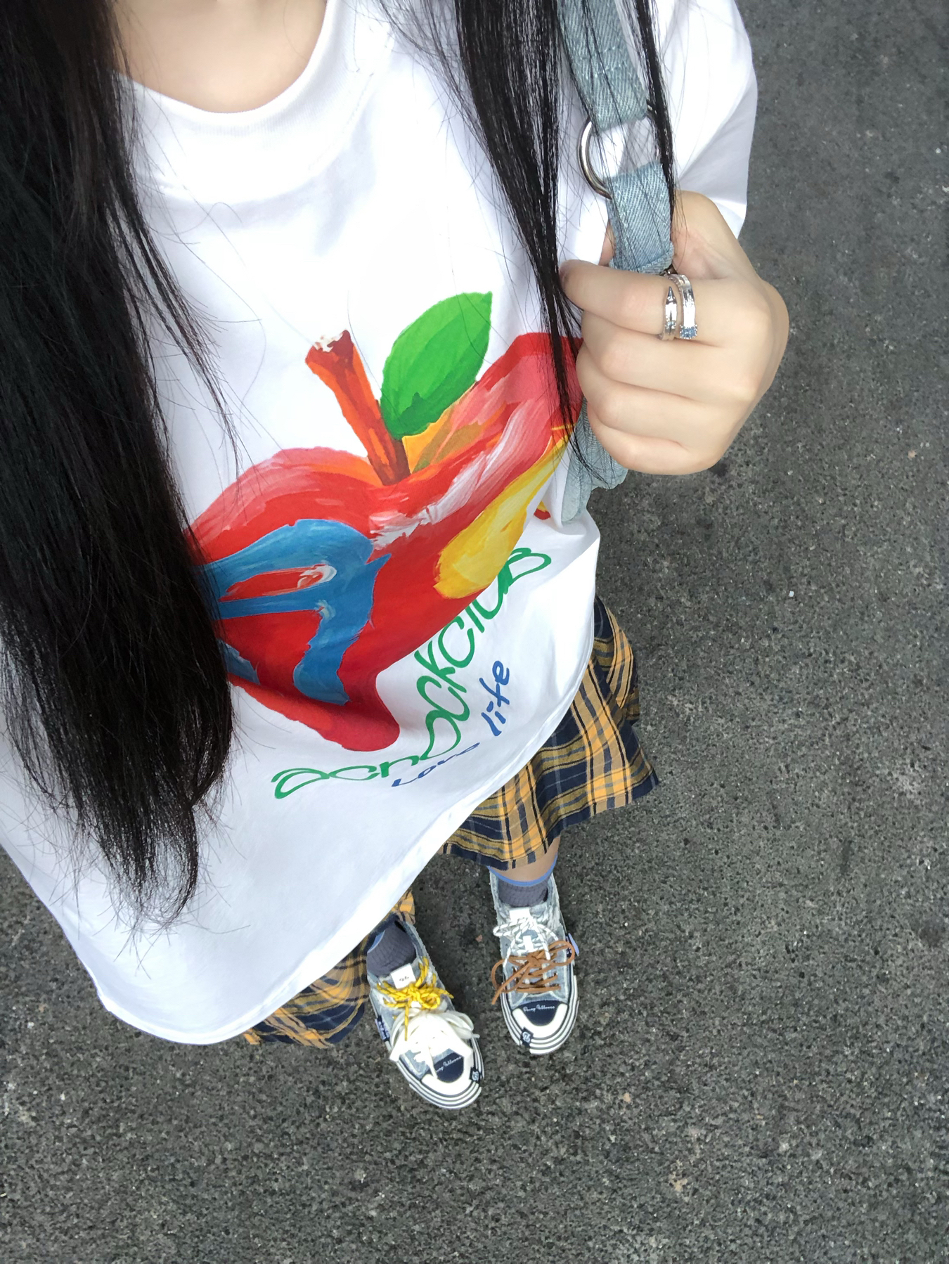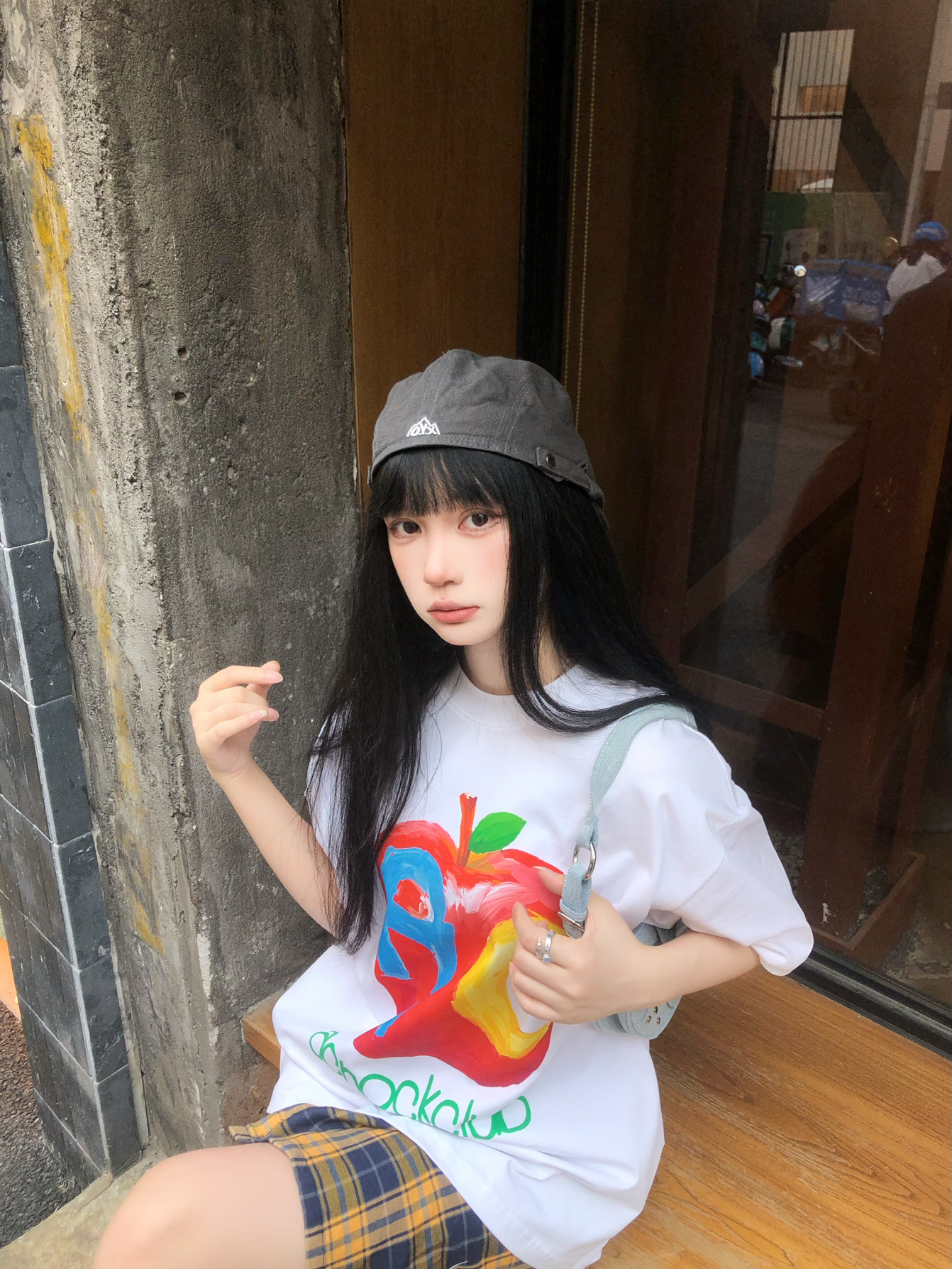 美式复古感的高校风回头率好高😋 宽松的A chock苹果字母短袖上身 我162穿的L码搭配的黄格子裙😌 这么穿出门透气又百搭~ 搭配黛西法罗巧克力帆布鞋👟 同色系配色相呼应增加潮流度 帽子作为配饰就很加分了
