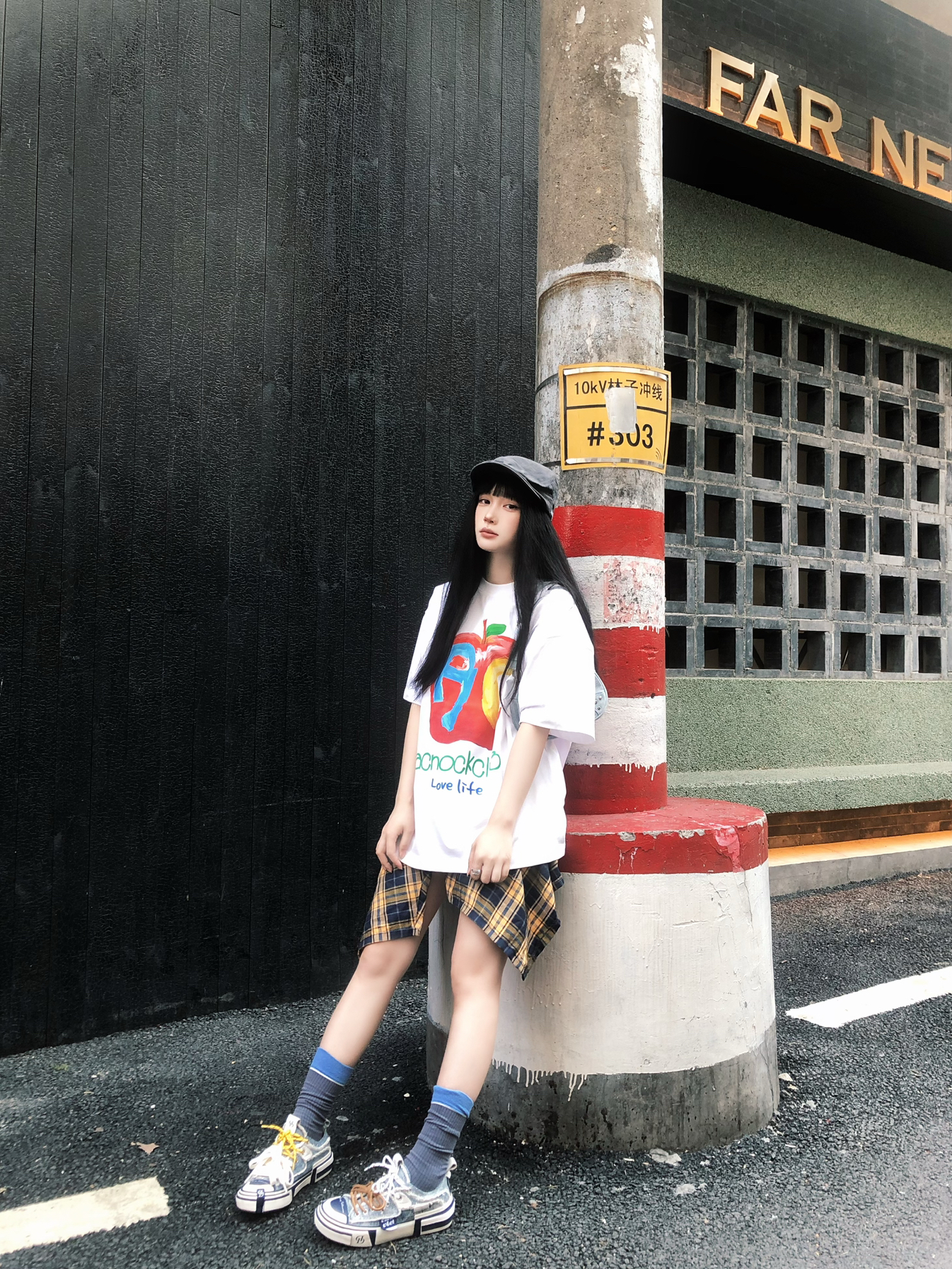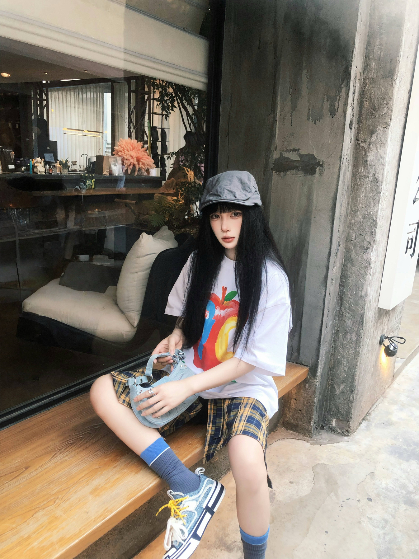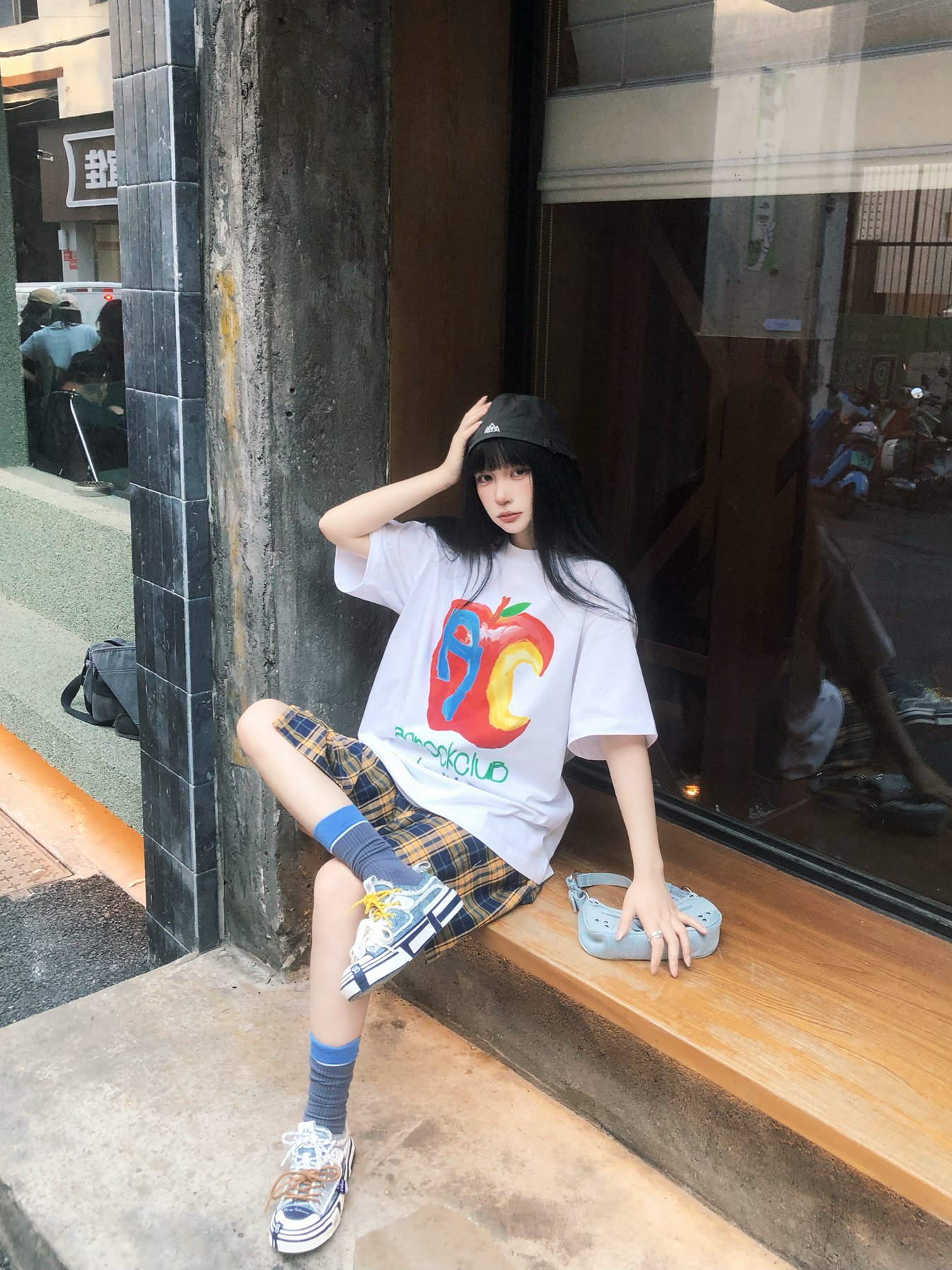 美式复古感的高校风回头率好高😋 宽松的A chock苹果字母短袖上身 我162穿的L码搭配的黄格子裙😌 这么穿出门透气又百搭~ 搭配黛西法罗巧克力帆布鞋👟 同色系配色相呼应增加潮流度 帽子作为配饰就很加分了