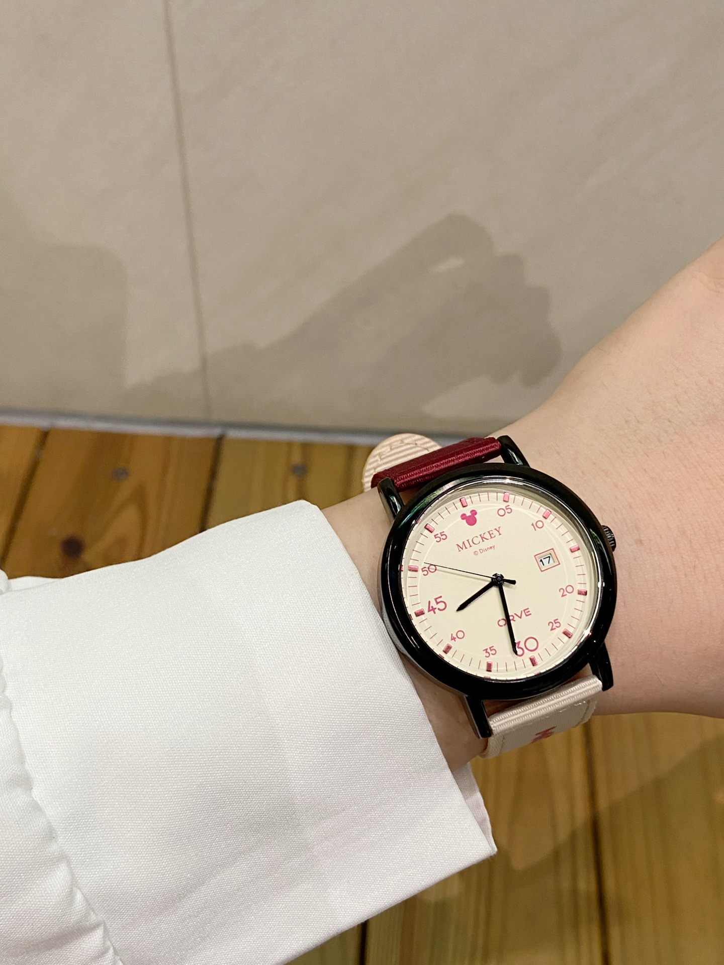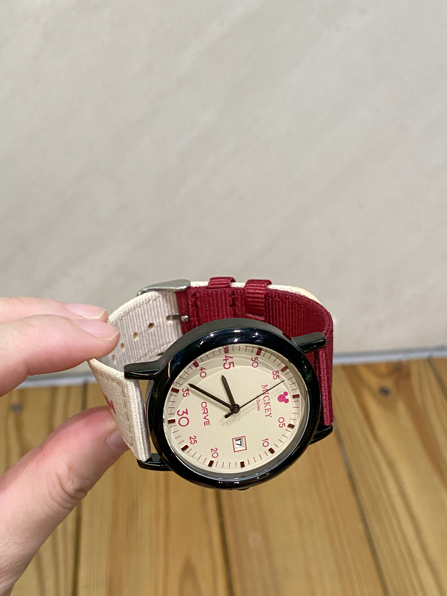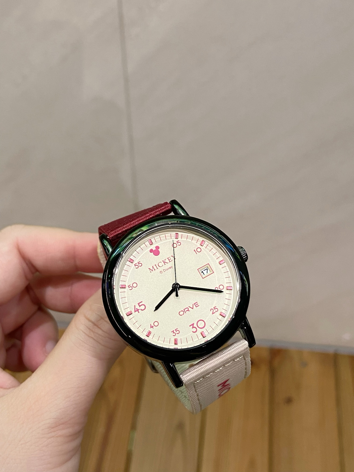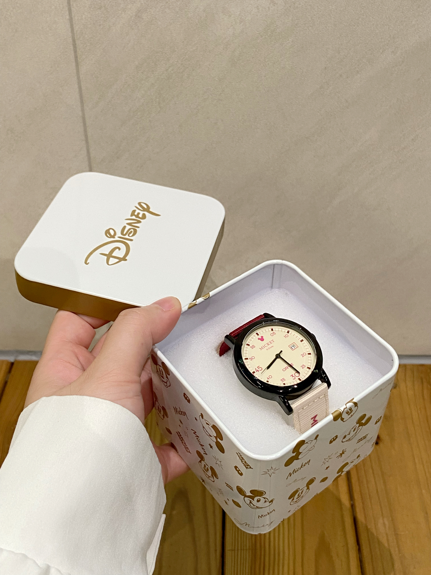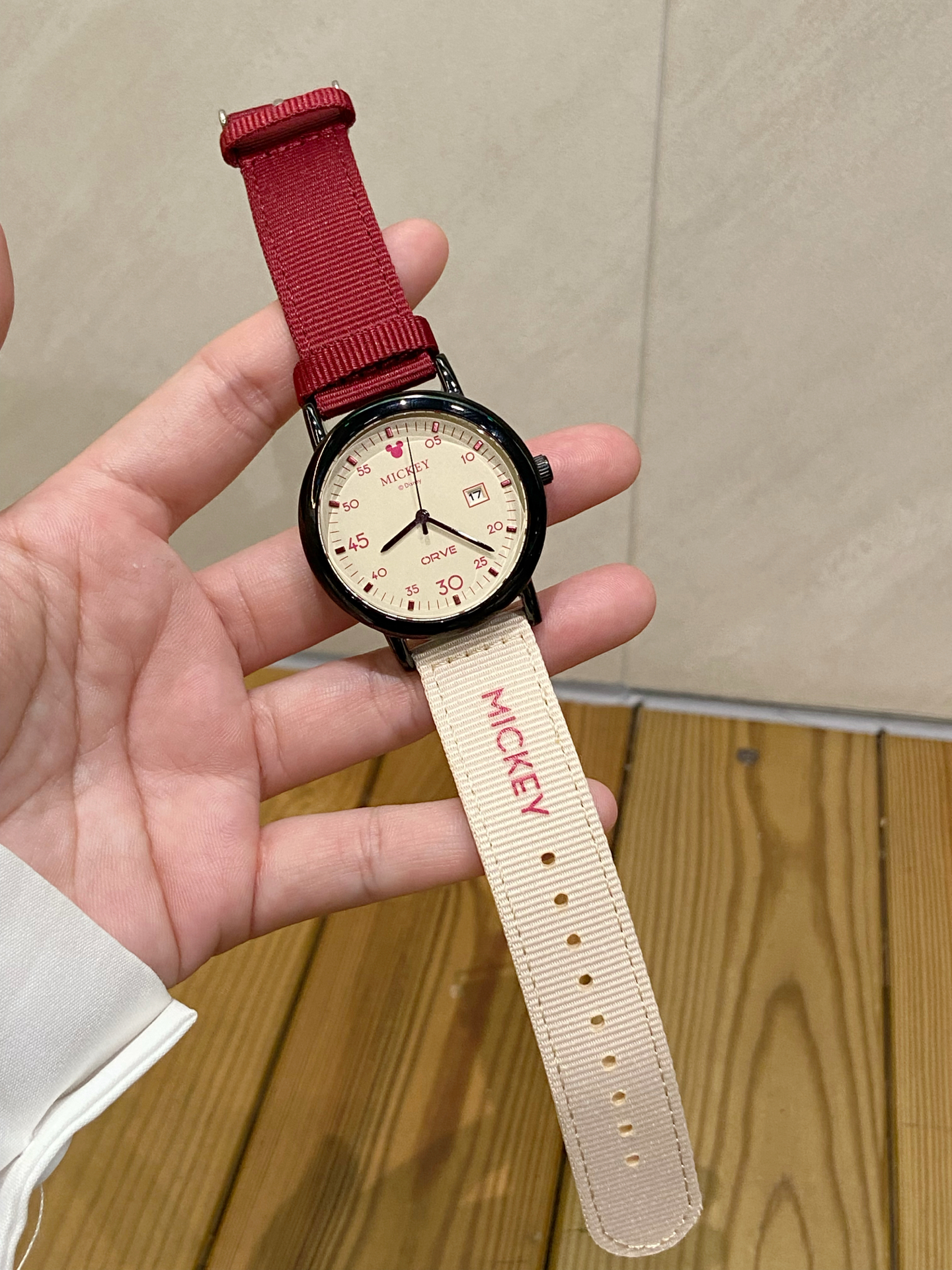 我入的这手表米白+酒红拼接帆布表带,复古感直接拉满~ 表盘还有米奇图案,尊嘟好可爱🥰 款式不大不小,戴起来也轻 搭校服、休闲服都很奈斯! 就是夜光效果没我想象中亮,但整体我好爱呀~