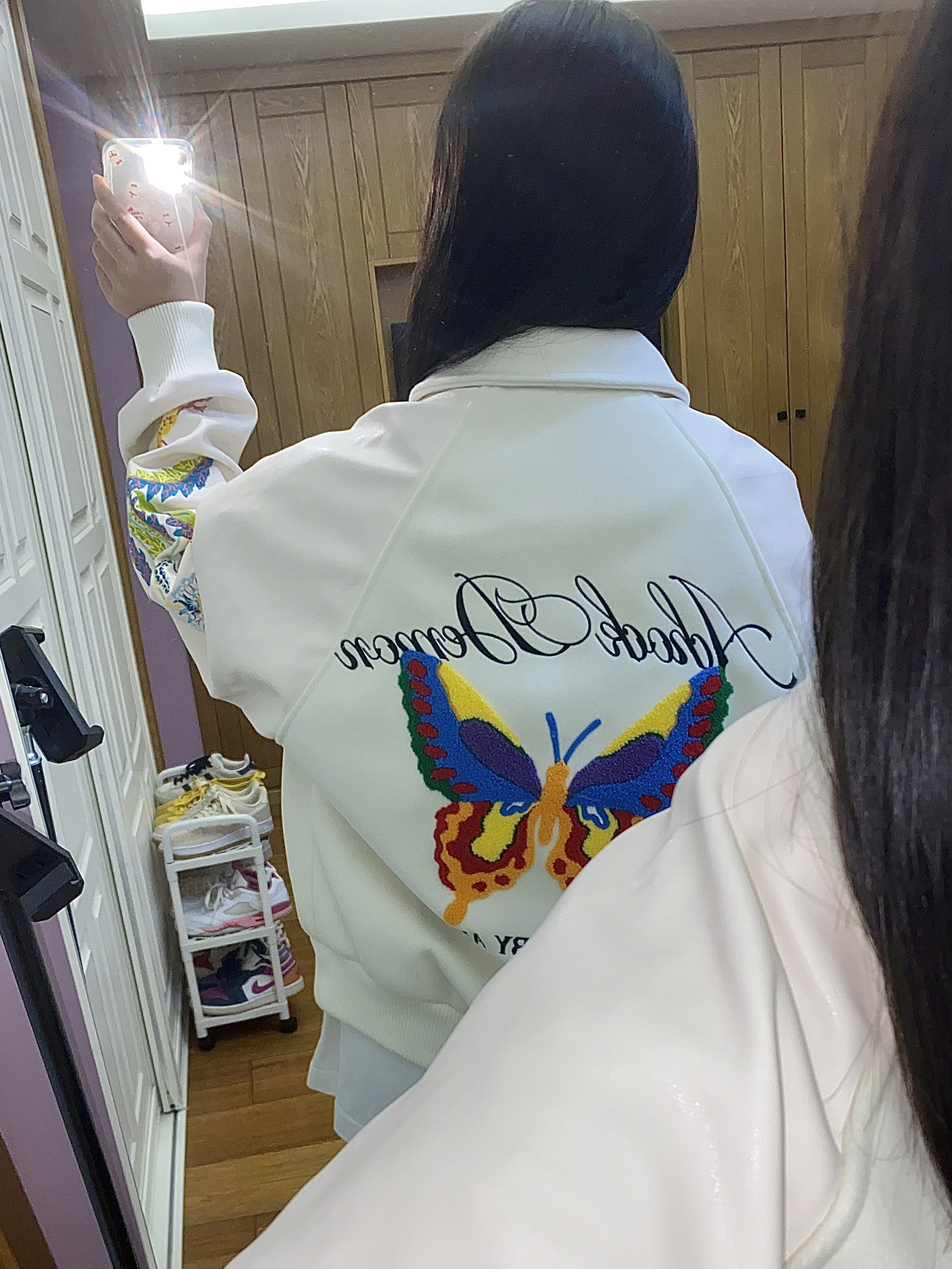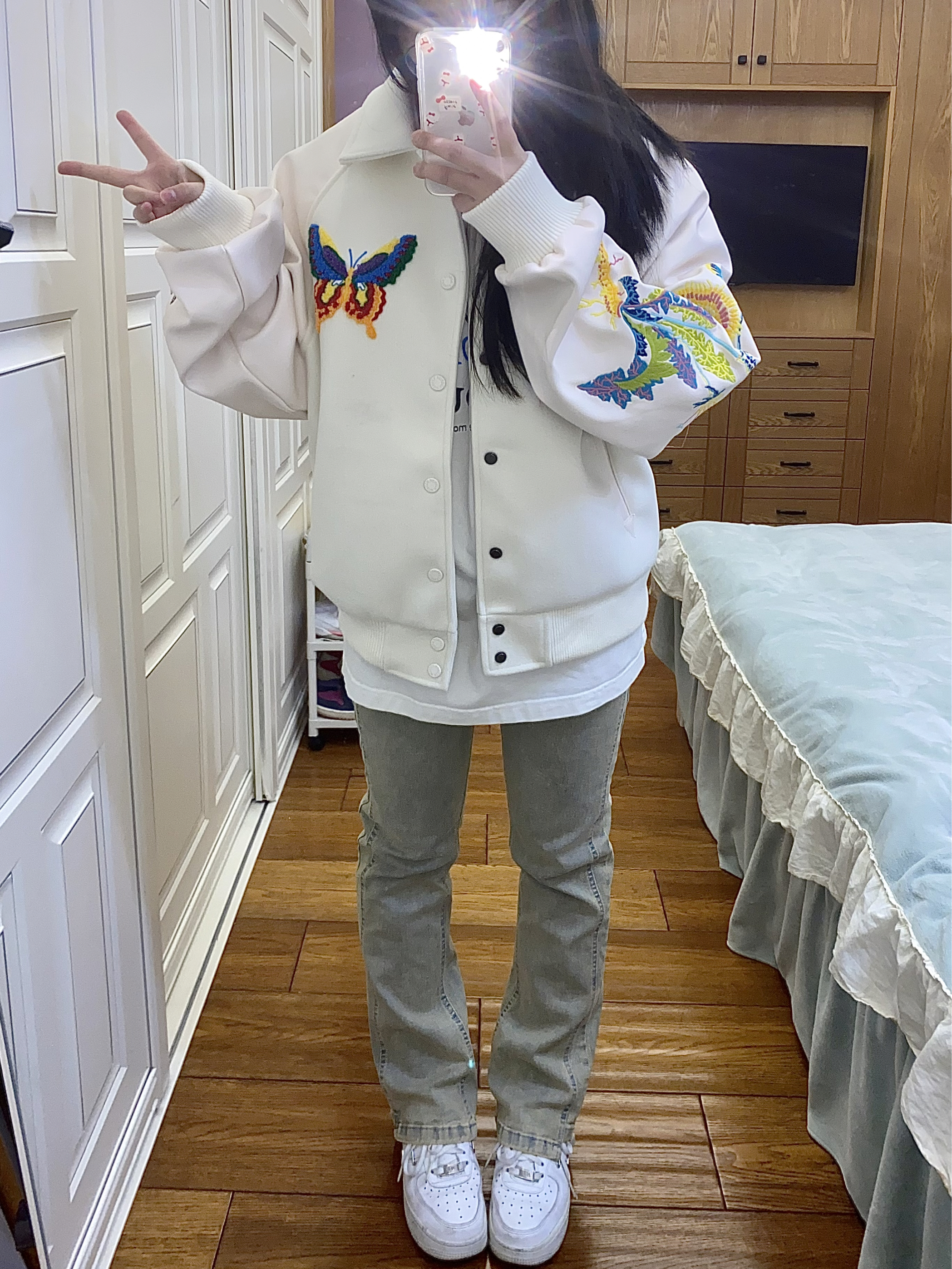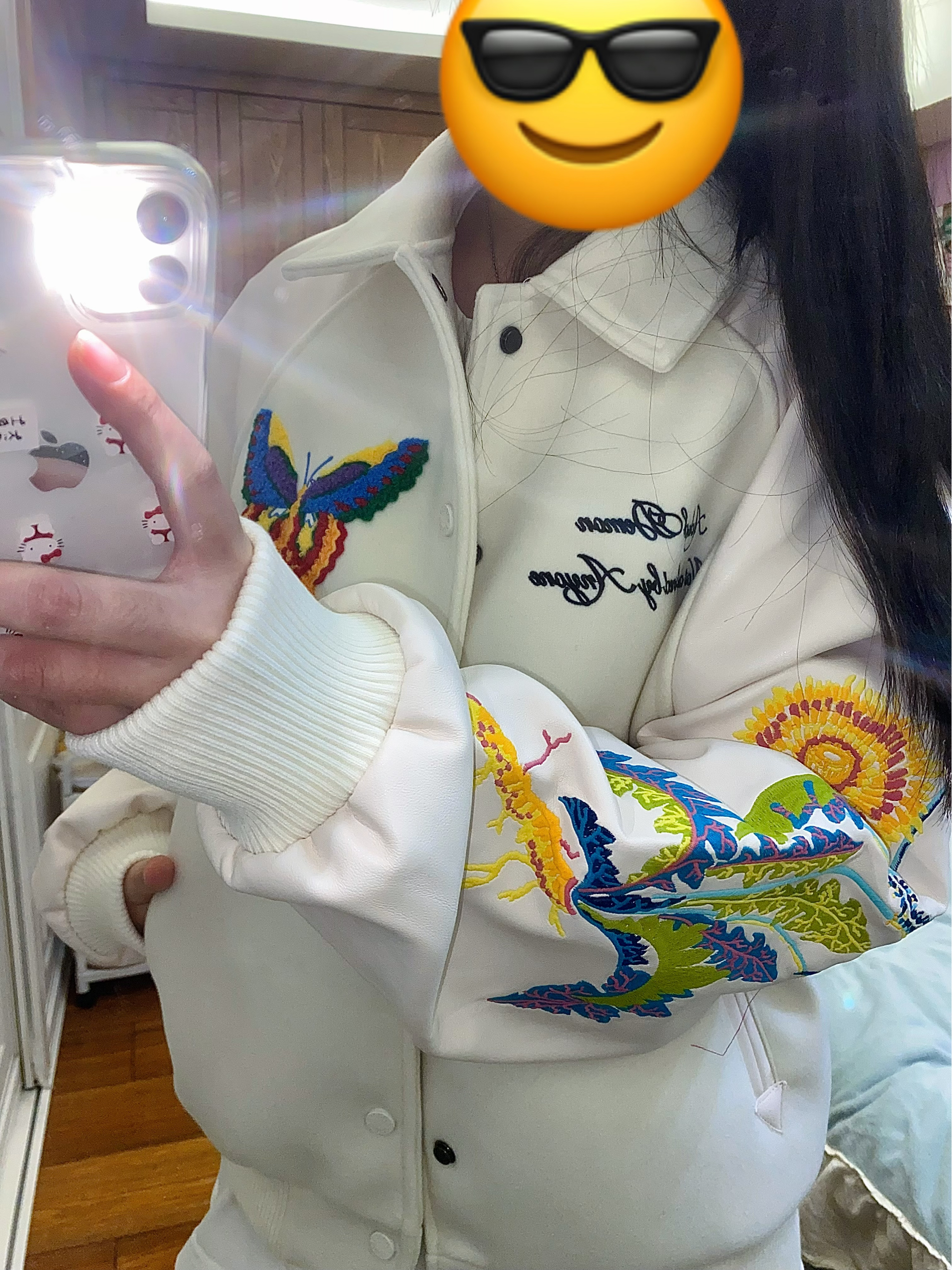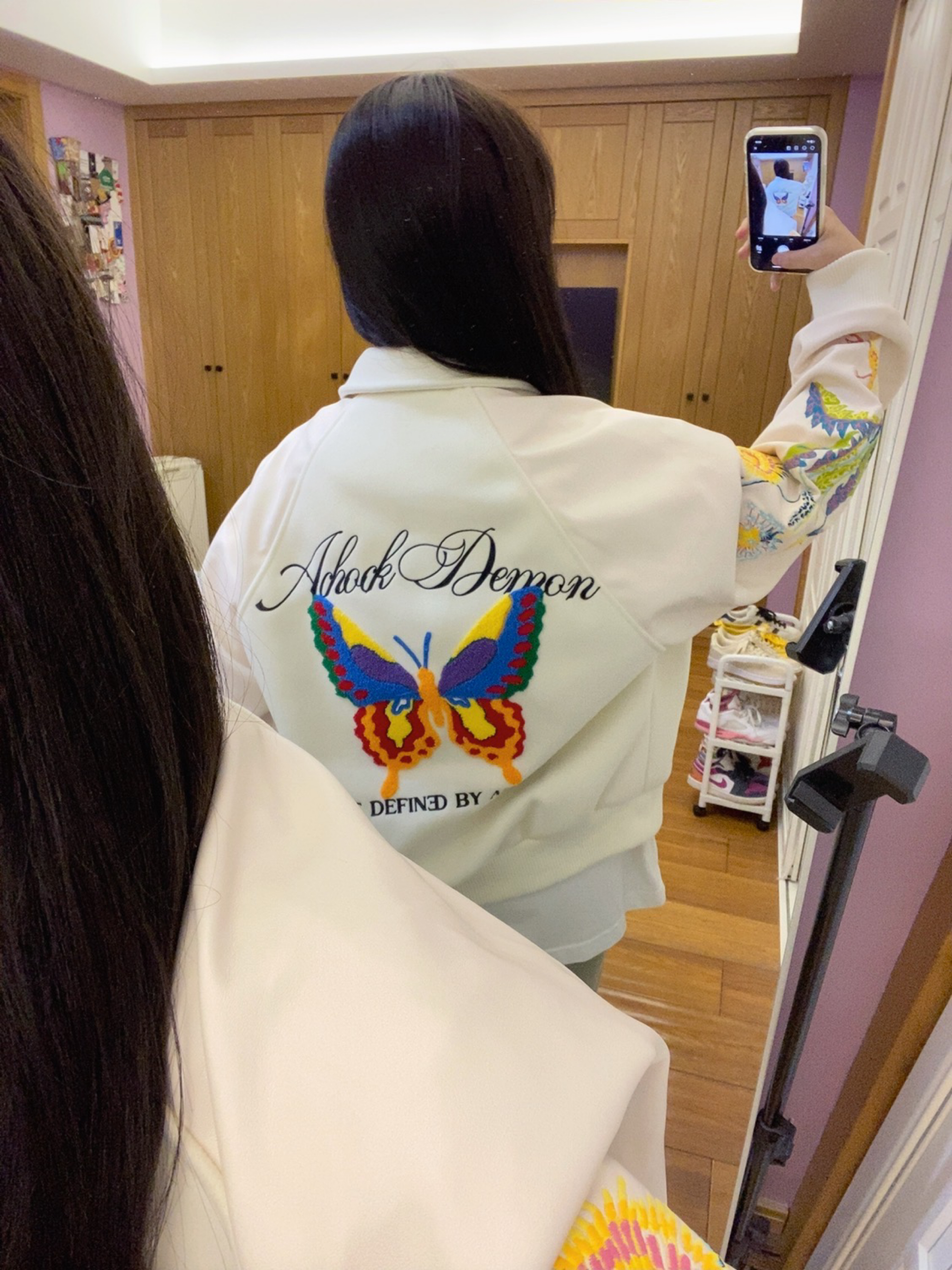 这件棒球服也太好看了!白色搭配各种颜色的刺绣!还有两个蝴蝶设计图案!真的太有春天气息了~怎么穿都好好看啊!