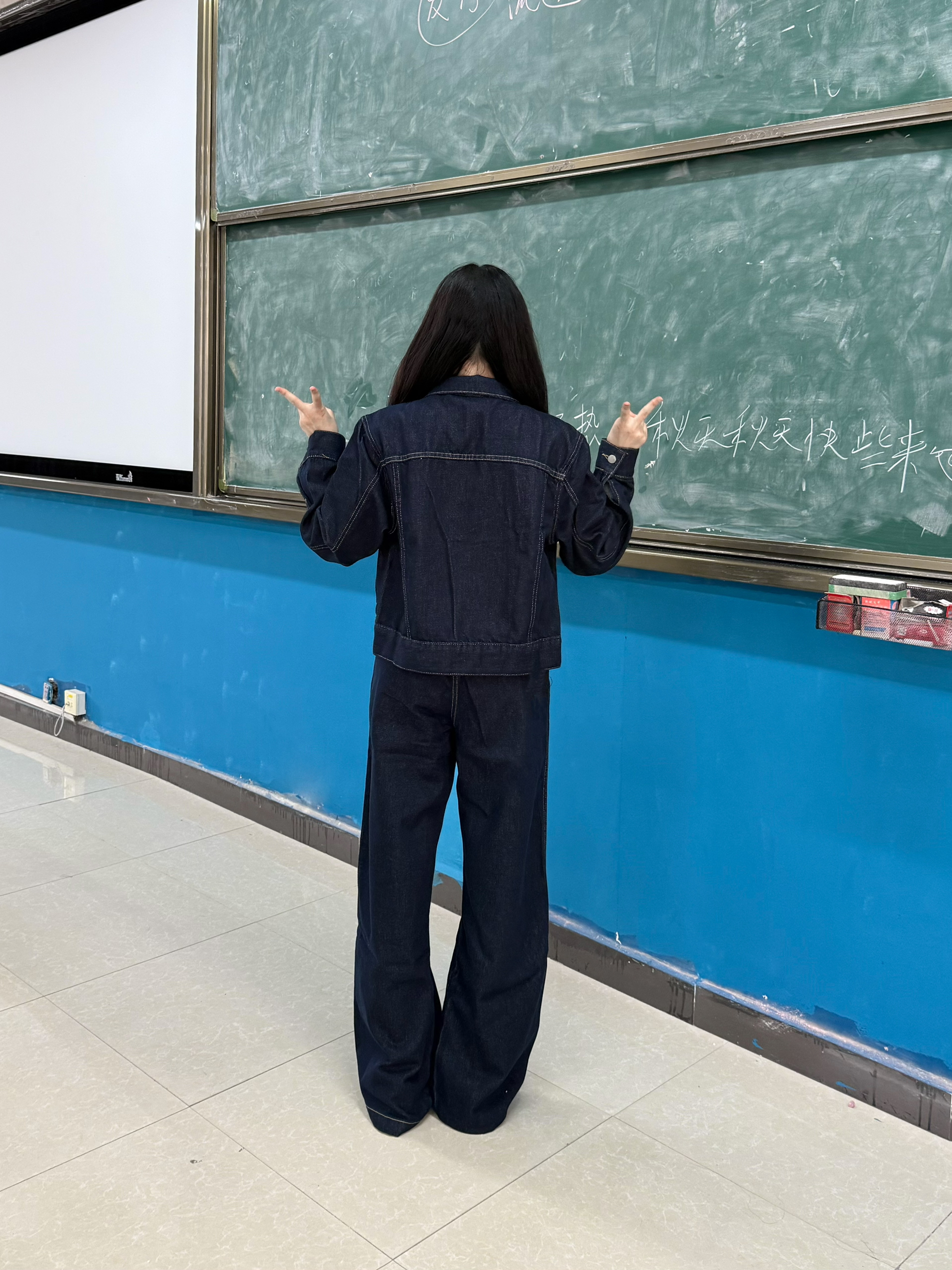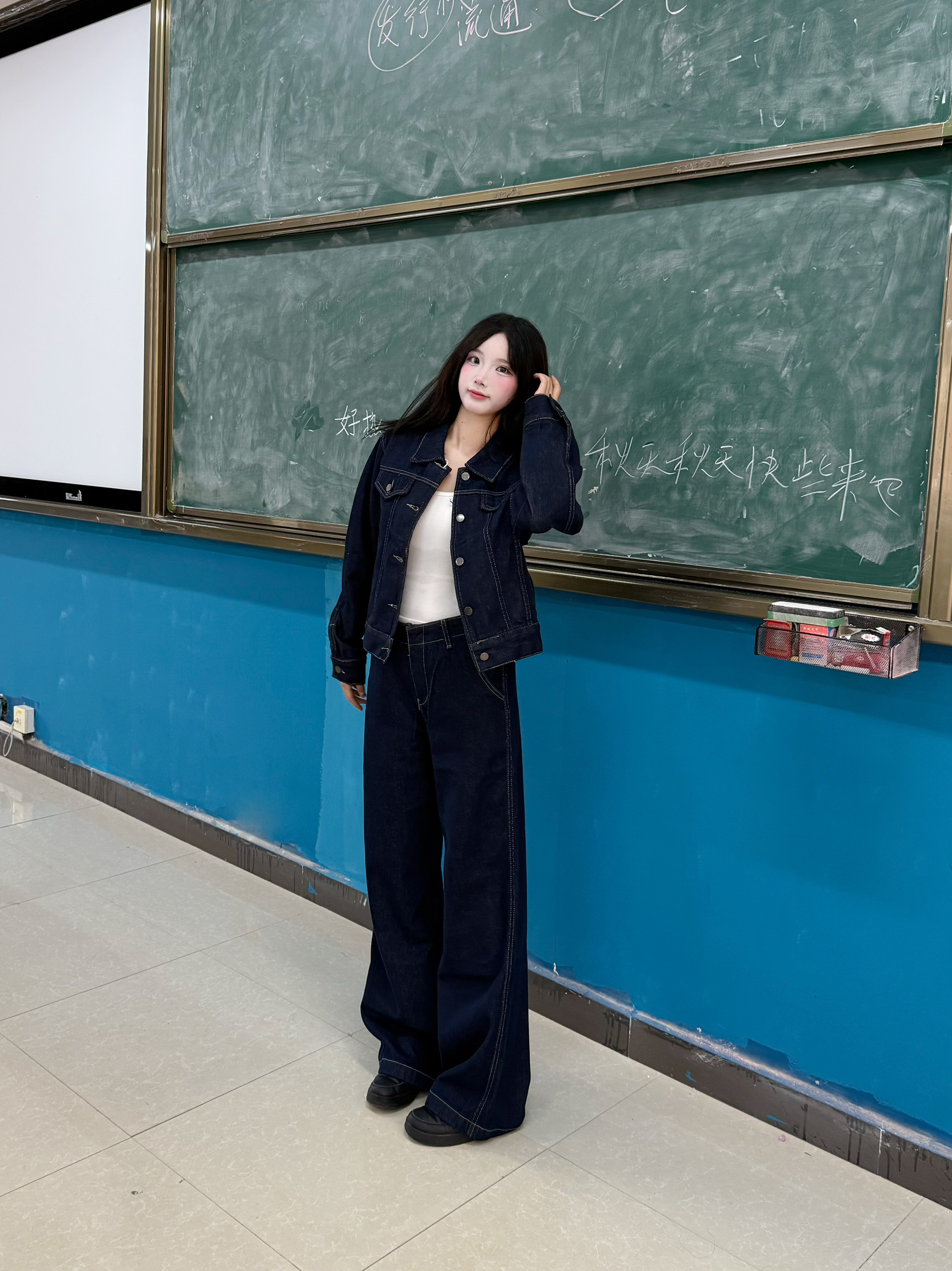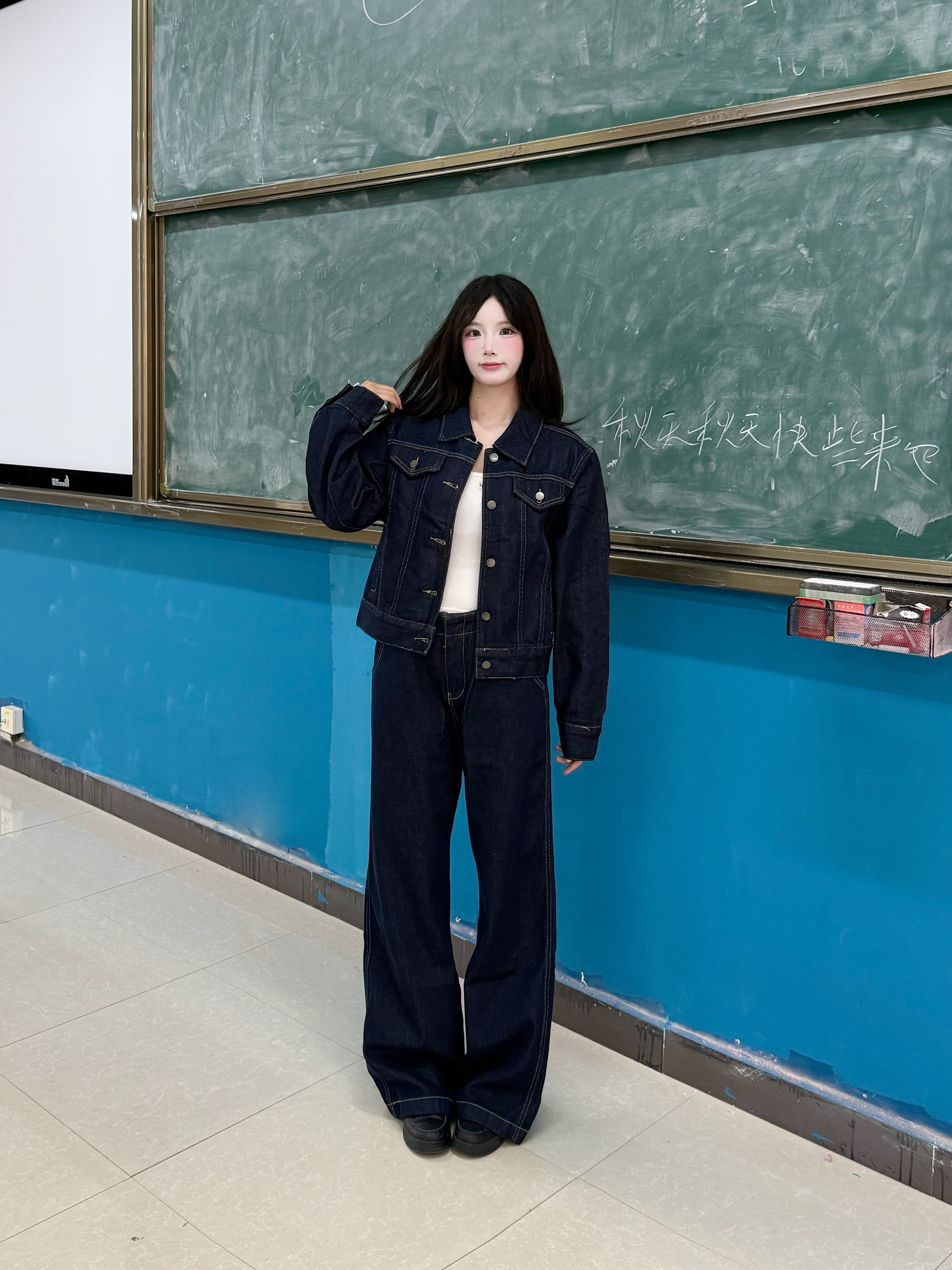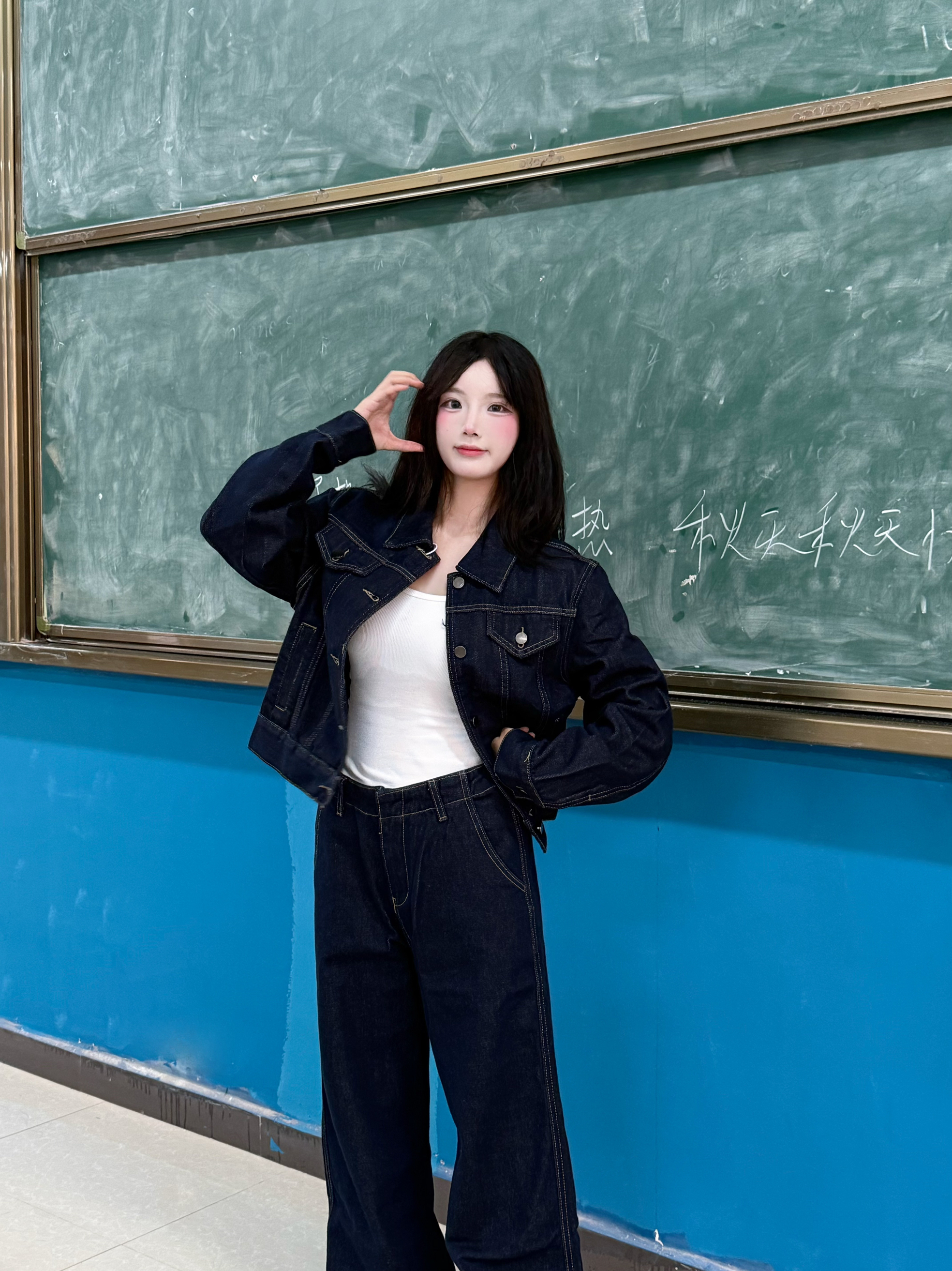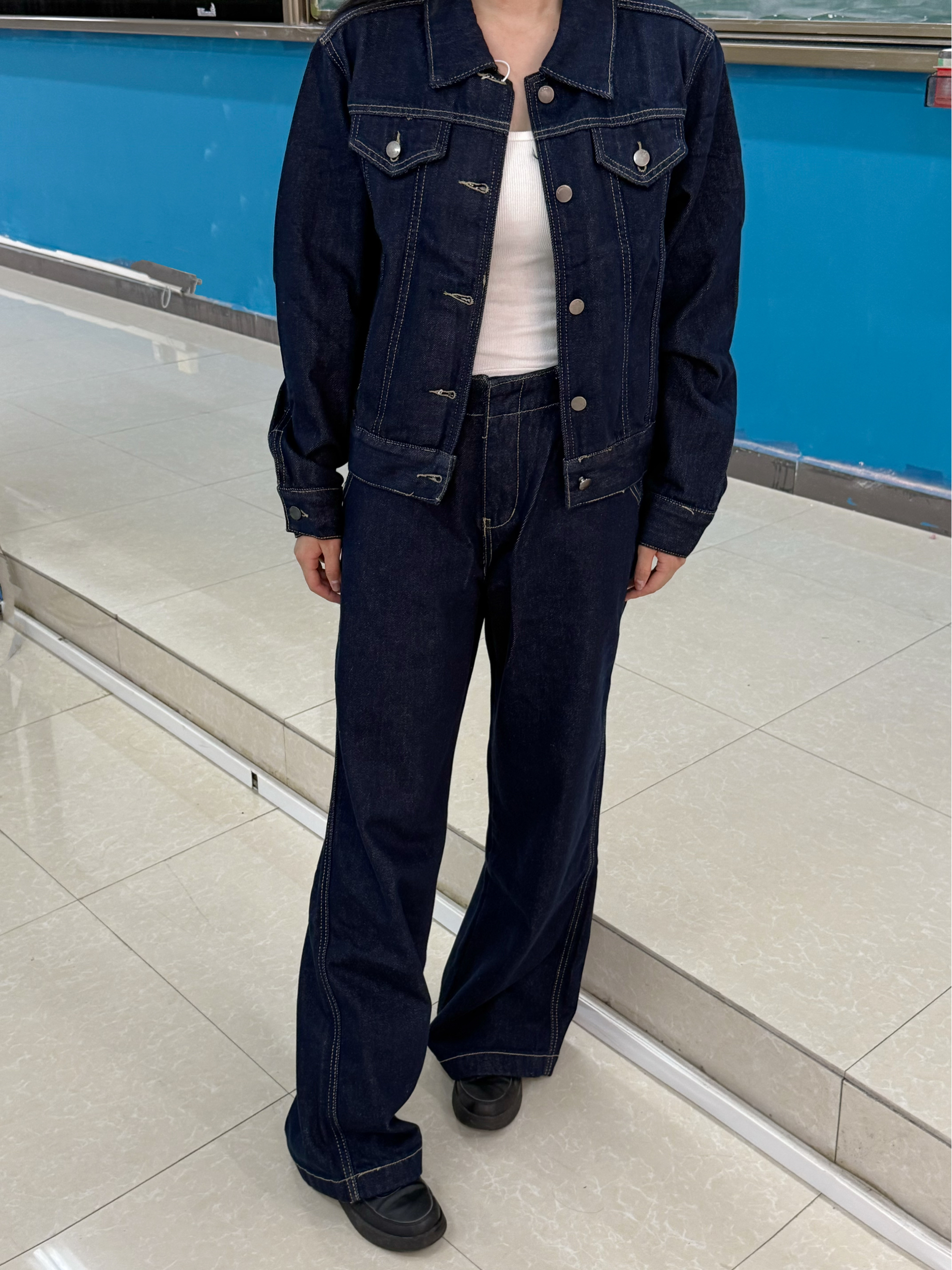 今天穿什么 今天穿 复古牛仔 今日份韩系穿搭呢 ☆*:.。. o(≧▽≦)o .。.:*☆ 一整个随性潮酷感呢 深牛仔蓝套装 一整个夹克版型利落哈 160/90穿的m