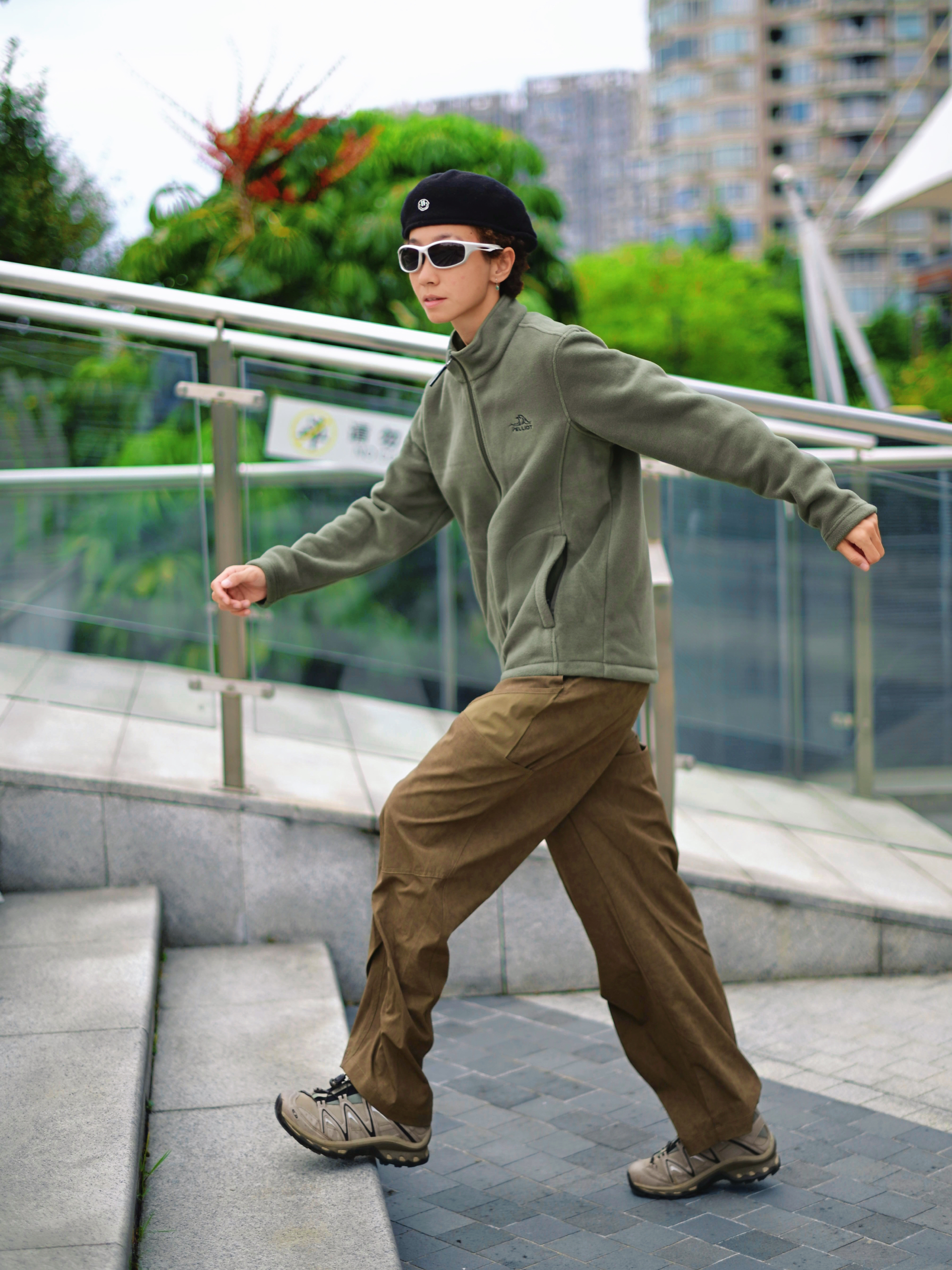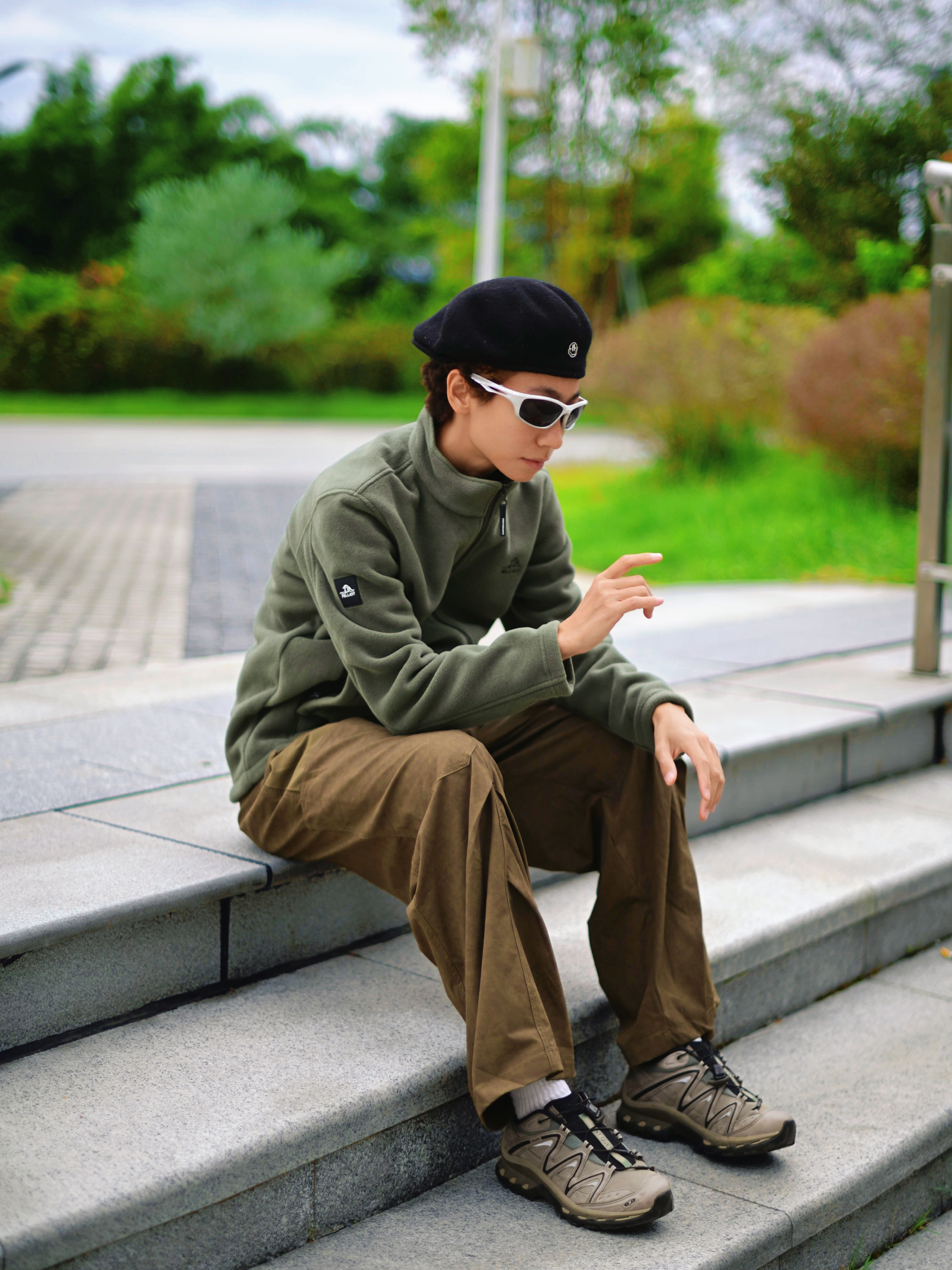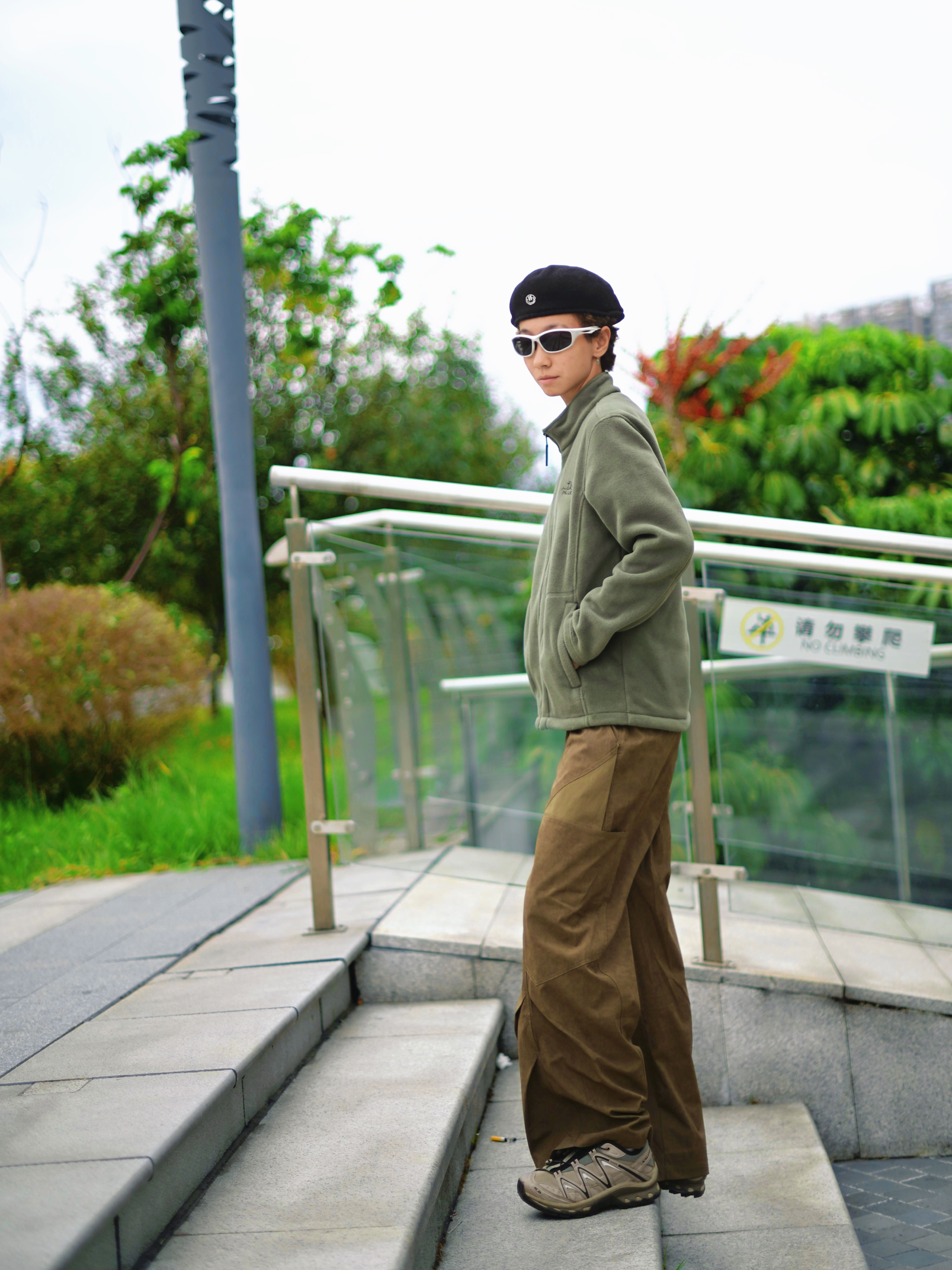 72CM|55KG 👔:m👖:m|👟:39 降温啦 别慌! 上身伯希和Polartec300摇粒绒开衫 军绿色在落叶场景里意外好拍~ 立领设计防风又利落 单穿不扎皮肤,下半身搭配咖色系冲锋裤! 贝雷帽和墨镜加持立刻变身街拍焦点🧤出门city walk啦!