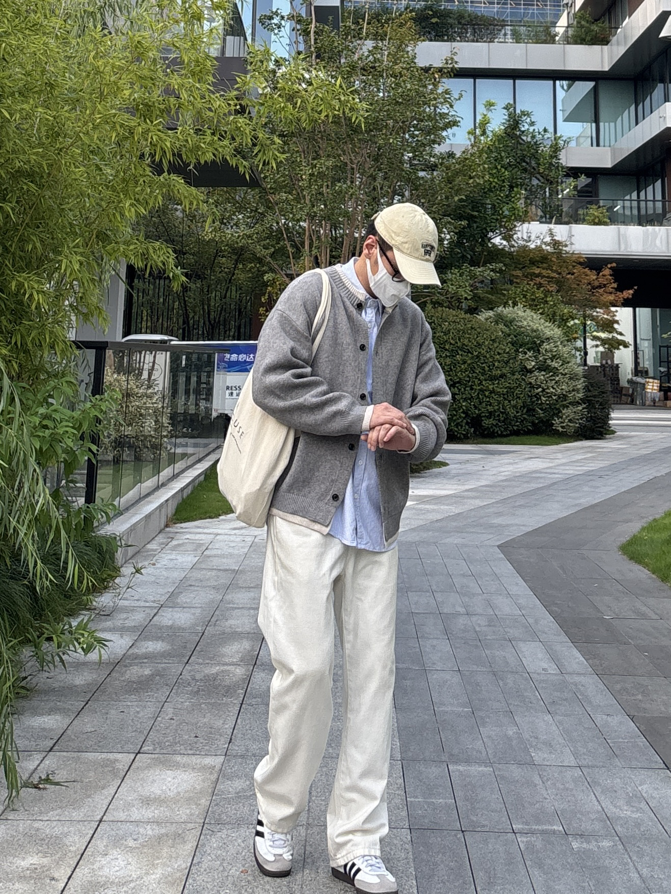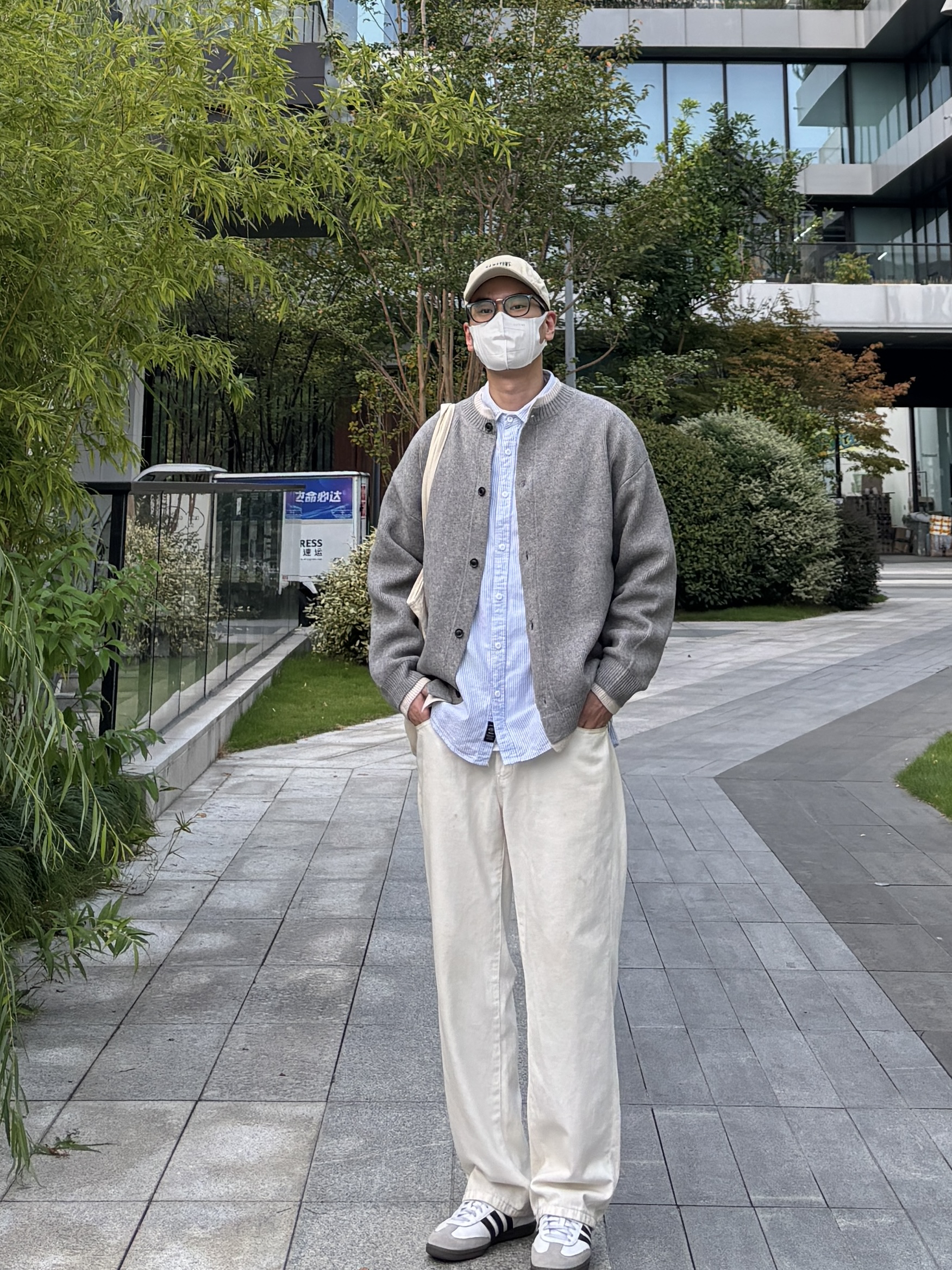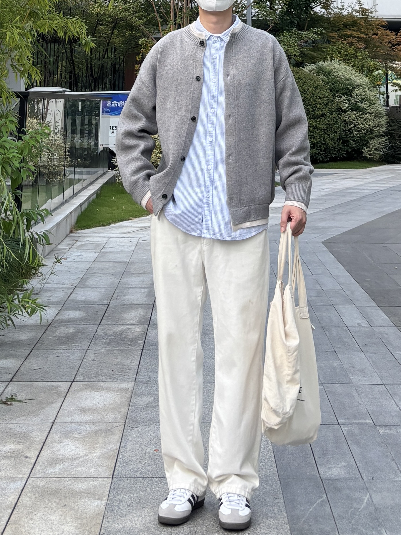 秋季怎么能逃开灰色系淡人穿搭。 上衣选择清爽的蓝色条纹衬衫搭配一件灰色针织开衫,再搭配一条白色直筒牛仔裤。 上身精致下身就松弛 温柔精致又显慵懒随性。 - 衣服裤子:NICE LILI 鞋子:adidas