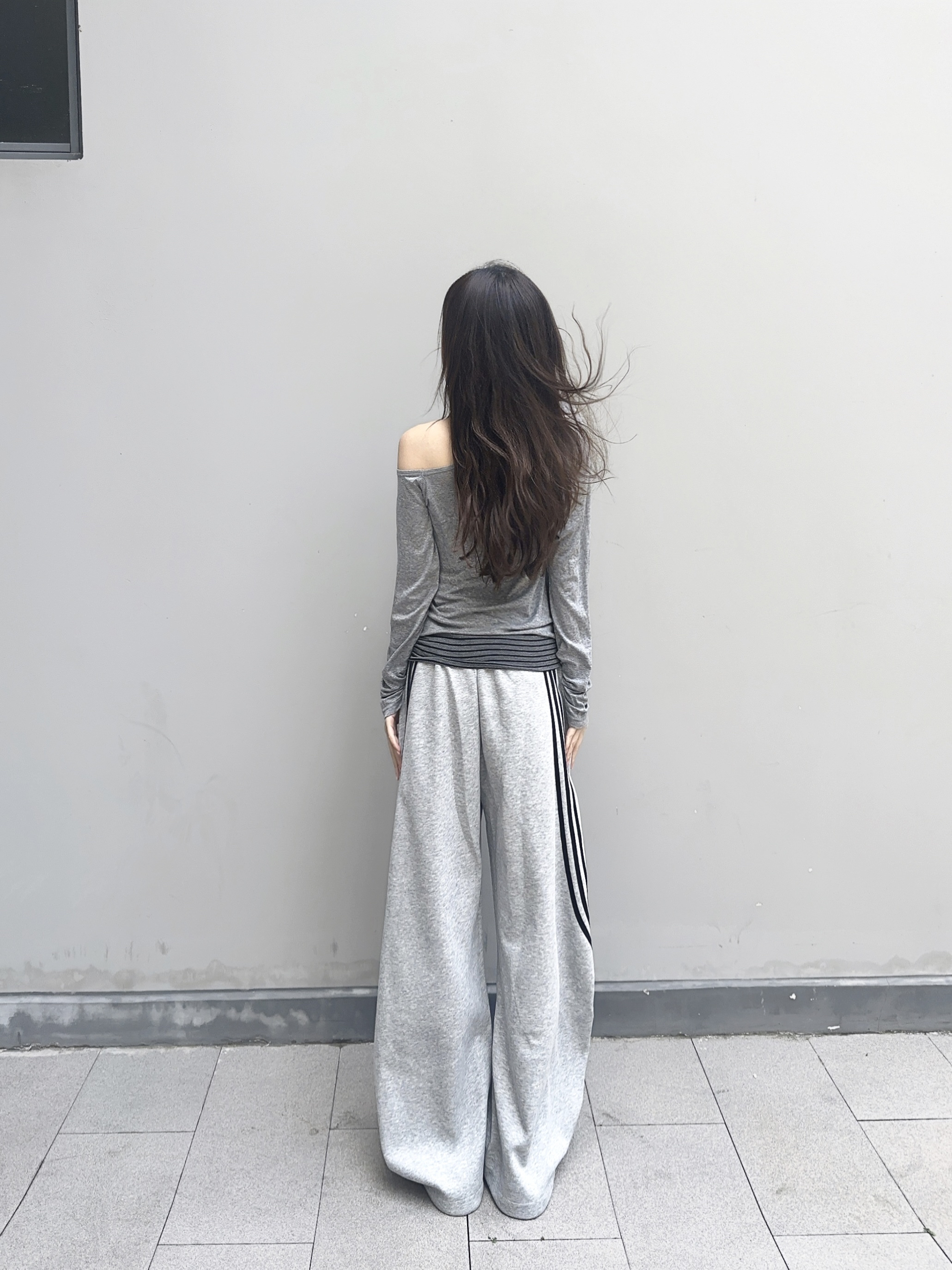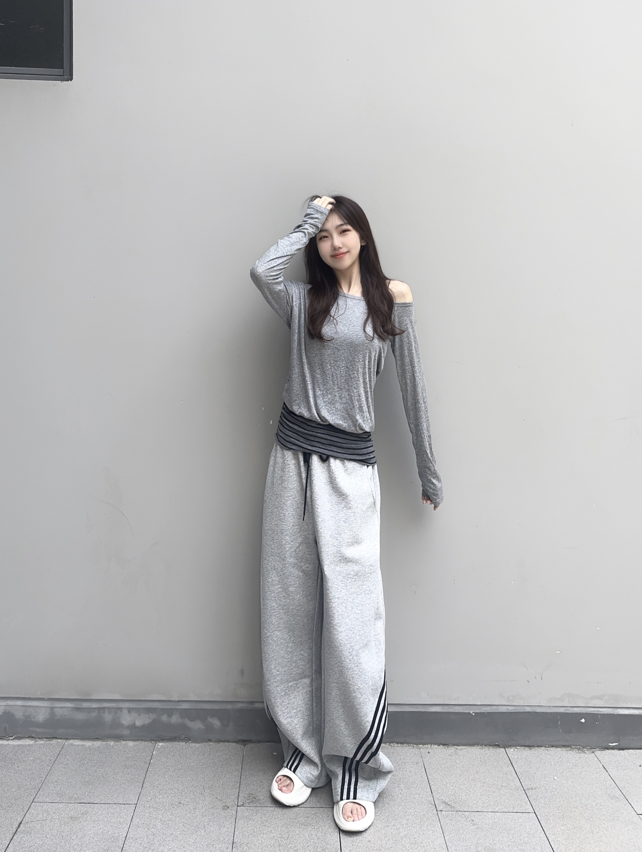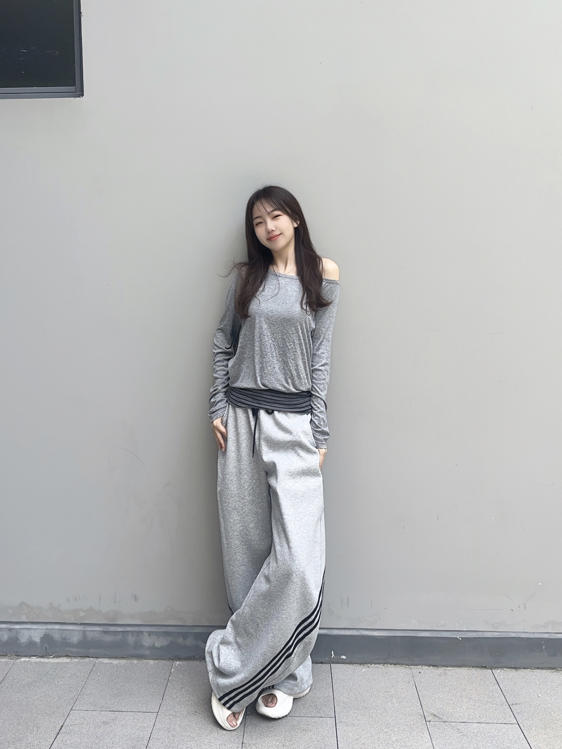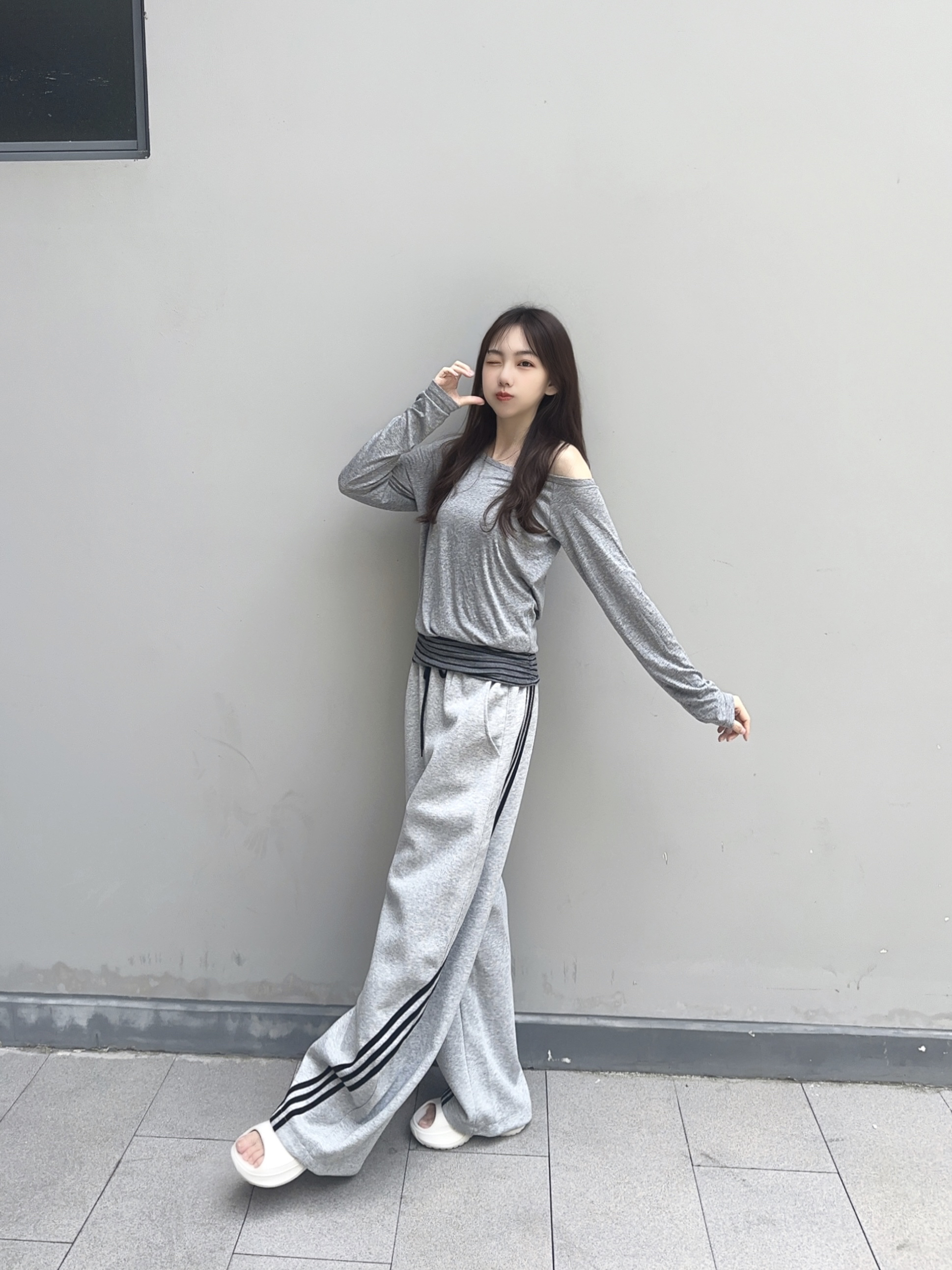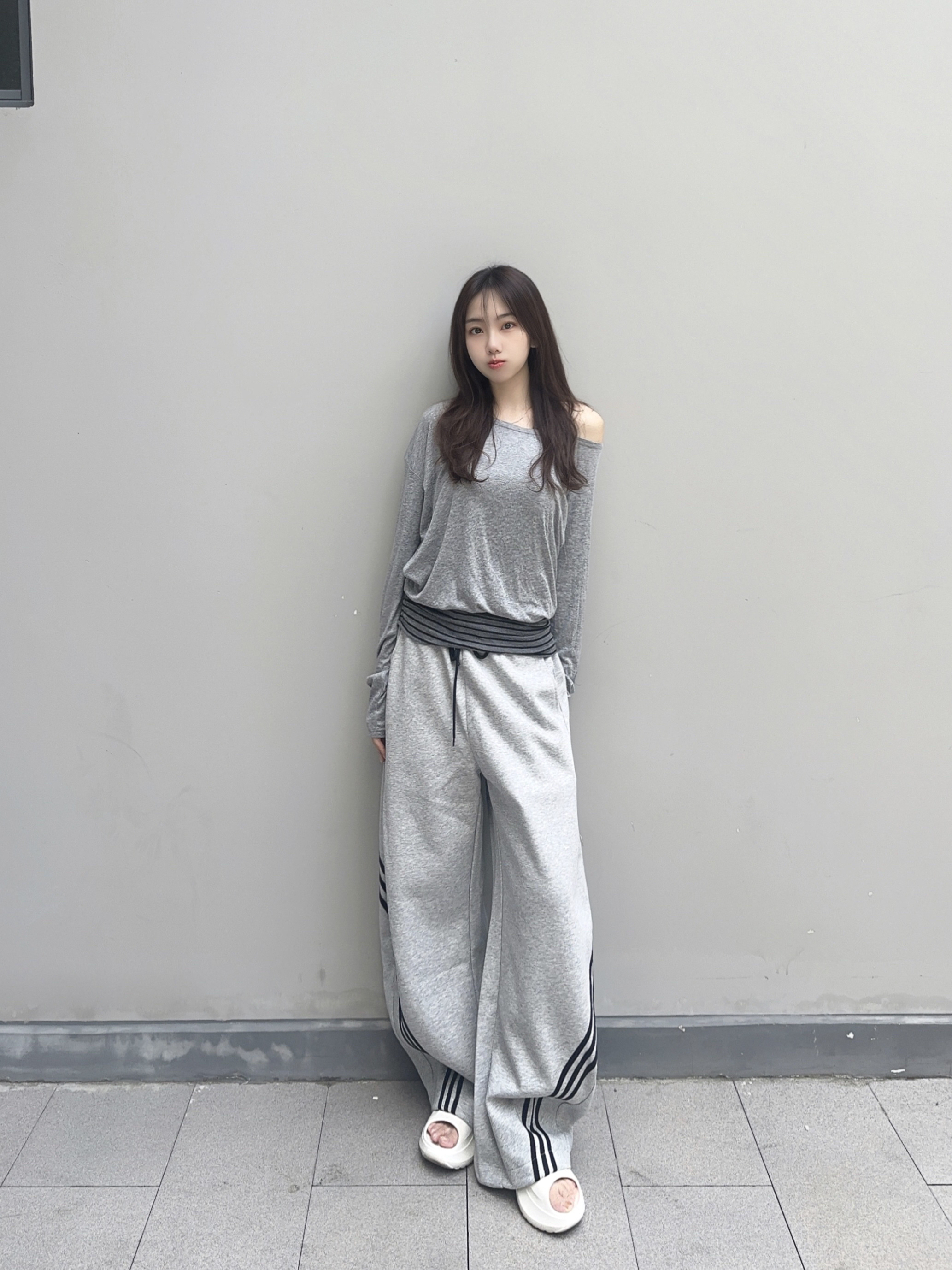 路边随地大小拍,松弛感满满 灰色露肩上衣+ 灰色卫裤 裤子三条杠的设计很有时尚运动感🏃🏻♀️ 不费力的潮流穿搭我悟啦!