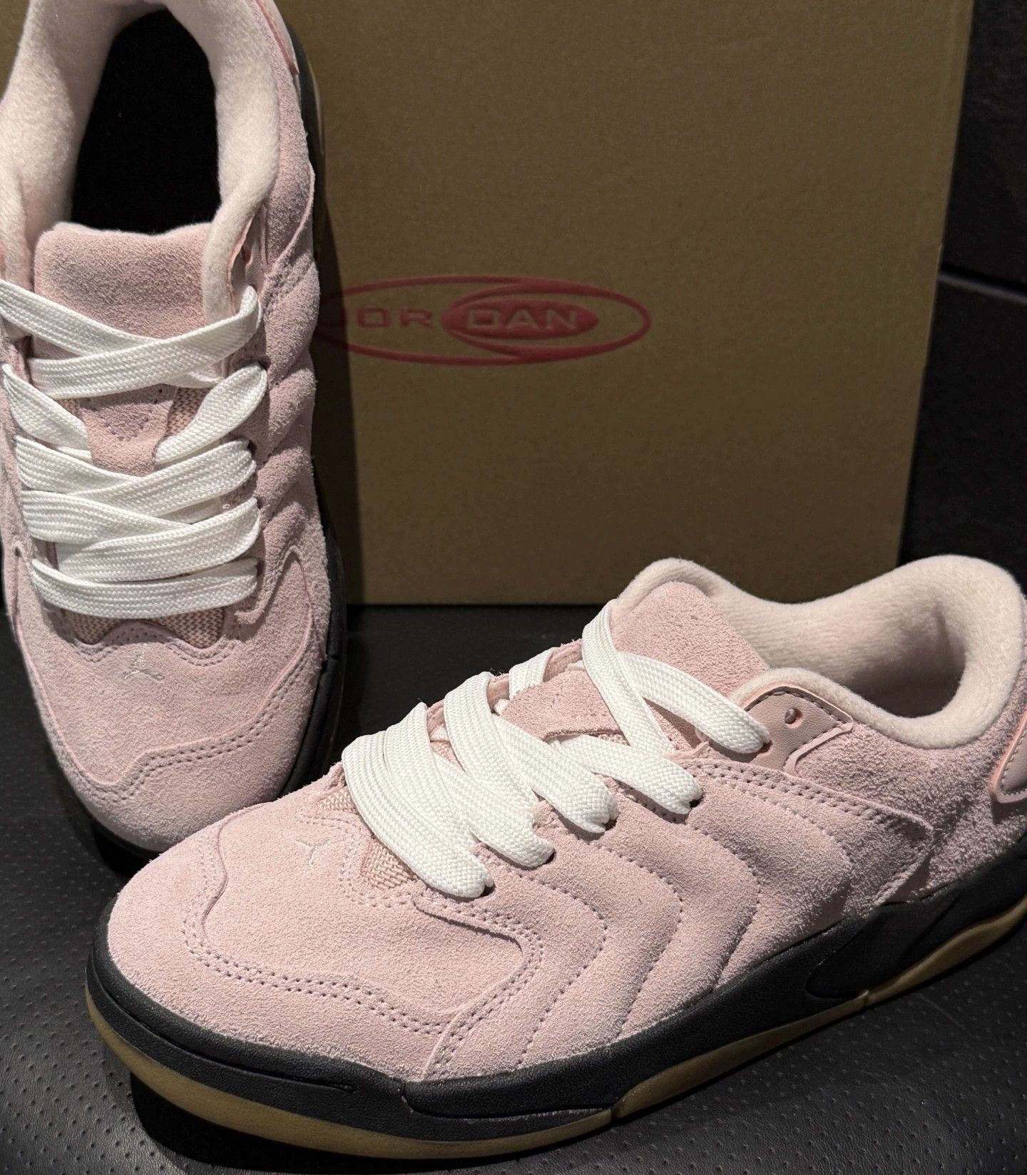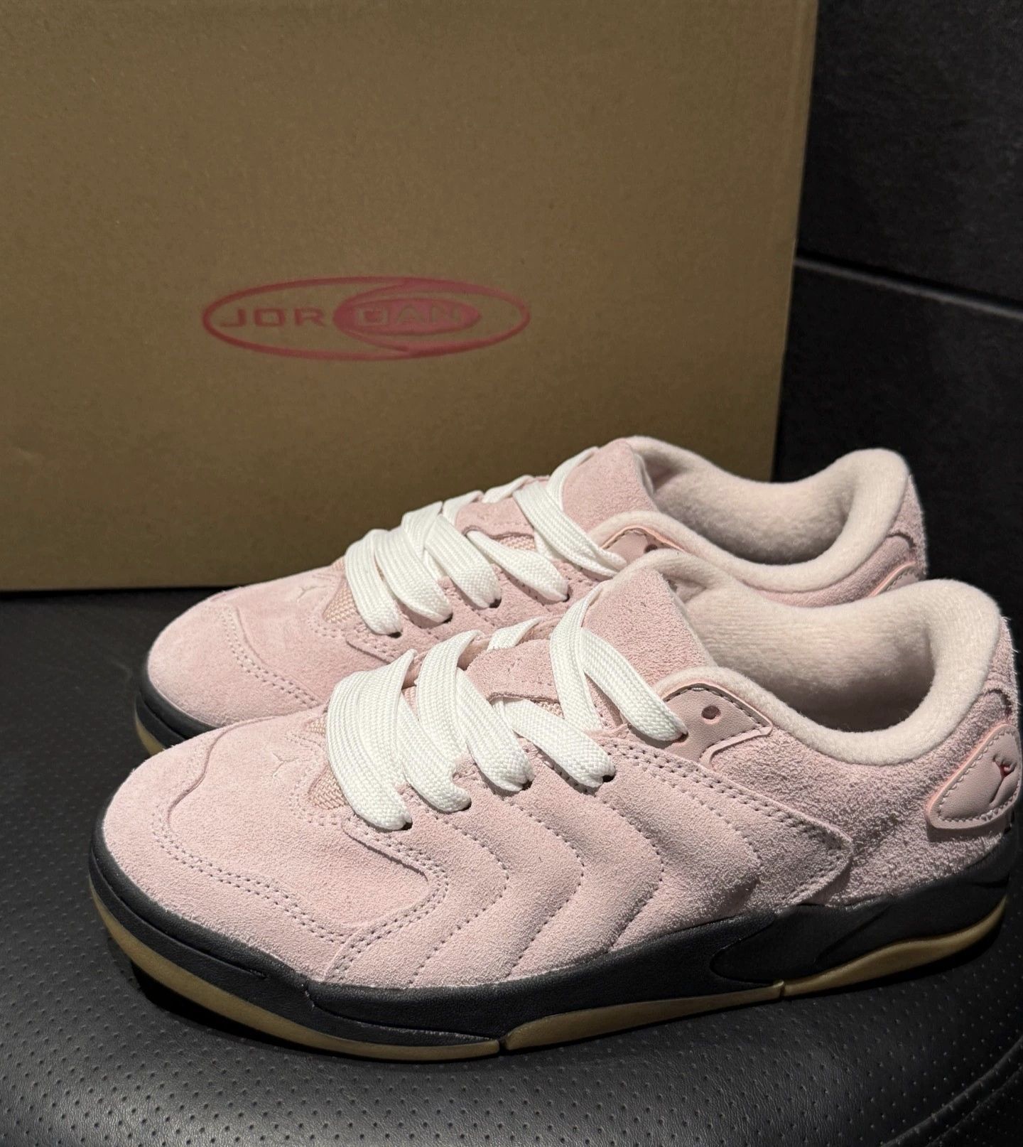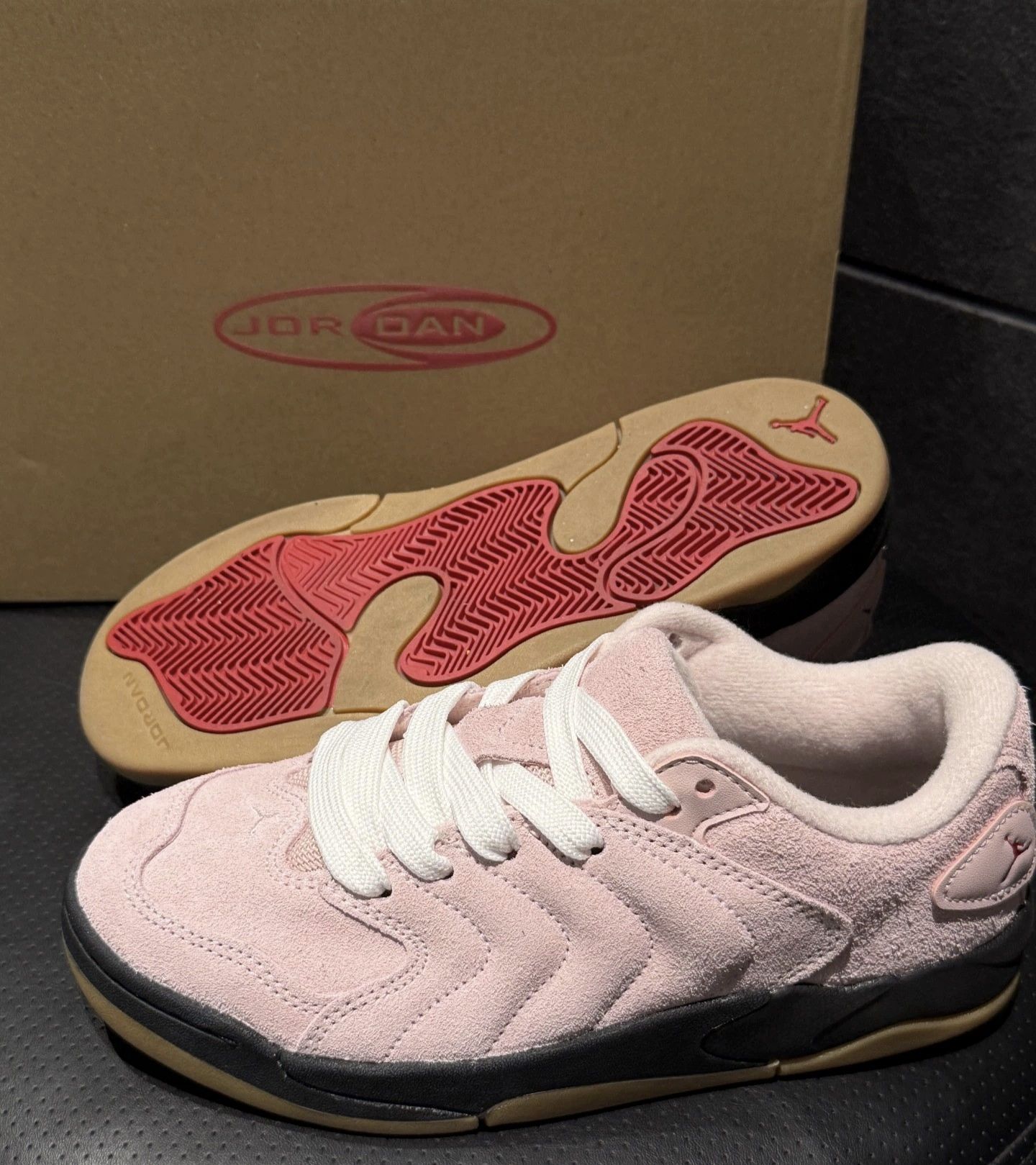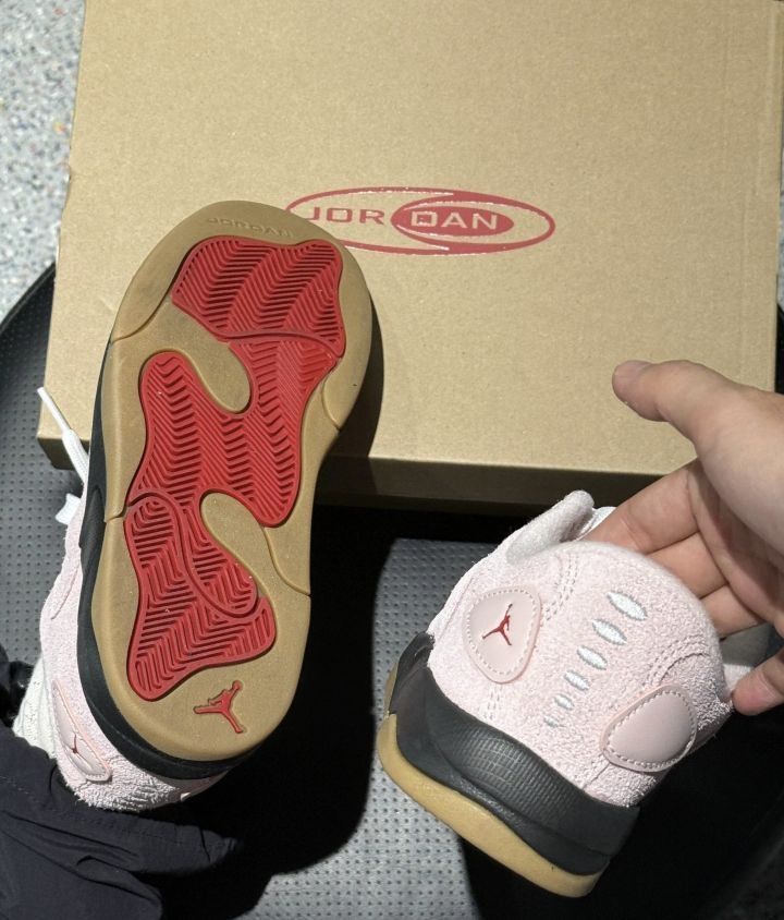 不错啊Jordan Session粉色面包鞋,超可爱嘟嘟造型,粉粉嫩嫩的!麂皮材质搭配白色鞋带,经典面包鞋设计。 后跟红色Jumpman标志点缀,黑色橡胶大底防滑耐磨