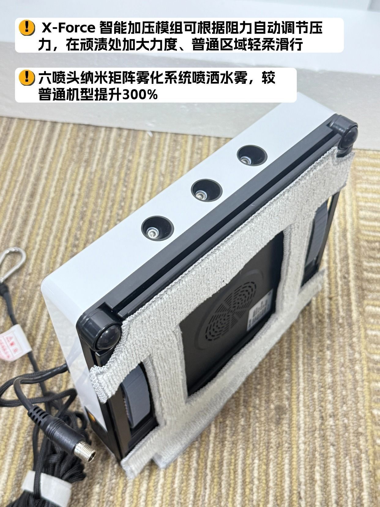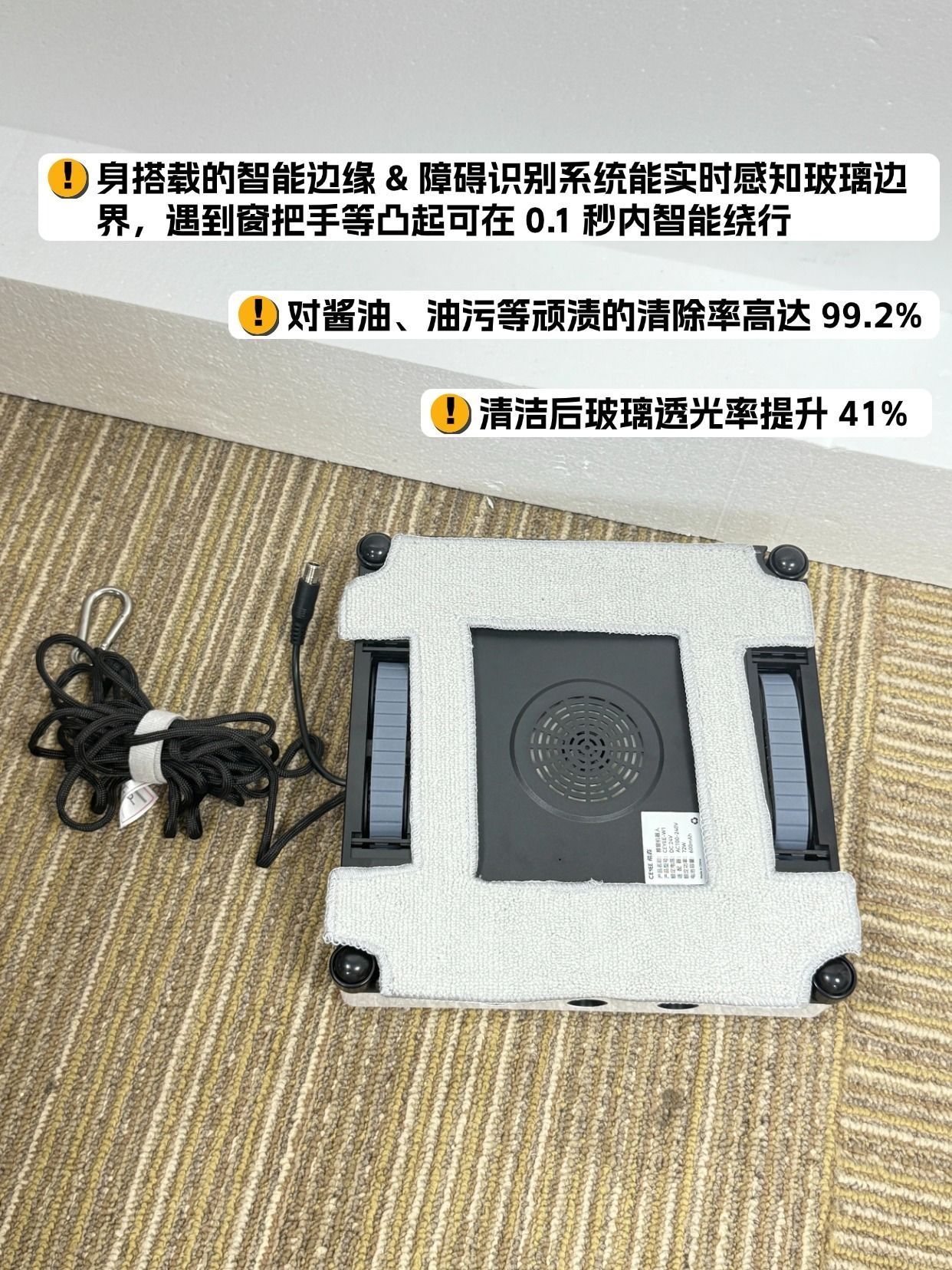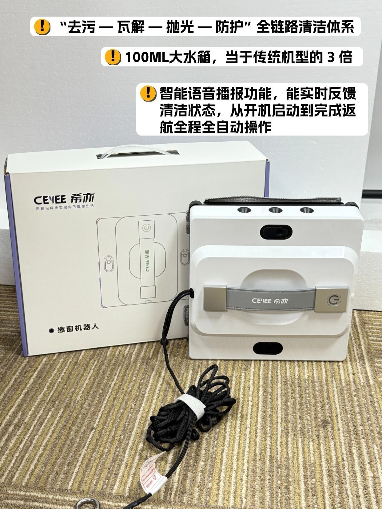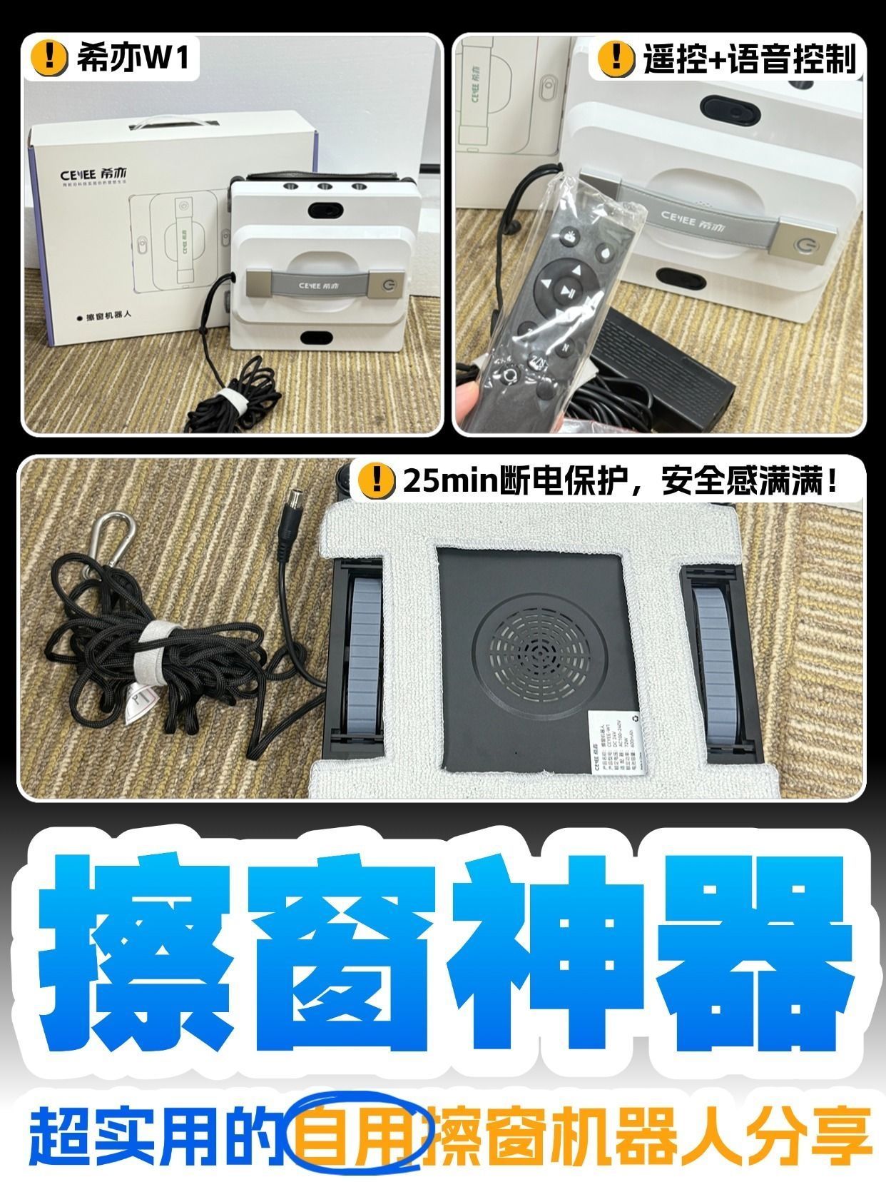 我住23楼带6米大落地窗是真的爽,阳光洒进来整个客厅都暖洋洋的,但擦玻璃的时候直接原地崩溃😭 以前要么花300块请保洁,要么自己踩凳子扒着栏杆战战兢兢擦,外层玻璃根本够不着,擦完还全是水痕,风一吹全是灰印子。直到入了希亦W1,才知道擦窗居然能这么轻松! 先说最让我安心的安全性!毕竟高空作业真的怕出事。它那个“1+2负压吸附”不是吹的,往玻璃上一放就牢牢吸住,我试着拽了一下纹丝不动。而且自带4.5米...