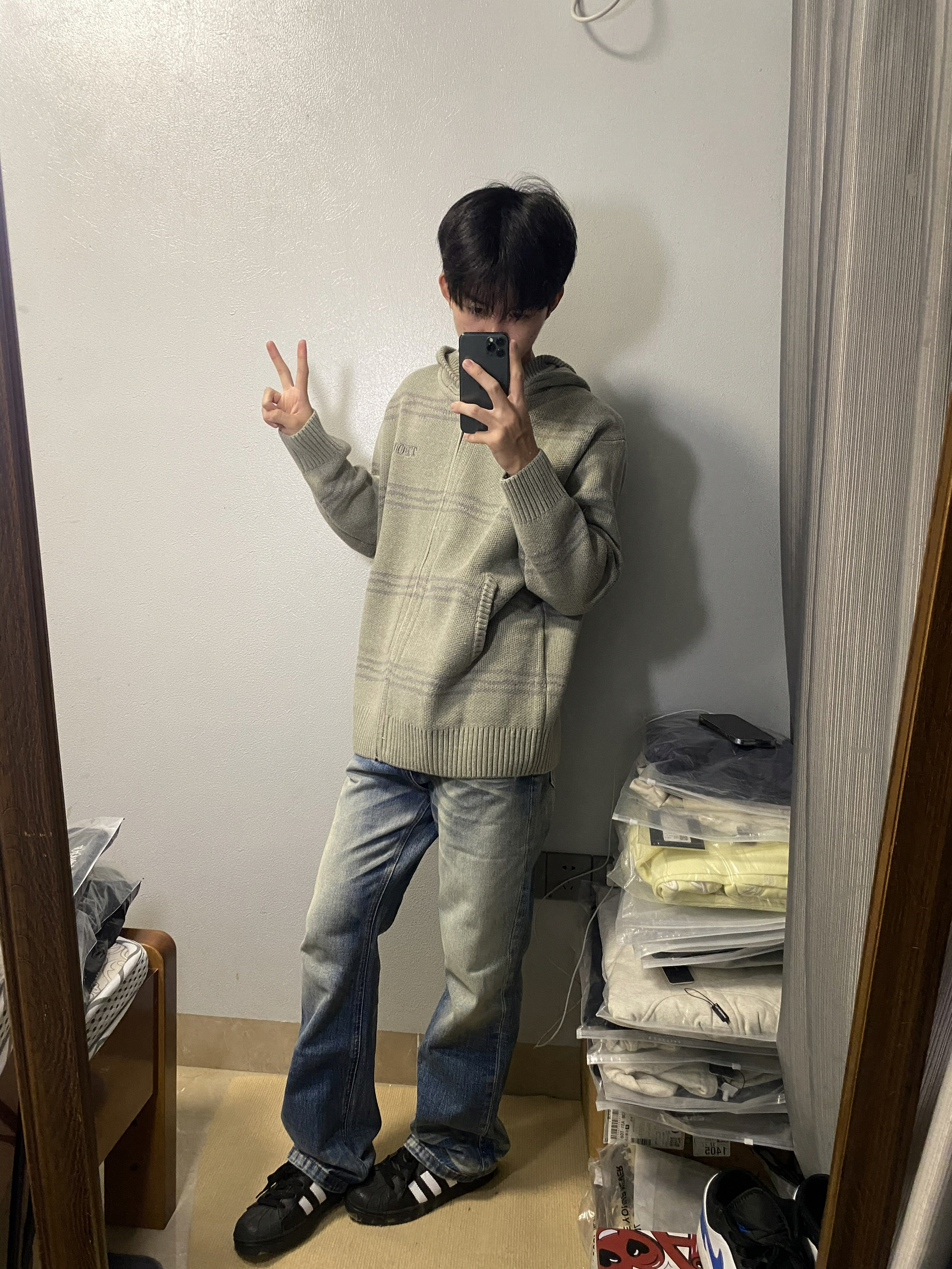 Hello👏👏今日份穿搭分享来啦😎 上身一款开衫外套~ 格纹的设计 拉链款的 穿脱会比较方便✨ 连帽设计 秋冬出门比较防风 搭配了一款水洗蓝牛仔裤🤩 水洗做旧设计 复古风拉满啦‼️ 秋冬出门我就穿这套啦~~