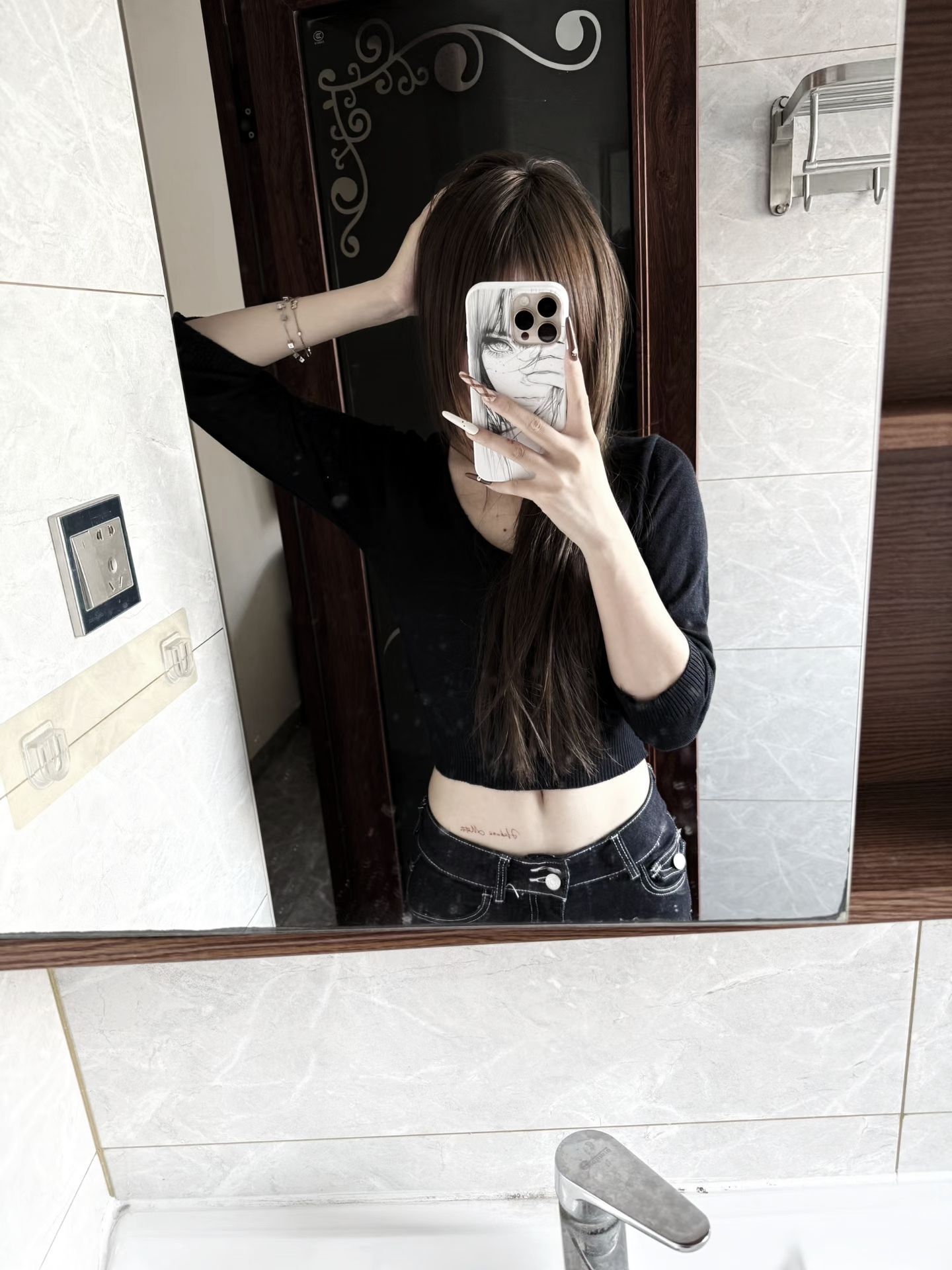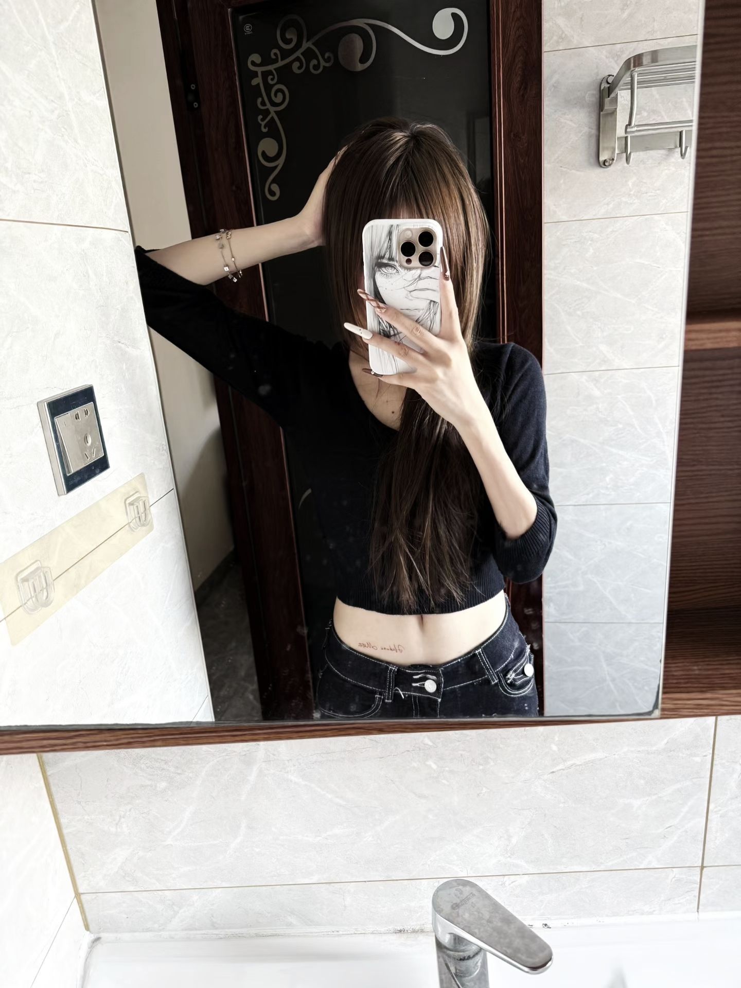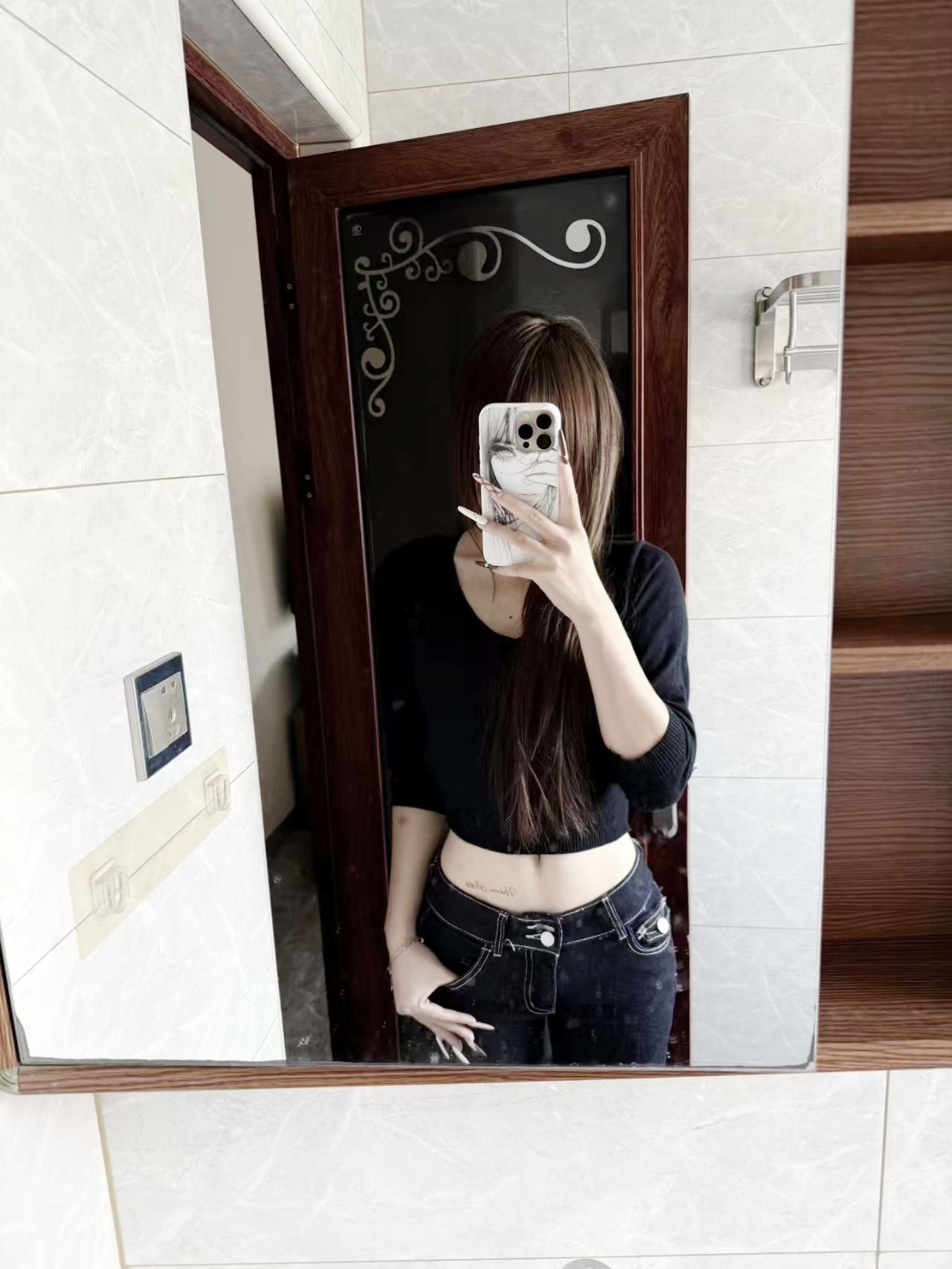1. 上衣适配性强:黑色短款针织衫简约百搭,V领设计修饰颈部线条,露腰版型既能凸显腰线、优化身材比例,又自带随性的轻熟感。 2. 下装搭配:深色牛仔裤和上衣色调统一,紧身款能贴合腿型,双纽扣设计增加了细节亮点,和短上衣搭配后整体利落又显身材。 3. 整体氛围适配度高:简约的黑灰配色日常又耐看,不管是出街还是休闲场合都很合适,同时能通过小露腰营造出不经意的时尚感。