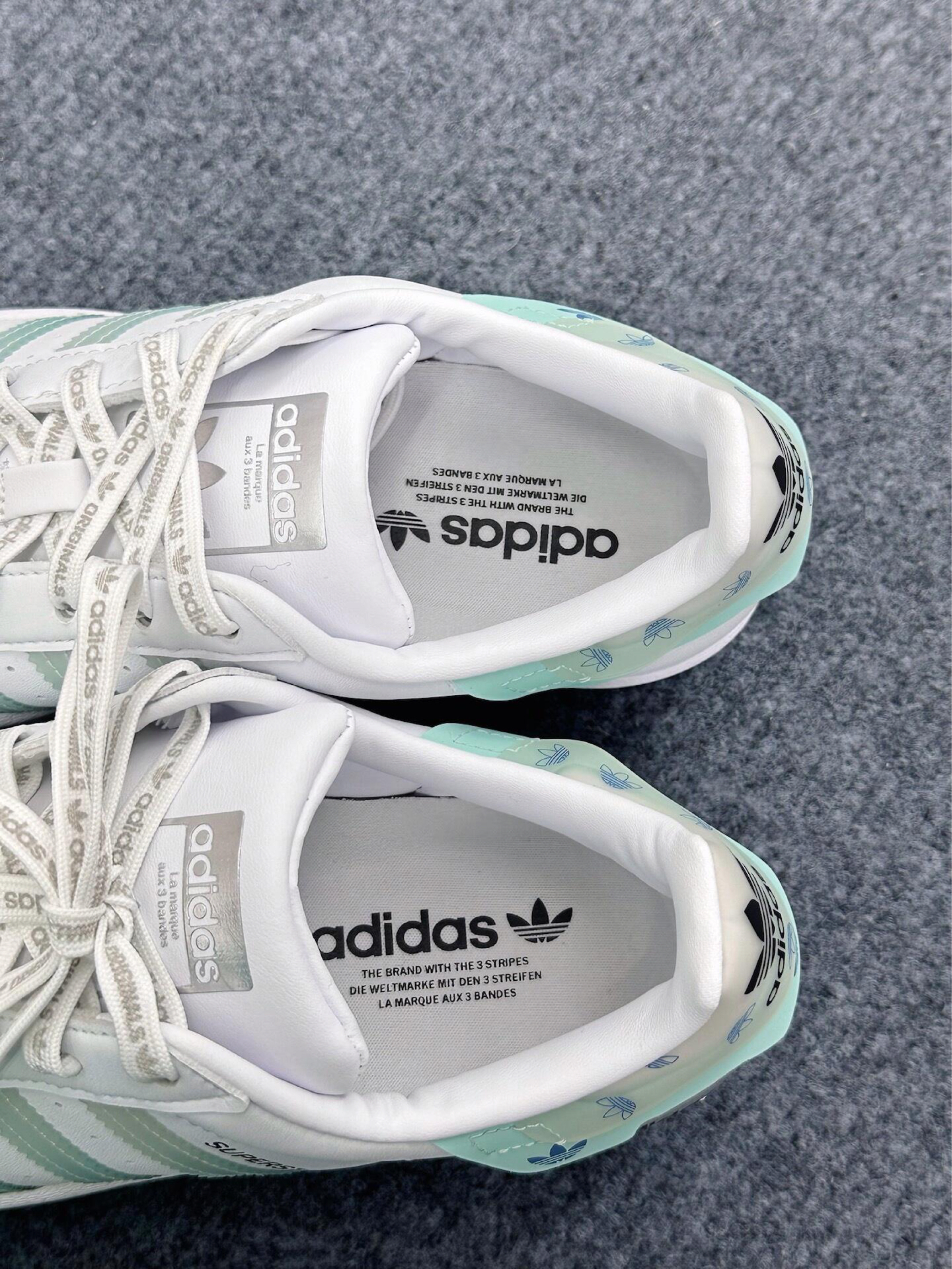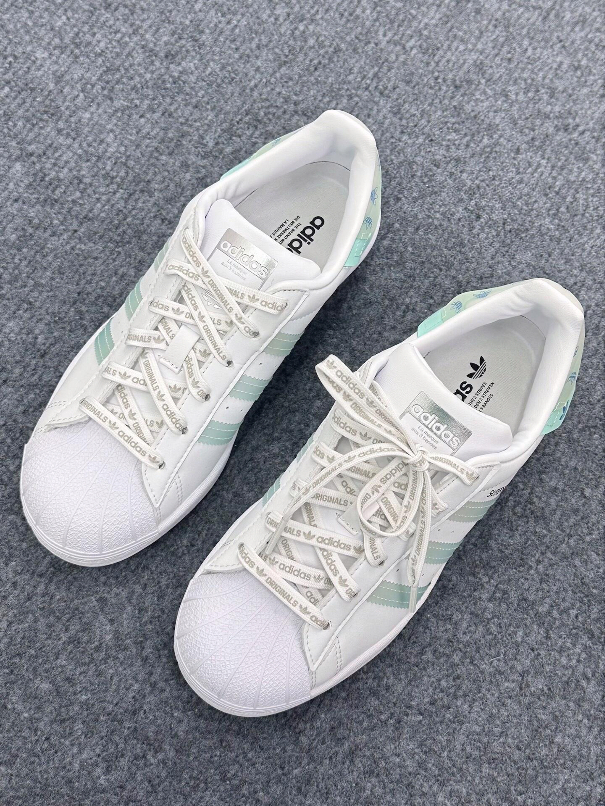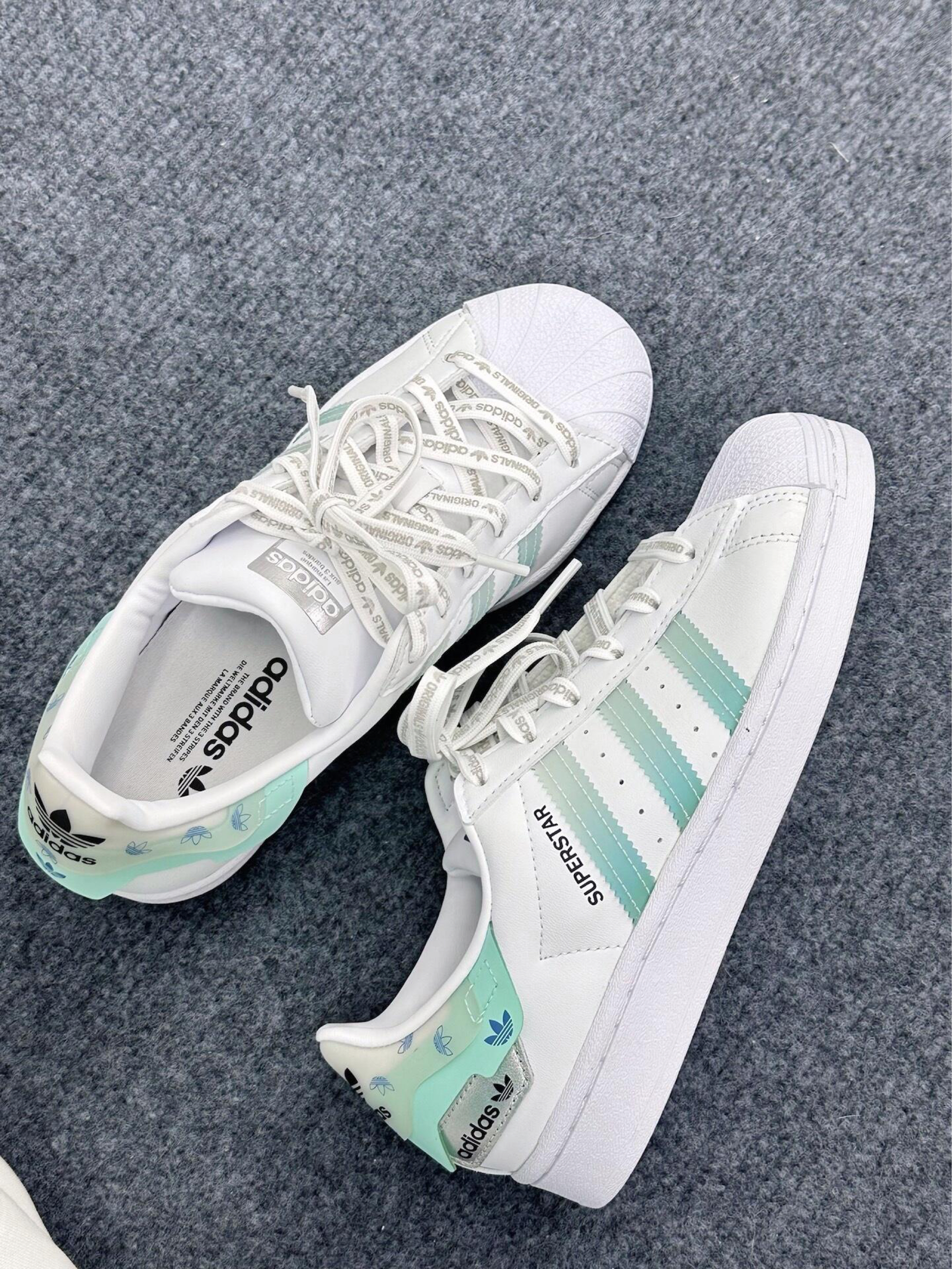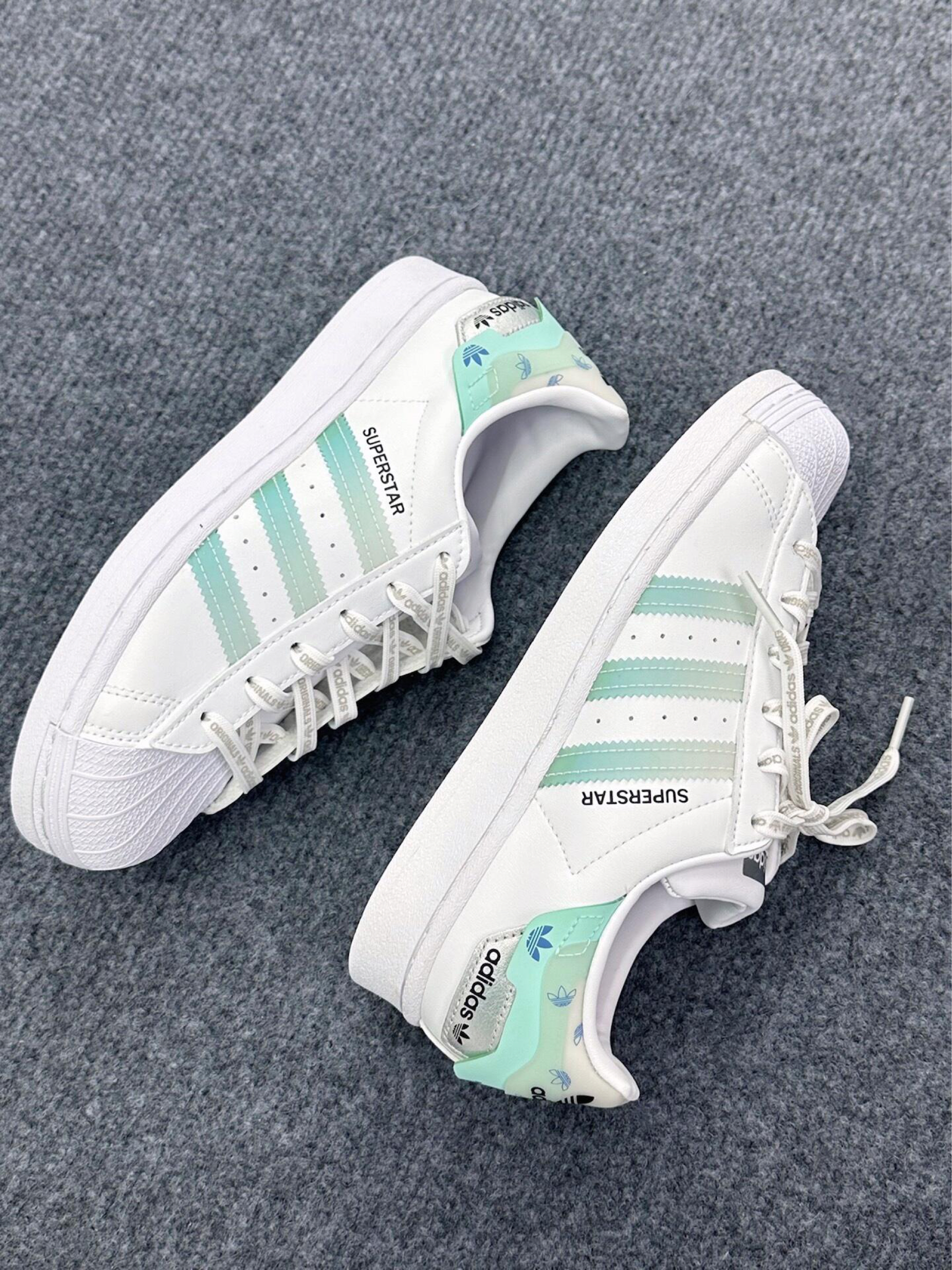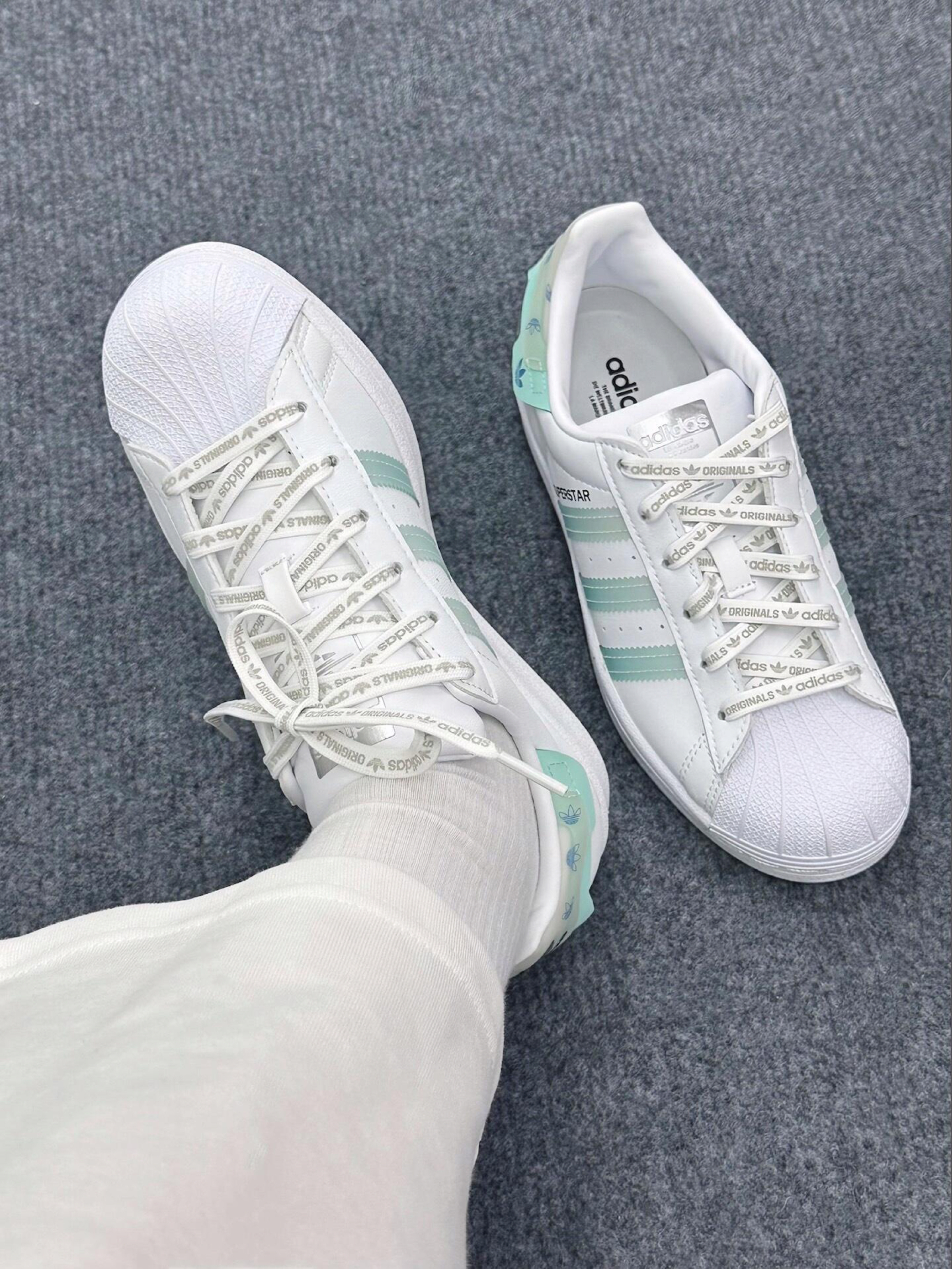 这双Adidas Superstar“薄荷渐变”款,把经典玩出了春日新意。 • 薄荷绿渐变三道杠+后跟透明蝴蝶细节,让复古贝壳头多了份清新灵动,专属印花鞋带更是细节控狂喜。 • 搭牛仔、裙装都很绝,日常出街或校园通勤,一脚蹬上就有松弛感。 • 经典款的创意改款,清新党和复古风爱好者都能冲~
