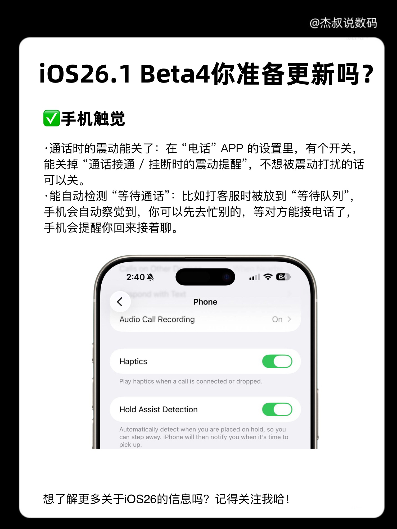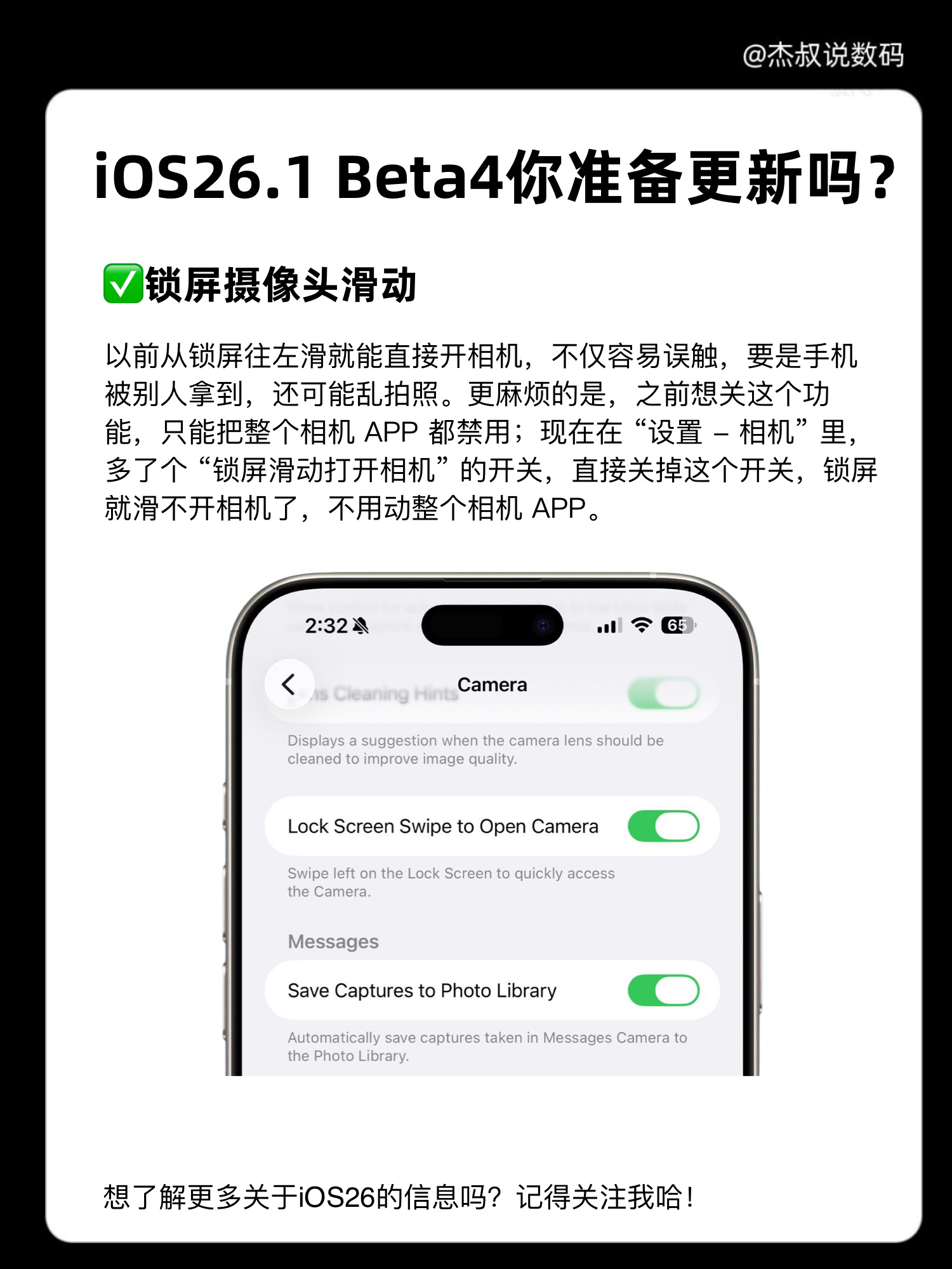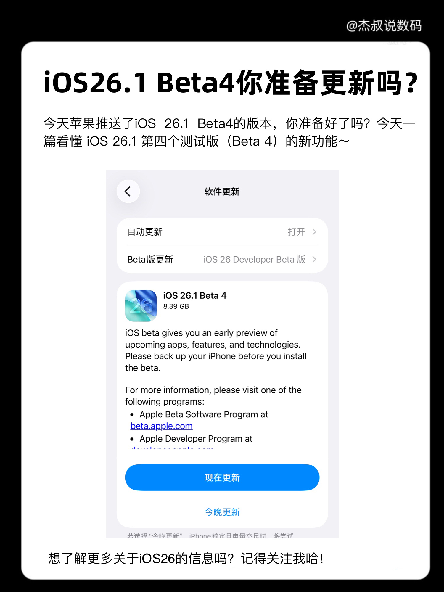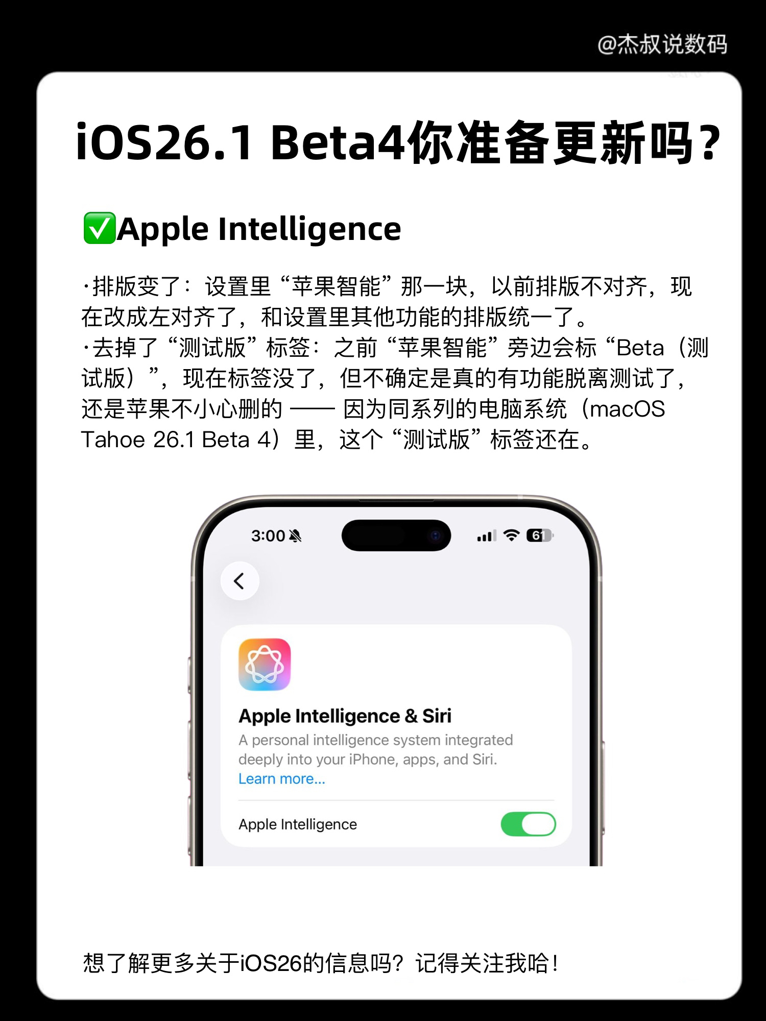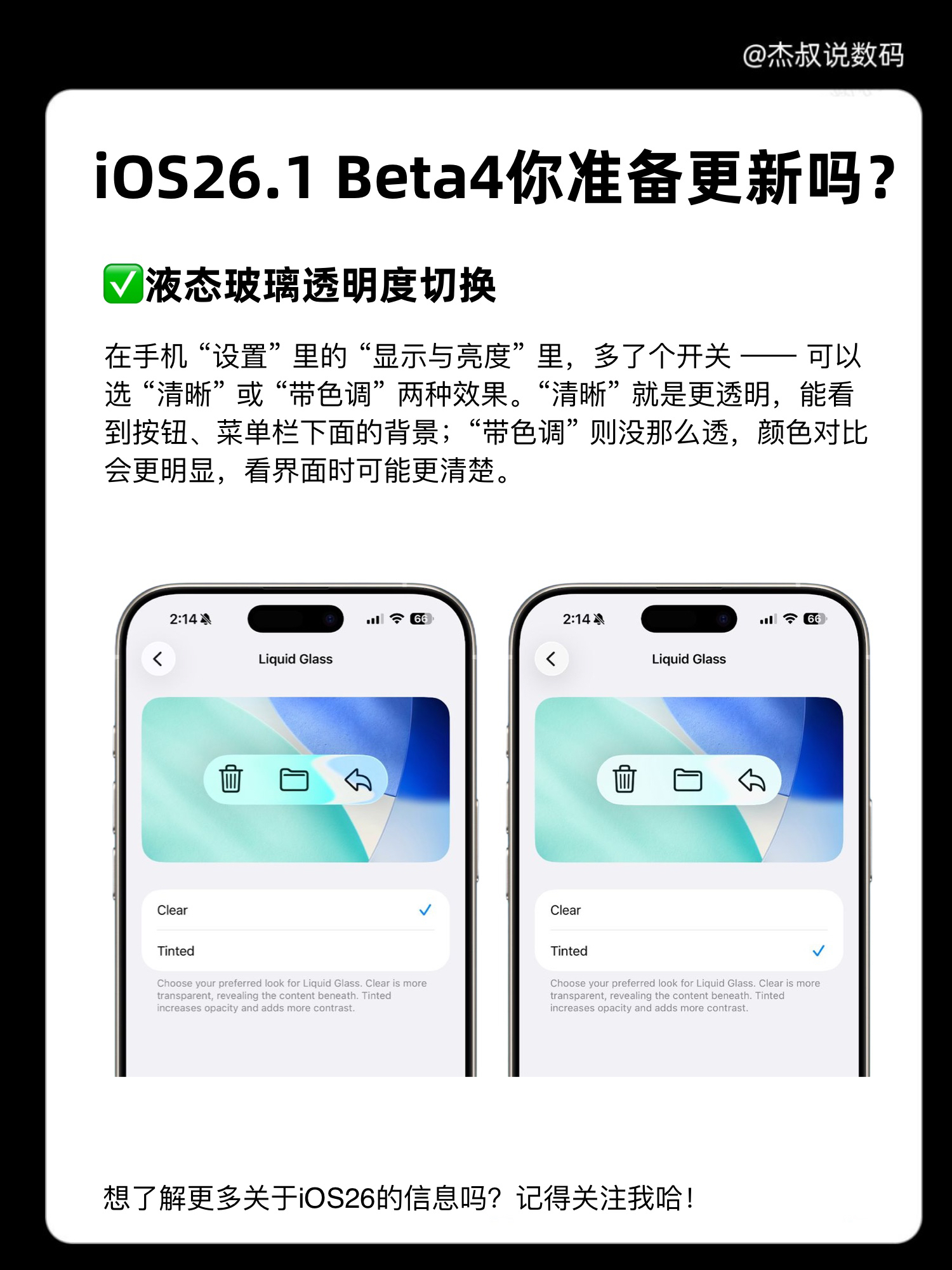 【一篇看懂iOS26.1 Beta4来了❗️你会更新吗❓】,由用户 杰叔说数码 分享,来自江苏。这是一篇来自识货社区的真实用户分享笔记。